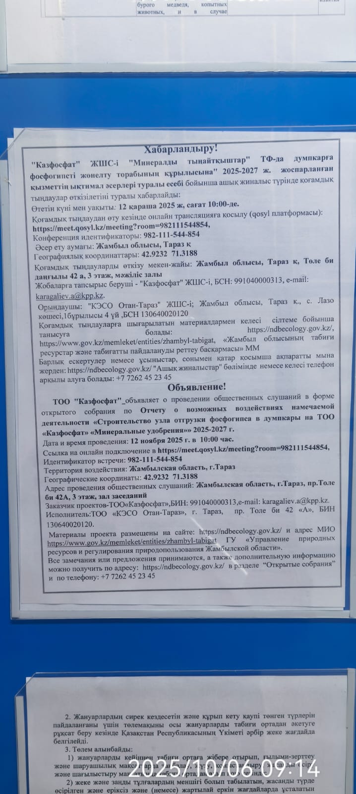 1.4. Описание для подключения к онлайн трансляции при прохождении общественного слушания: Приглашение на запланированную встречу в Qosyl Тема встречи: Товарищество с ограниченной ответственностью "КАЗФОСФАТ" Время встречи: 12.11.2025 10:00 Длительность встречи: 01 час. Идентификатор встречи: 982-111-544-854 Подключиться к встрече в Qosyl: https://meet.qosyl.kz/meeting?room=982111544854
