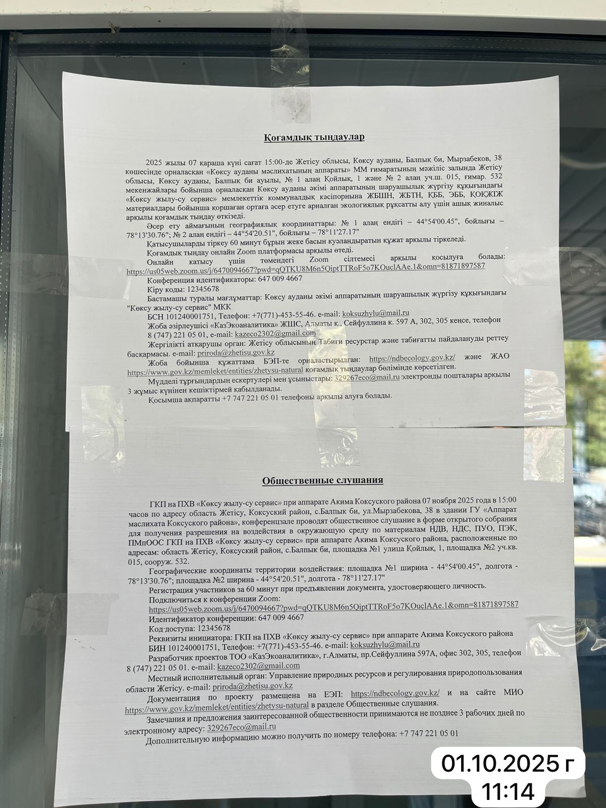 4. Повестка дня общественных слушаний: Проекты НДВ, НДС, ПУО, ПЭК и ПМпООС были разработаны для получения разрешения на эмиссии в окружающую среду, в связи реорганизацией ГКП на ПХВ «Көксу таза су» путем присоединения к ГКП на ПХВ «Көксужылу» и переименованием в ГКП на ПХВ «Көксу жылу-су сервис» при аппарате Акима Коксуского района. Вид деятельности предприятия: - Передача и распределение тепловой энергии. - Забор, обработка и распределение воды. - Эксплуатация сетей и сооружений систем водоотведения (канализации). Согласно Актов на право постоянного землепользования на земельные участки, рассматриваемый объект размещен на следующих земельных участках под кадастровыми номерами: - 03-261-005-826, для обслуживания центральной котельной, 0,8230 га; - 03-261-015-503, для обслуживания очистного сооружения, 0,7 га. В состав ГКП на ПХВ «Көксу жылу-су сервис» входят 2 промышленные площадки (объекты): 1) Площадка № 1 (Көксужылу). Это котельная, предназначенная для отопления многоквартирных жилых домов, административных зданий и коммунально-бытовых объектов с. Балпык би. Адрес расположения: Область Жетісу, Коксуский район, с.Балпык би, Койлык, 1. 2) Площадка № 2 (Көксу таза су) - осуществляет забор, обработку и распределение питьевой воды для населения Балпыкского сельского округа, а также обеспечивает эксплуатацию канализационных сетей и сооружений с.Балпык би. Адрес расположения: Область Жетісу, Коксуский район, с.Балпык би, уч.кв. 015, сооруж. 532 Подключиться к конференции Zoom https://us05web.zoom.us/j/6470094667?pwd=qQTKU8M6n5QiptTTRoF5o7KOuclAAe.1&omn=81871897587 Идентификатор конференции: 647 009 4667 Код доступа: 12345678