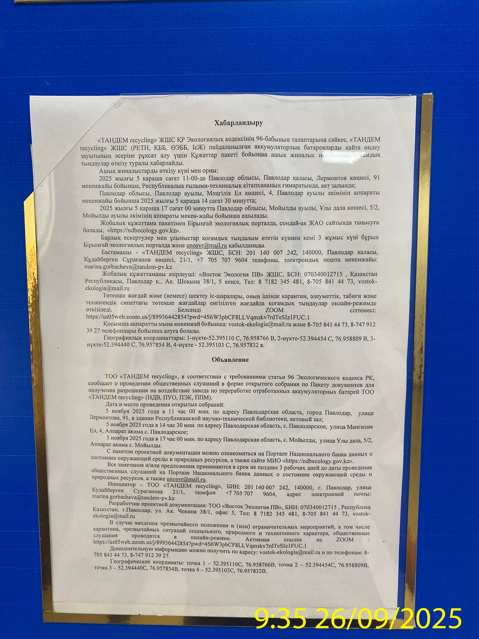 3. Общественные слушания организованны: УПРАВЛЕНИЕ НЕДРОПОЛЬЗОВАНИЯ, ОКРУЖАЮЩЕЙ СРЕДЫ И ВОДНЫХ РЕСУРСОВ ПАВЛОДАРСКОЙ ОБЛАСТИ, unosvr@mail.ru, 87182321681,