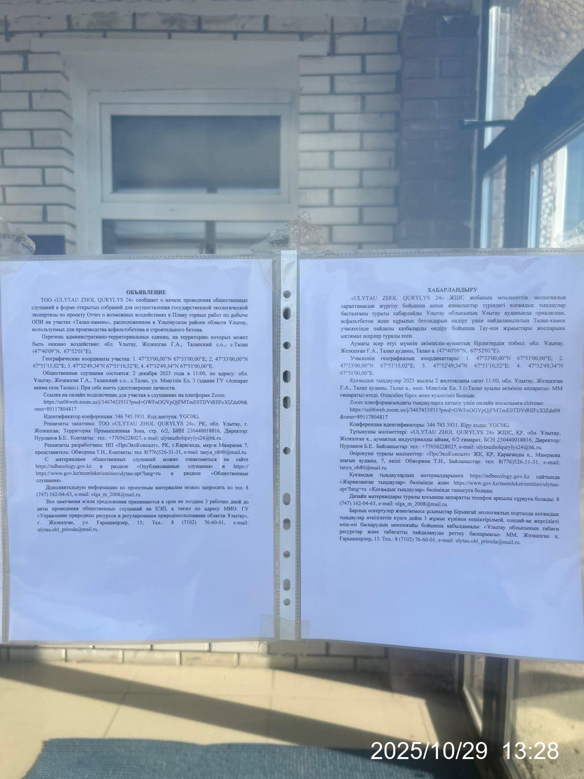 3. Общественные слушания организованны: Главный специалист УПР и ПР область Ұлытау, ulytau.obl_priroda@mail.ru,