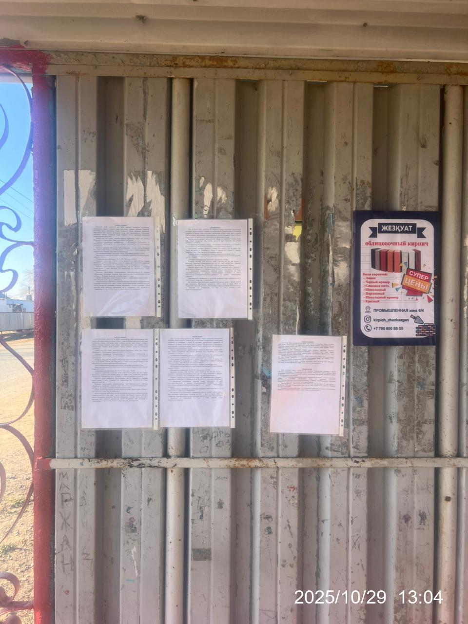 6.3. расположение мест, специально предназначенных для Размещения печатных объявлений (доски объявлений): 1. Доска объявлений возле Акимата; 2. Доска объявлений в общественном месте.