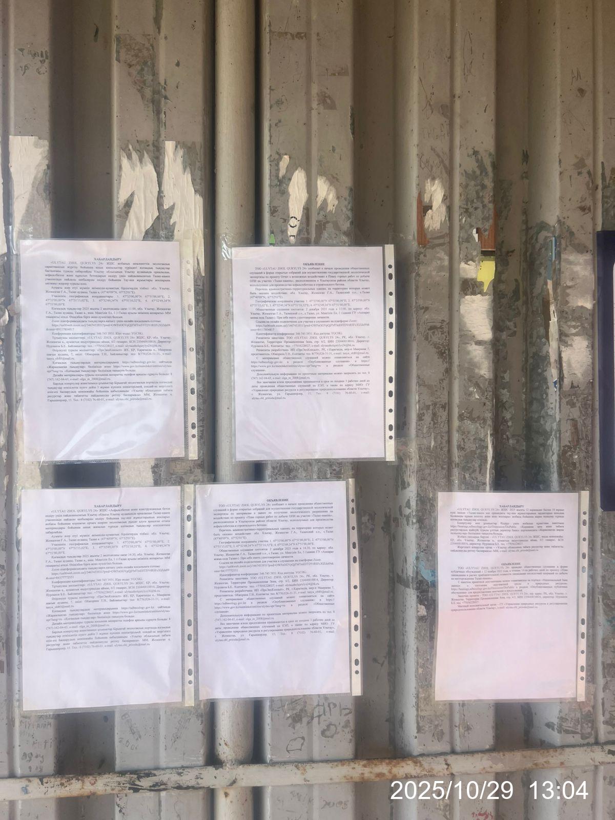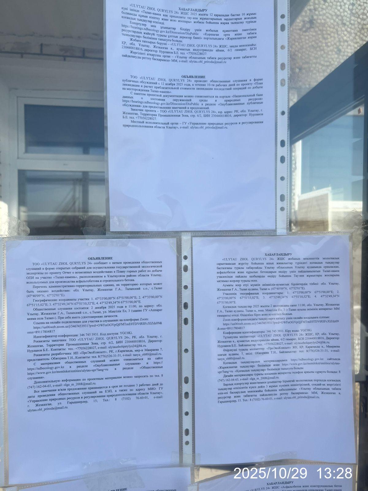 1.4. Описание для подключения к онлайн трансляции при прохождении общественного слушания: в соответствии с пп.4, п.11 прил. 3 Правил, информация о проведении общественных слушаний должна быть распространена на государственном и русском языках на досках объявлений местных исполнительных органов административно-территориальных единиц и в местах, специально предназначенных для размещения объявлений. В связи с чем необходимо дополнительно разместить печатные объявления на досках объявлений в акимате и в местах, специально предназначенных для размещения объявлений.
