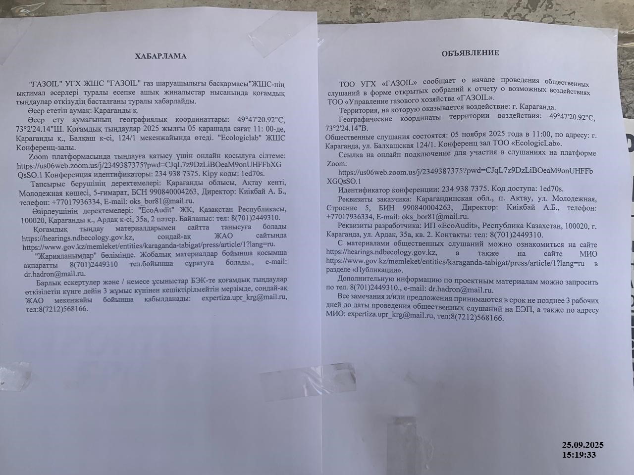 3. Общественные слушания организованны: Управление природных ресурсов и регулирования природопользования Карагандинской области, expertiza.upr_krg@mail.ru,