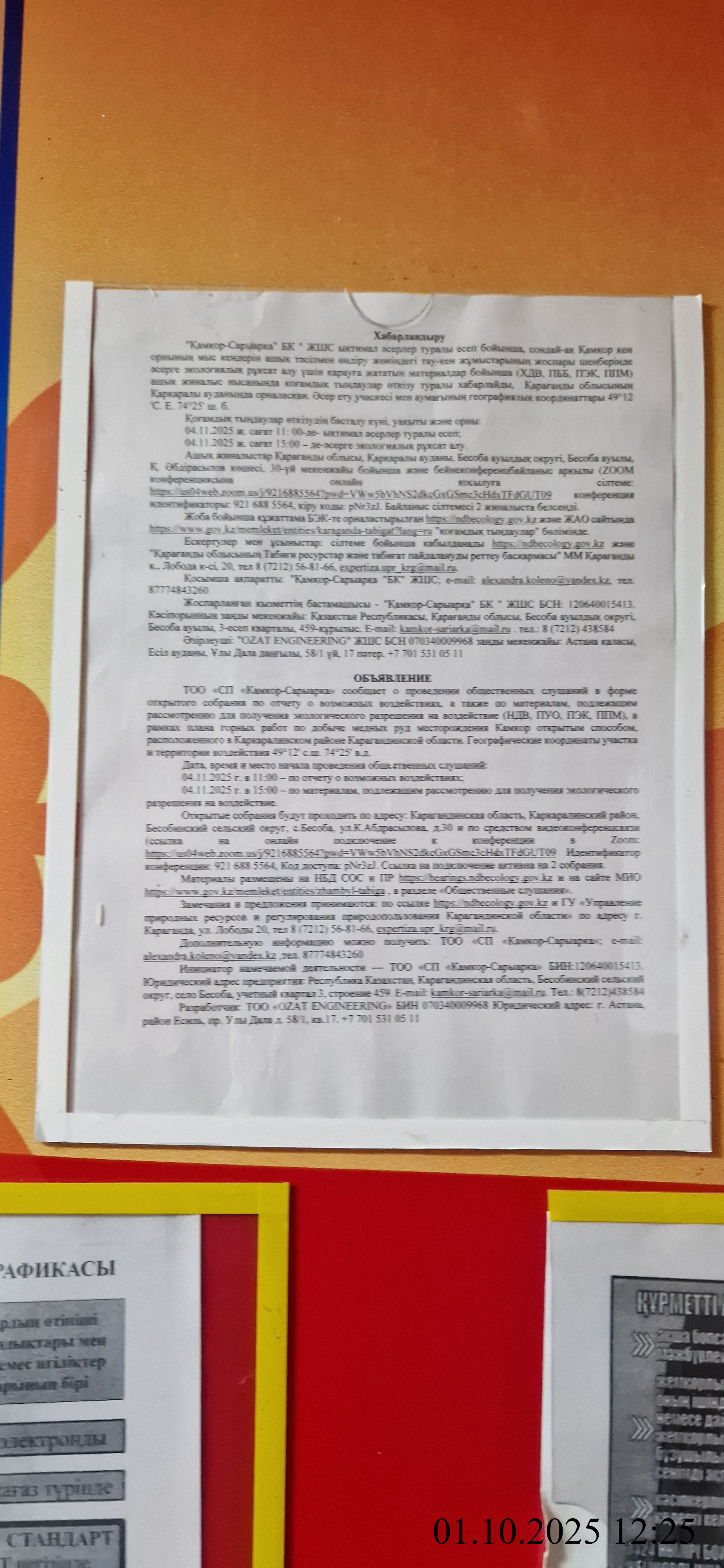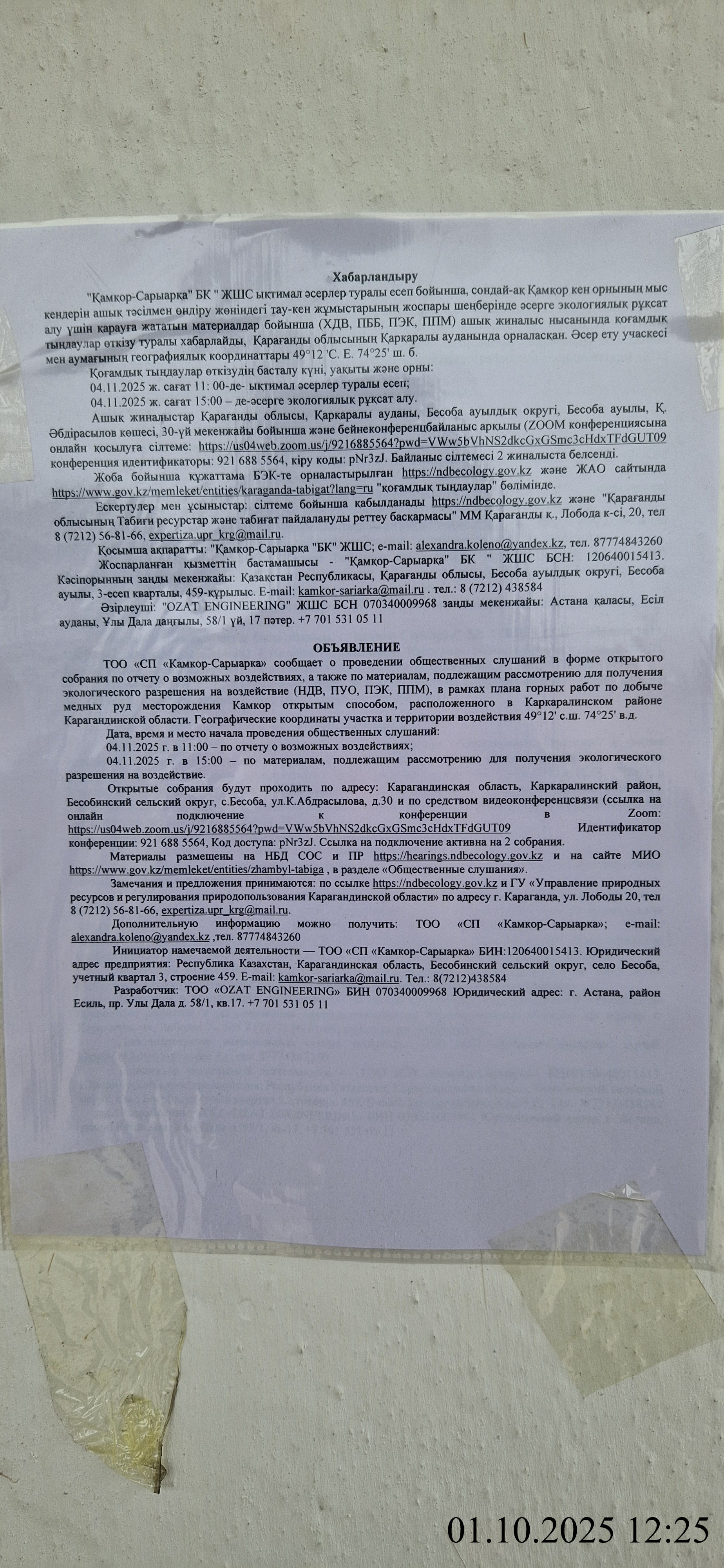 3. Общественные слушания организованны: Управление природных ресурсов и регулирования природопользования Карагандинской области, expertiza.upr_krg@mail.ru,