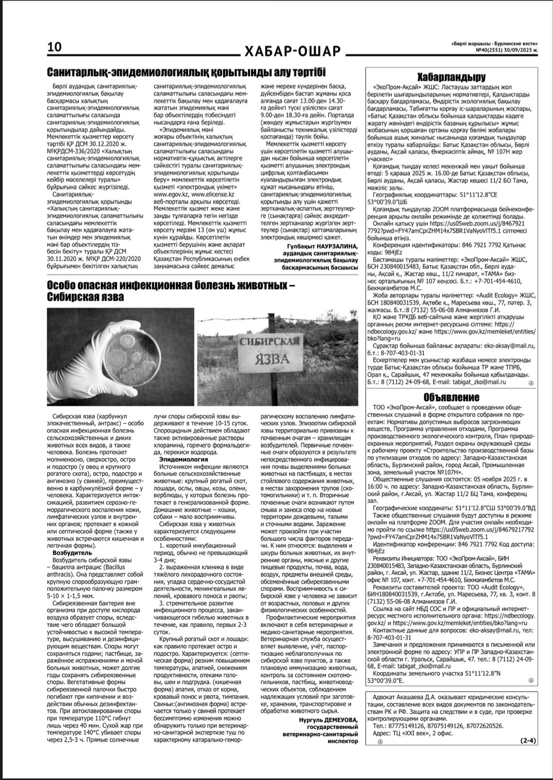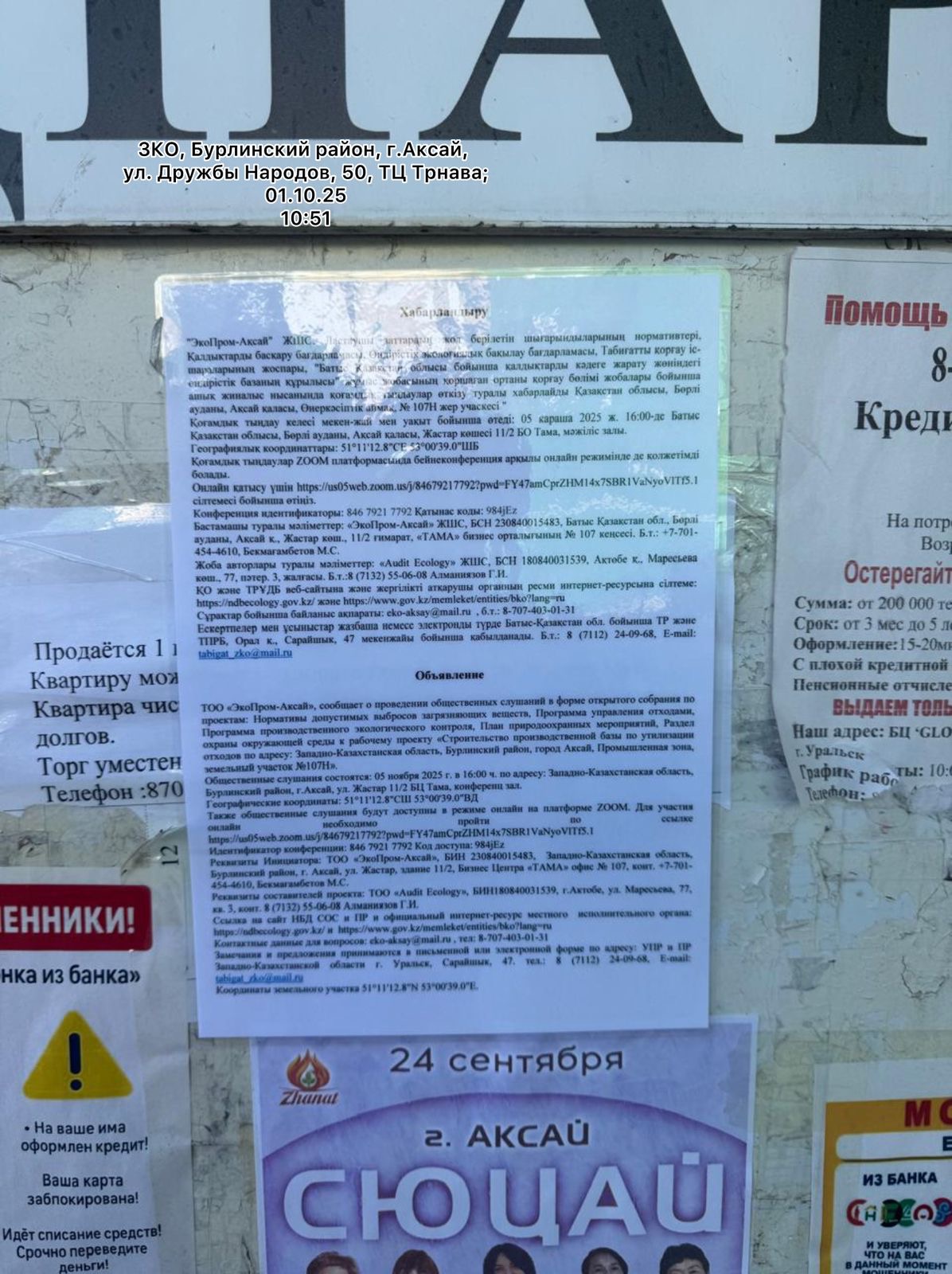 По проекту: Общественные слушания в форме открытого собрания по проектам: Нормативы допустимых выбросов загрязняющих веществ, Программа управления отходами, Программа производственного экологического контроля, План природоохранных мероприятий, Раздел охраны окружающей среды к рабочему проекту ««Строительство производственной базы по утилизации отходов по адресу: Западно-Казахстанская область, Бурлинский район, город Аксай, Промышленная зона, земельный участок №107Н».