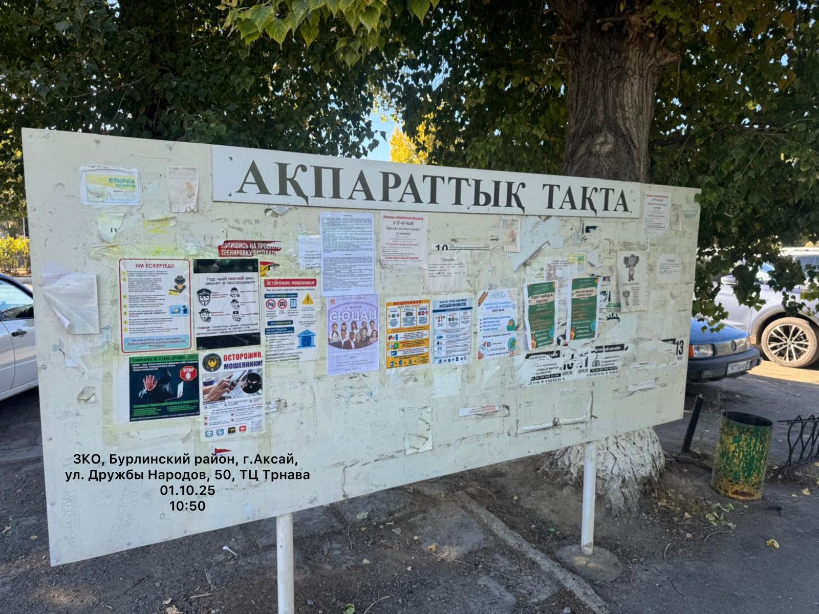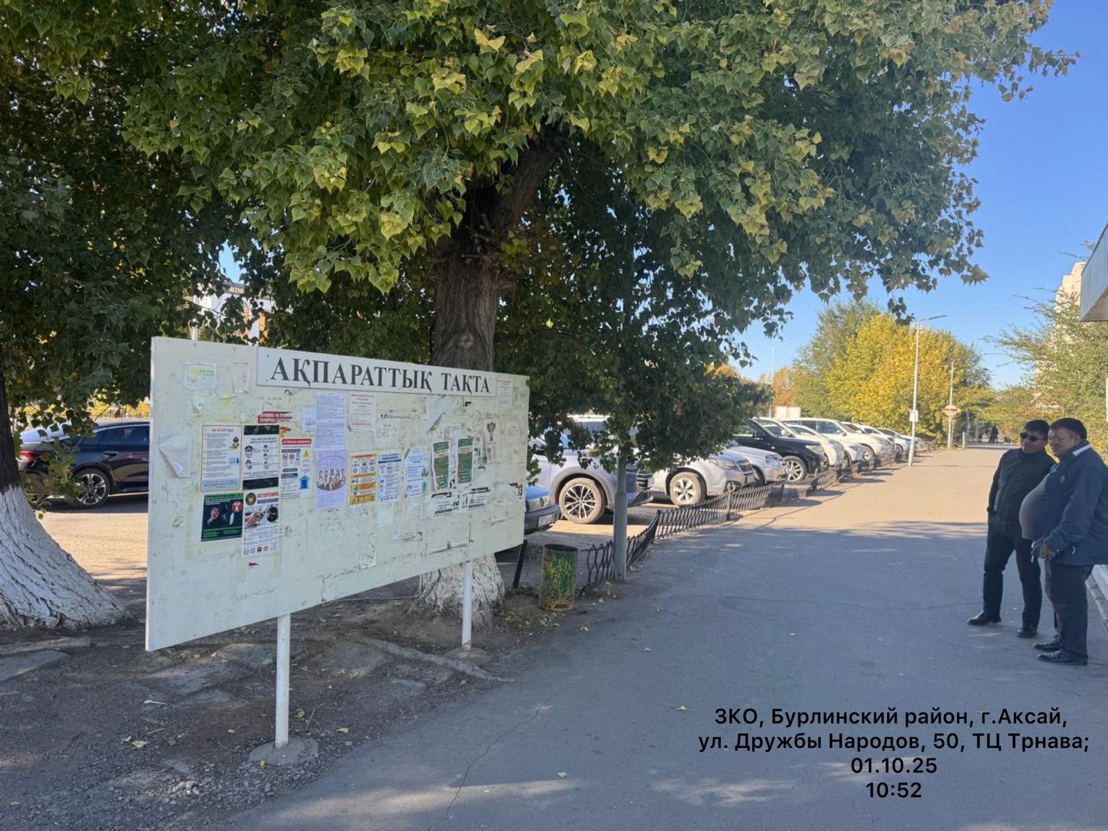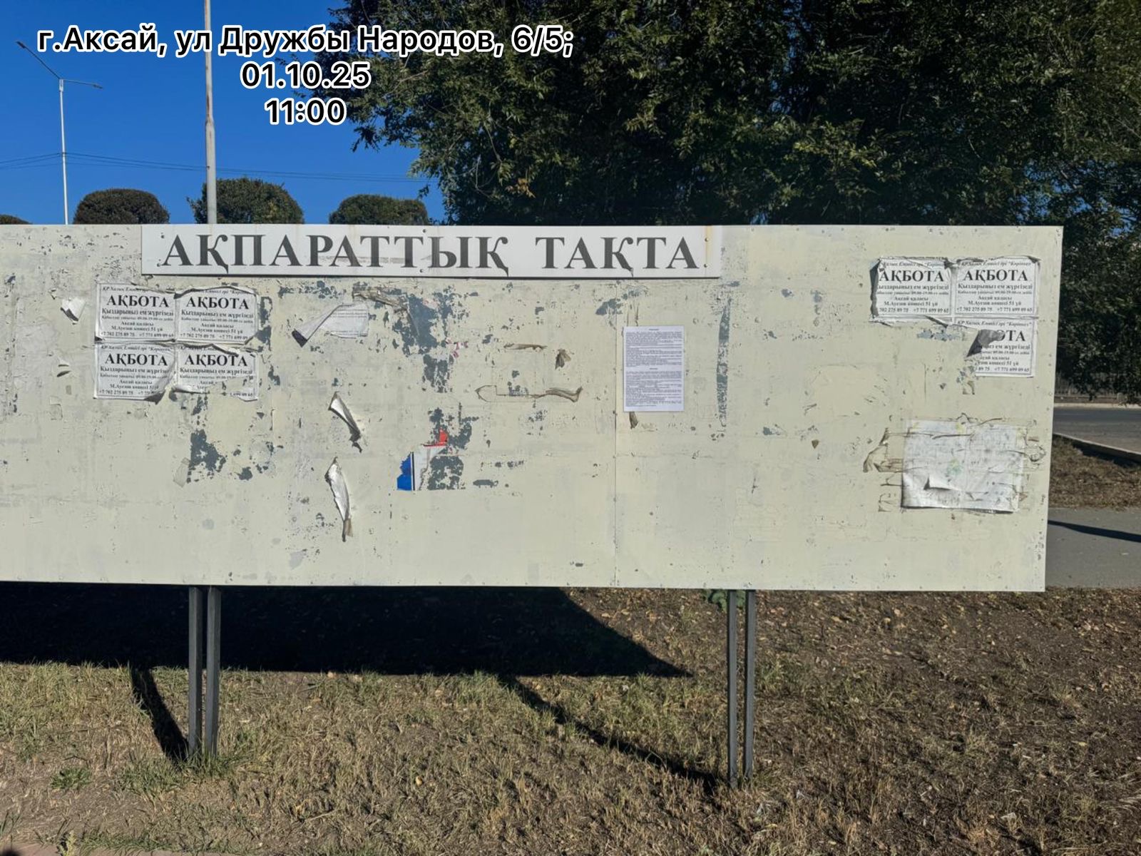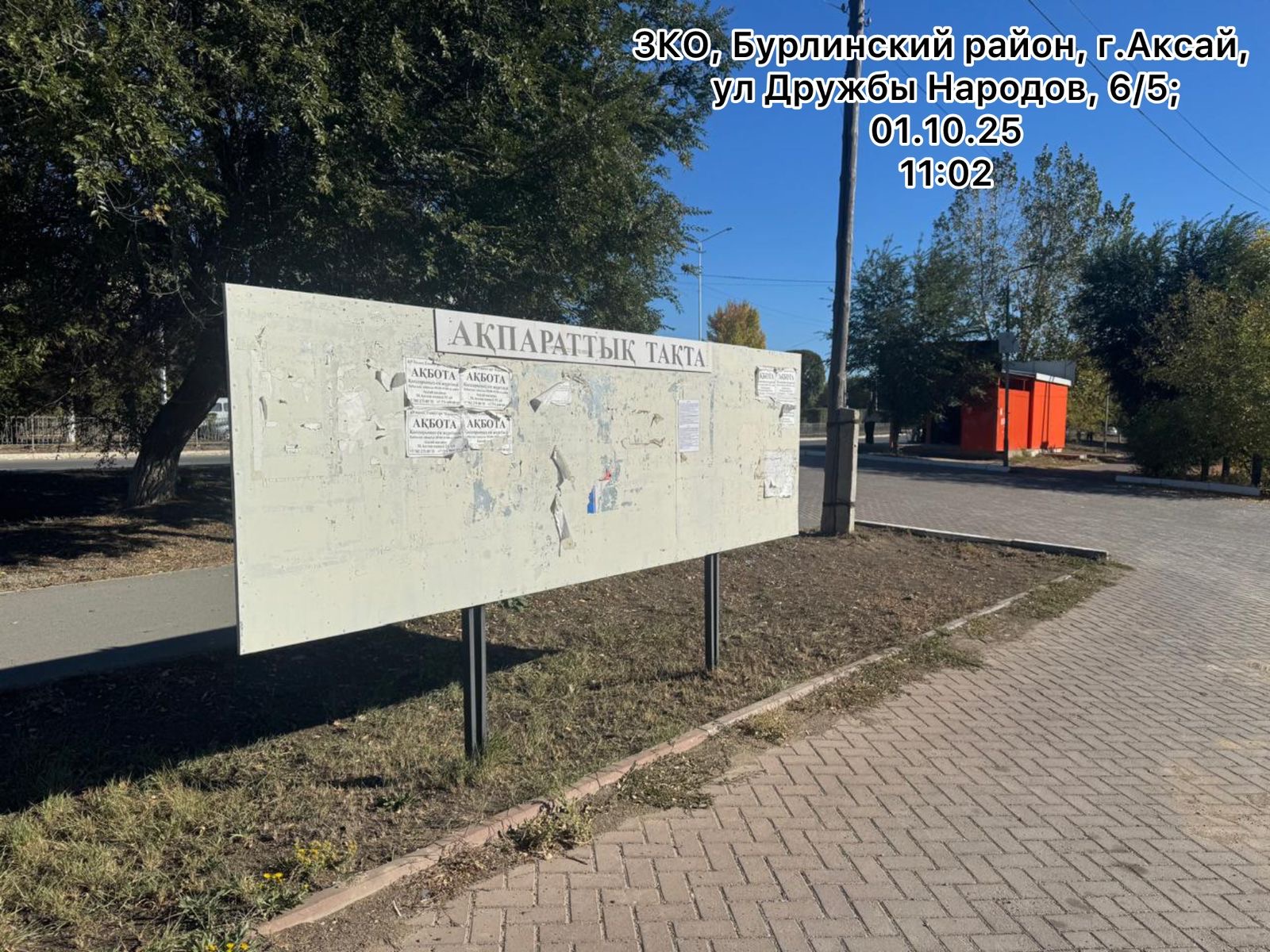 6.3. расположение мест, специально предназначенных для Размещения печатных объявлений (доски объявлений): ЗКО, Бурлинский район, г.Аксай, ул. Дружбы Народов, 50, ТЦ Трнава; г.Аксай, ул Дружбы Народов, 6/5;