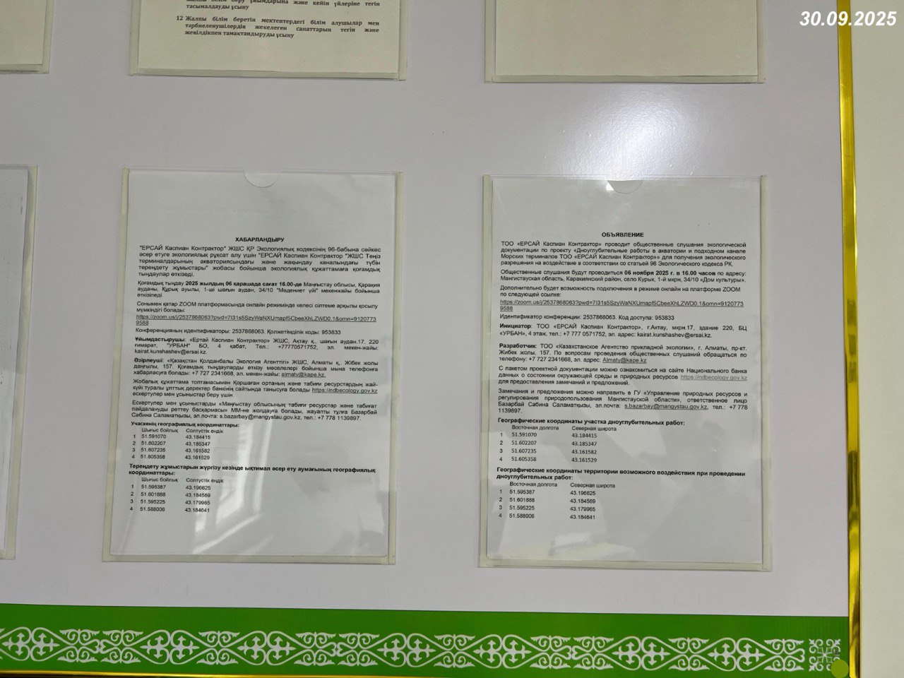 3. Общественные слушания организованны: Управление природных ресурсов и регулирования природопользования Мангистауской области, s.bazarbay@mangystau.gov.kz,