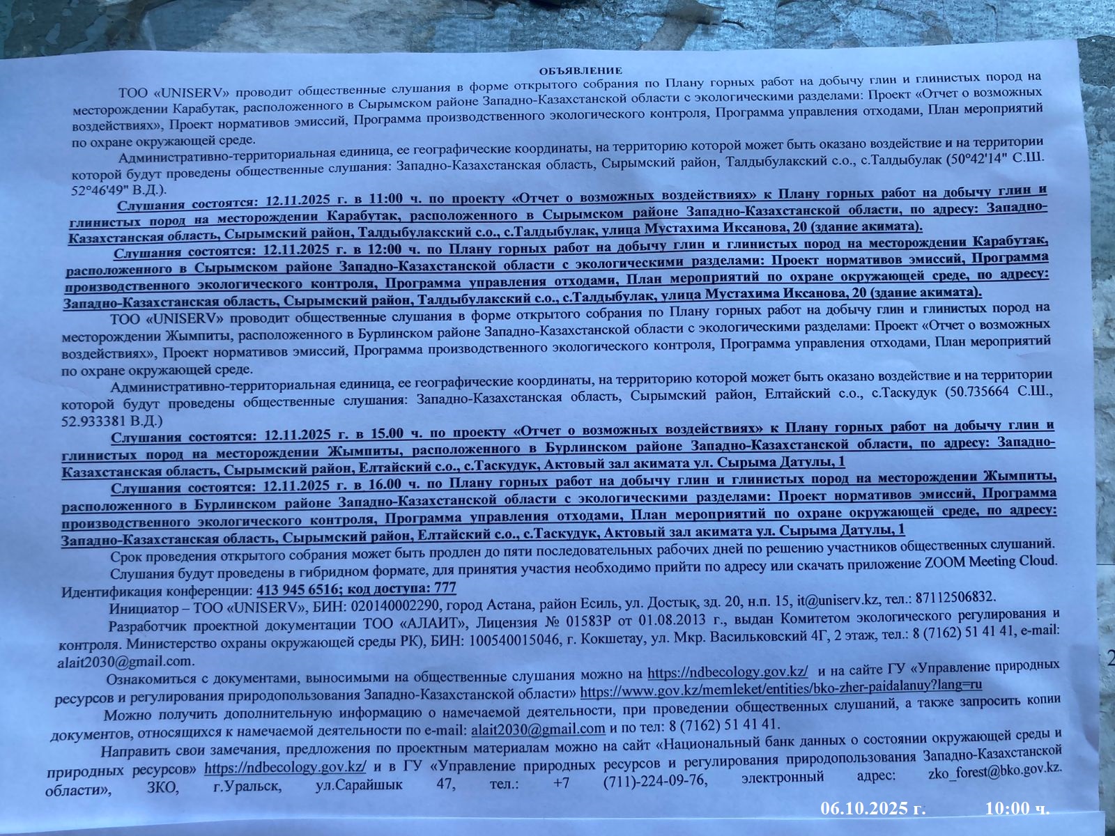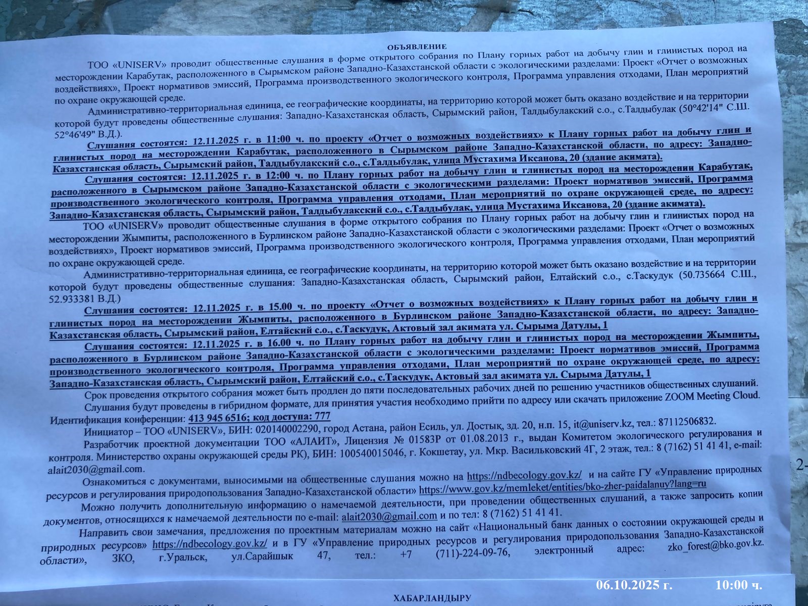 4. Повестка дня общественных слушаний: План горных работ на добычу глин и глинистых пород на месторождении Жымпиты, расположенного в Бурлинском районе Западно-Казахстанской области выполнен по заданию на проектирование ТОО «UNISERV». Глины и глинистые породы с месторождения будут использоваться при реконструкции автомобильной дороги Бурлин-Аксай-Жымпиты 68-139 км. Месторождение было разведано в 2025г в пределах географических координат, указанных в Разрешении на разведку №32 от 15.08.2025 года. В результате выполненных геологоразведочных работ, было разведано и выявлено месторождение глин и глинистых пород Жымпиты. Доказанные запасы глин и глинистых пород подсчитаны в количестве 92,0 тыс.м3. В административном отношении участок Жымпиты расположено на территории Бурлинского района Западно-Казахстанской области. Административный центр – город Аксай. - ближайший населённый пункт – село Таскудук, расположенное в 5,0км северо-восточнее участка; - ближайший водный объект – река Есен Анкаты, протекающая в 3,0км северо-западнее участка. Район месторождения относится к территории с развитой инфраструктурой. В непосредственной близости от месторождения к югу проходит автомобильная дорога. Ведущее место в экономике района занимает нефтедобывающая отрасль, промышленное производство и сельское хозяйство зернового и молочно-животноводческого направления. Снабжение электроэнергией будущего карьера не требуется, работы сезонные, будут проводиться в светлое время суток. Доставка на карьер горюче-смазочных материалов, запасных частей и других грузов хозяйственного назначения предусматривается с базы недропользователя. На площади участка разработки здания и сооружения отсутствуют. Район работ обжит и довольно густонаселен. Население района составляет около 55,0-60,0тыс. человек. Национальности: казахи - 70,90%, русские - 19,09%, украинцы - 5,33%, татары - 1,74%, белорусы - 0,70%, немцы - 0,34%, мордва - 0,29%, башкиры - 0,21%, узбеки - 0,18%, другие - 1,22%. Территория района равна 5,6тыс.км². В районе 15 сельских округов, около 30 сельских населенных пунктов. В дальнейшем при проведении добычных работ имеется возможность привлечение жителей с ближайших населенных пунктов. Срок эксплуатации месторождения составит 2 года. Предусматривается следующий порядок ведения горных работ на карьере: 1. Для осуществления последующих рекультивационных работ почвенно-растительный слой будет складироваться во временные отвалы (бурты). 2. Выемка и погрузка полезного ископаемого в забоях. 3. Транспортировка полезного ископаемого на строительство дороги. Для выполнения годовых объемов по приведенному порядку горных работ предусматриваются следующие типы и модели горного и транспортного оборудования: - экскаватор ЭО 3323 А – 1ед; - автосамосвал КАМАЗ 6520 – 5ед; - бульдозер ДЗ-170 – 1ед.