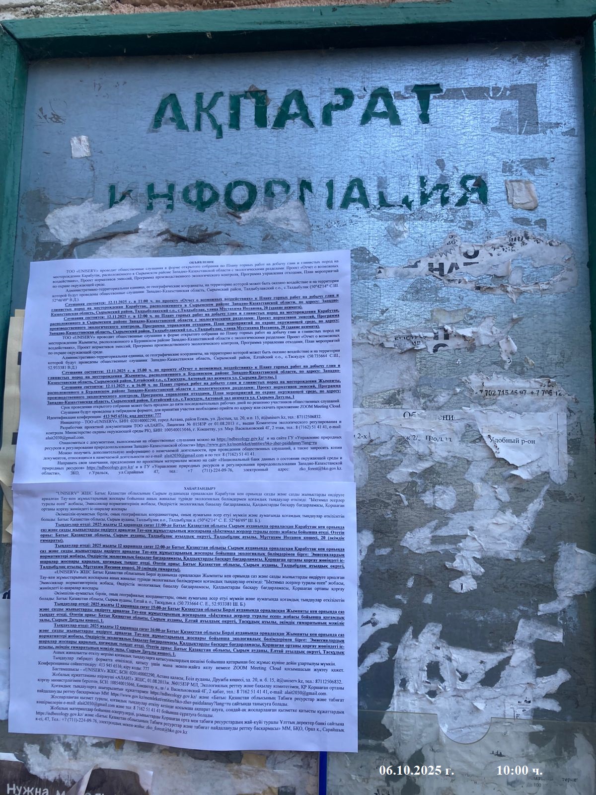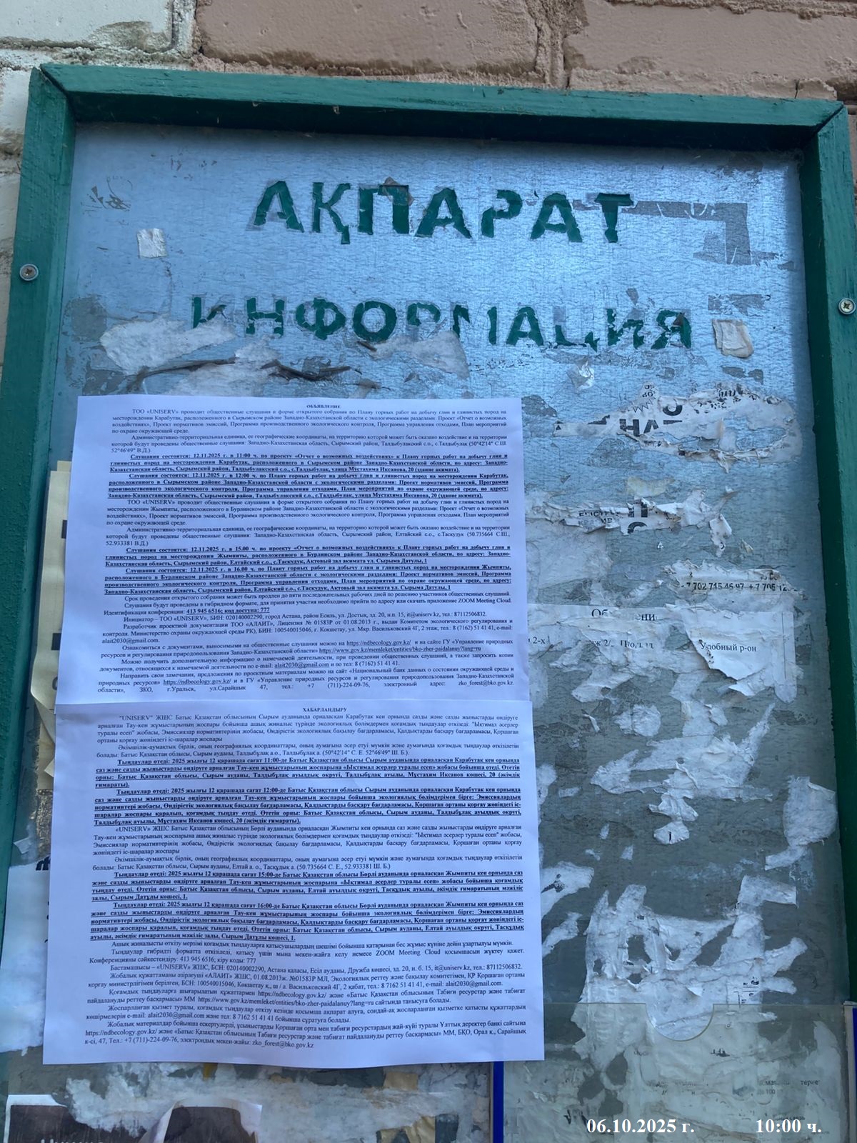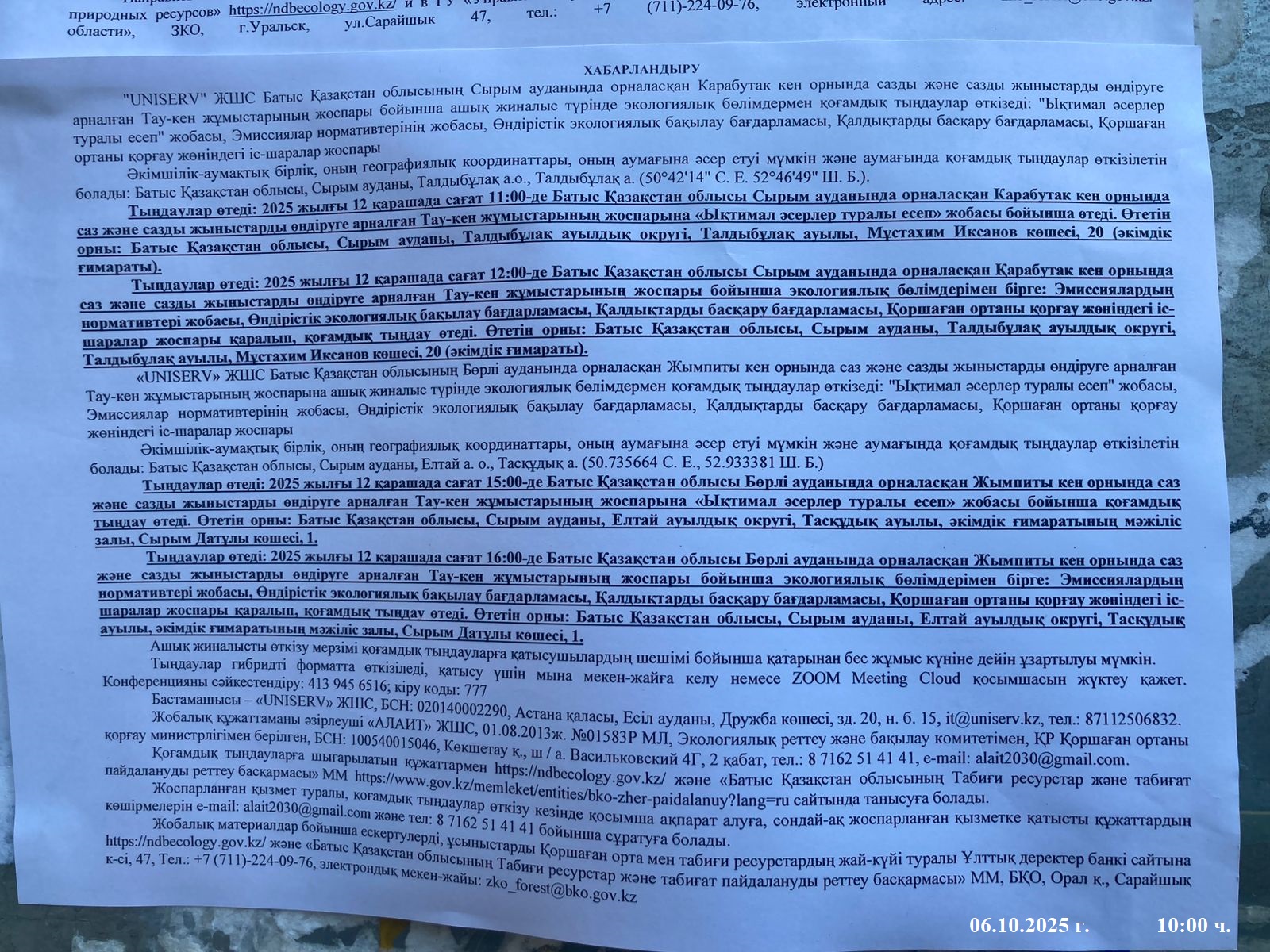 3. Общественные слушания организованны: Управление природных ресурсов и регулирования природопользования Западно-Казахстанской области, zko_forest@bko.gov.kz,