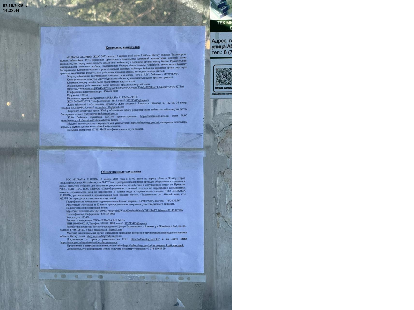1.2. Место проведения: область Жетісу, Талдыкорган Г.А., г.Талдыкорган, ул. Абылай хана, ст-е №357/3 ТОО «EURASIA ALUMIN»