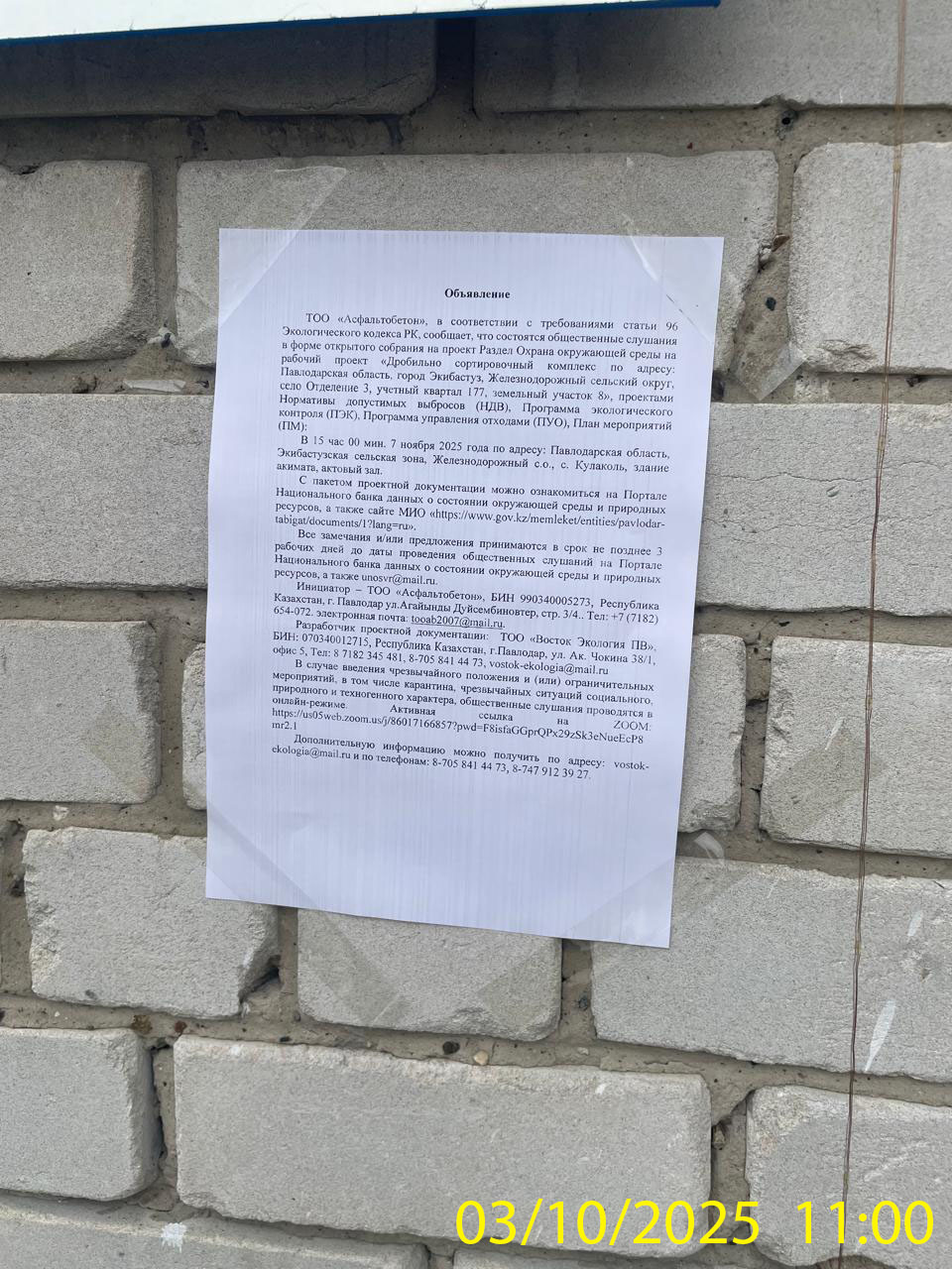 3. Общественные слушания организованны: УПРАВЛЕНИЕ НЕДРОПОЛЬЗОВАНИЯ, ОКРУЖАЮЩЕЙ СРЕДЫ И ВОДНЫХ РЕСУРСОВ ПАВЛОДАРСКОЙ ОБЛАСТИ, unosvr@mail.ru, 87182321681,