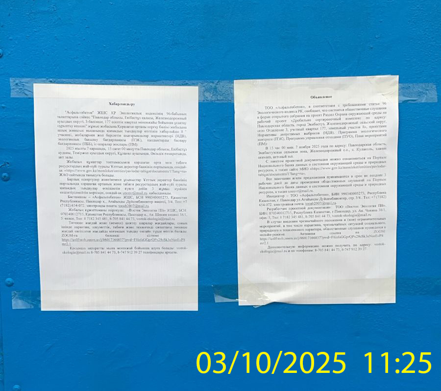 6. Объявление о проведении общественных слушаний на казахском и русском языках будет распространено следующими способами: