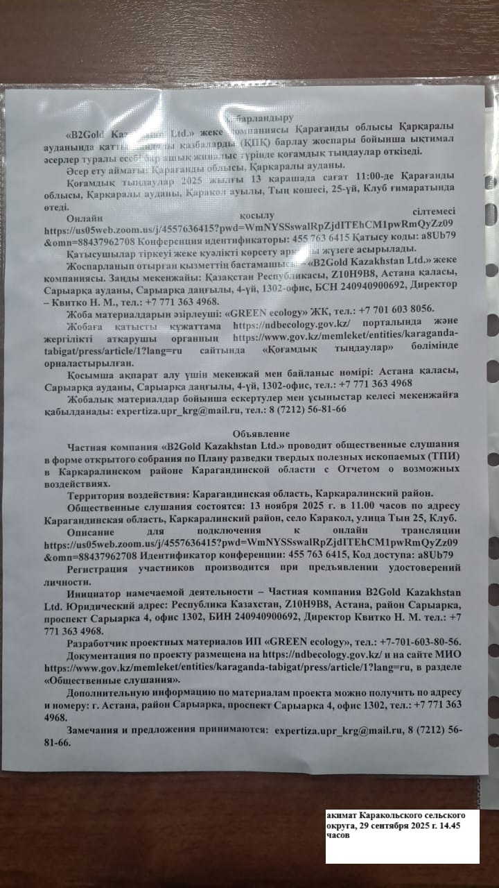 3. Общественные слушания организованны: Управление природных ресурсов и регулирования природопользования Карагандинской области, expertiza.upr_krg@mail.ru,