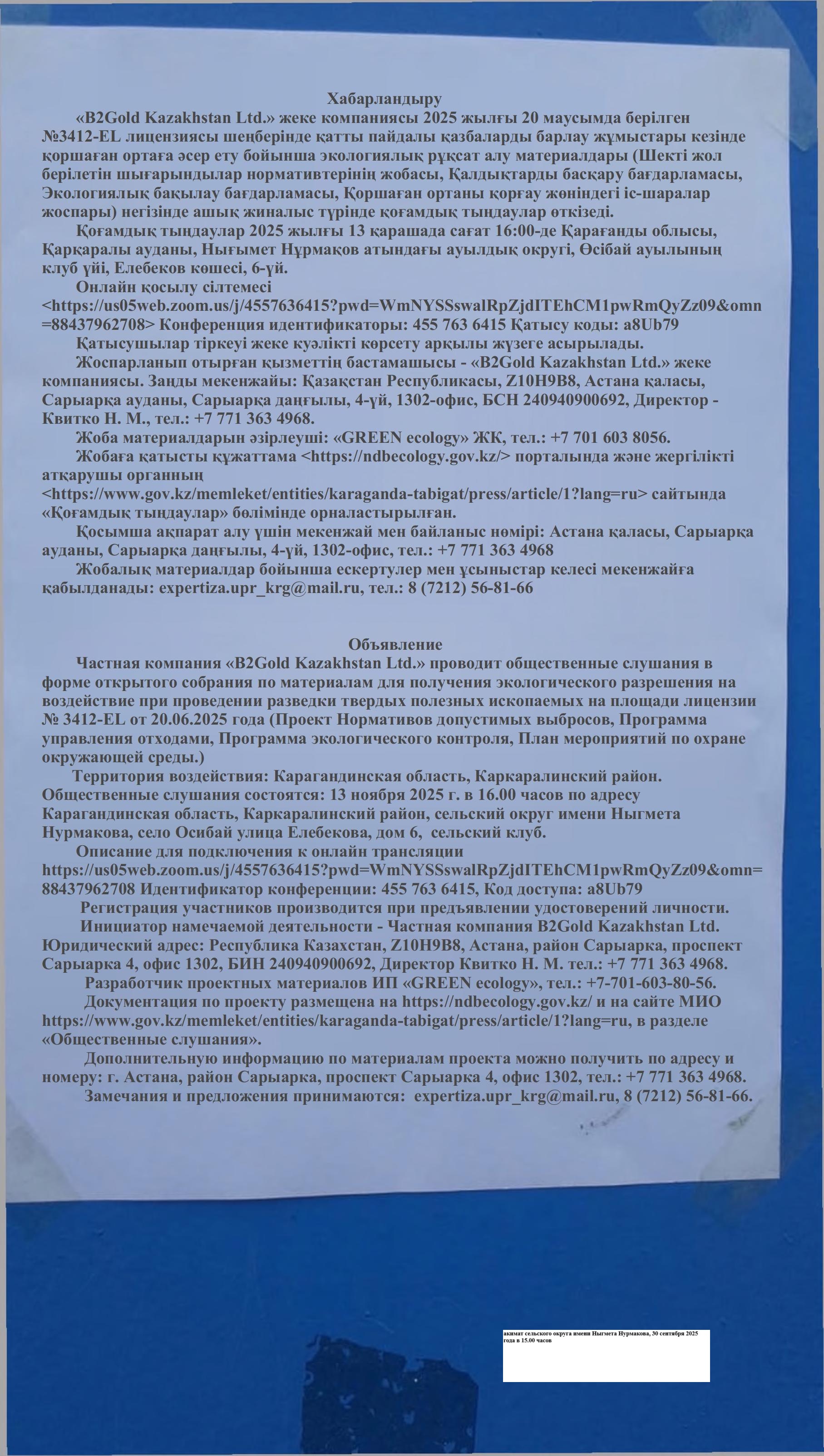 3. Общественные слушания организованны: Управление природных ресурсов и регулирования природопользования Карагандинской области, expertiza.upr_krg@mail.ru,
