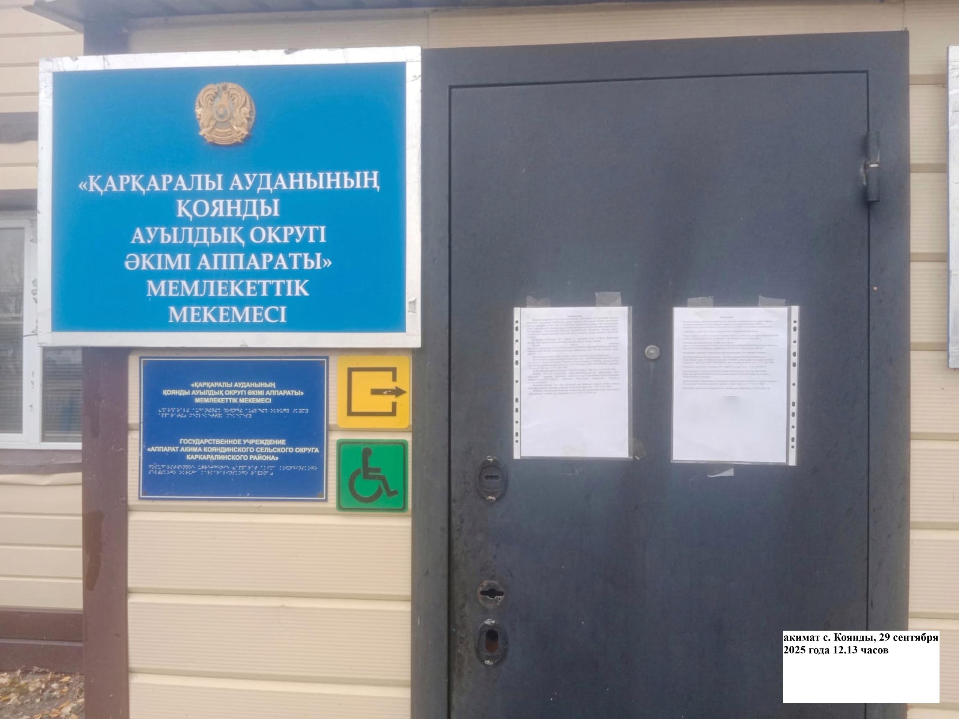 6.3. расположение мест, специально предназначенных для Размещения печатных объявлений (доски объявлений): Карагандинская область, Каркаралинский район, сельский округ Коянды, информационные стенды