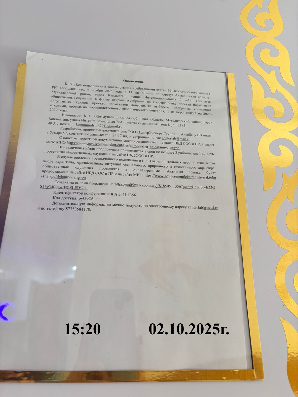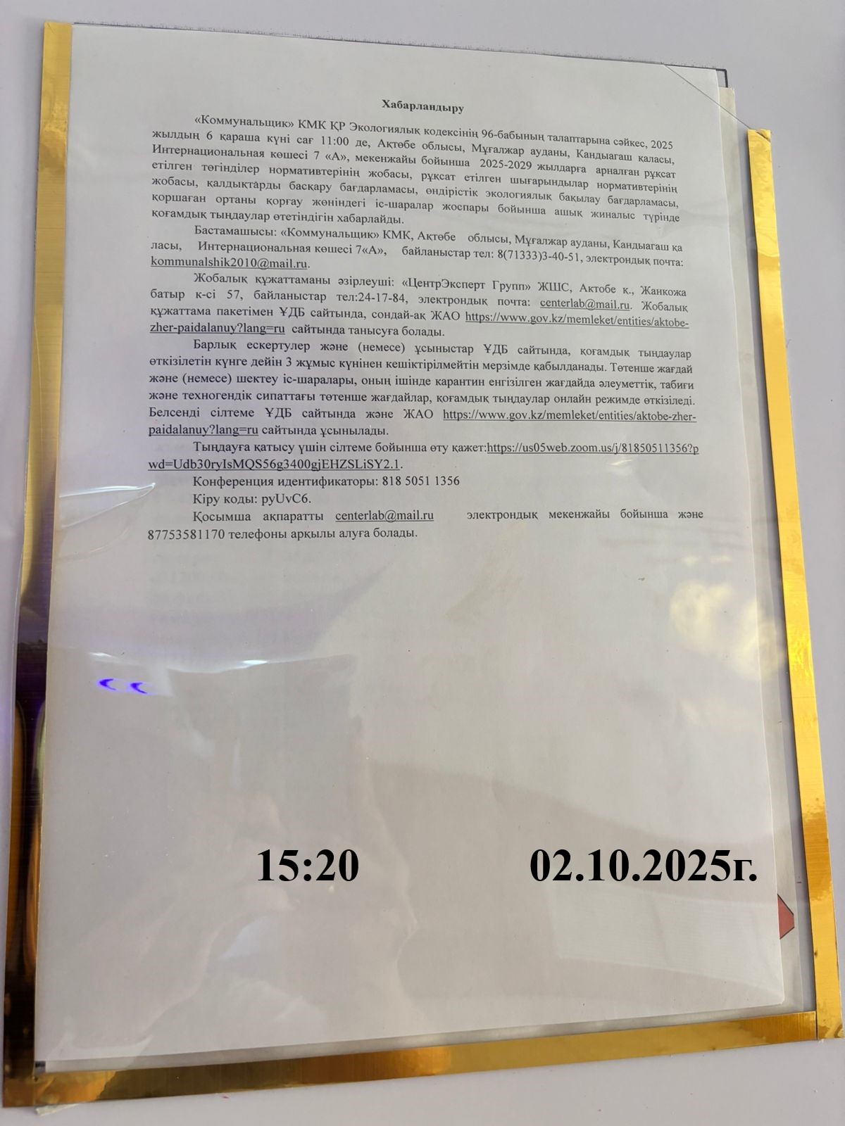 3. Общественные слушания организованны: Управление природных ресурсов и регулирования природопользования Актюбинской области, expert_oos@mail.ru,