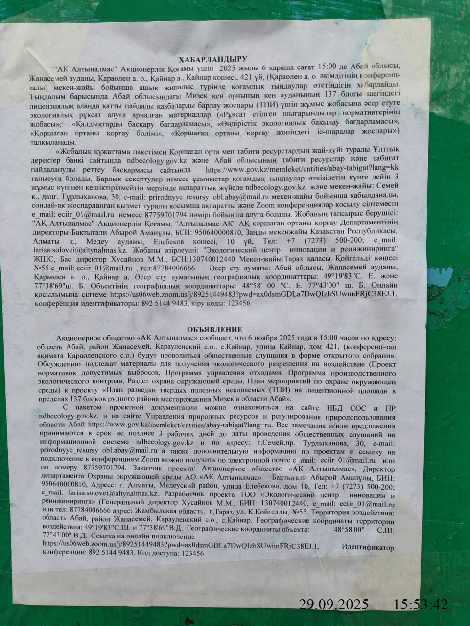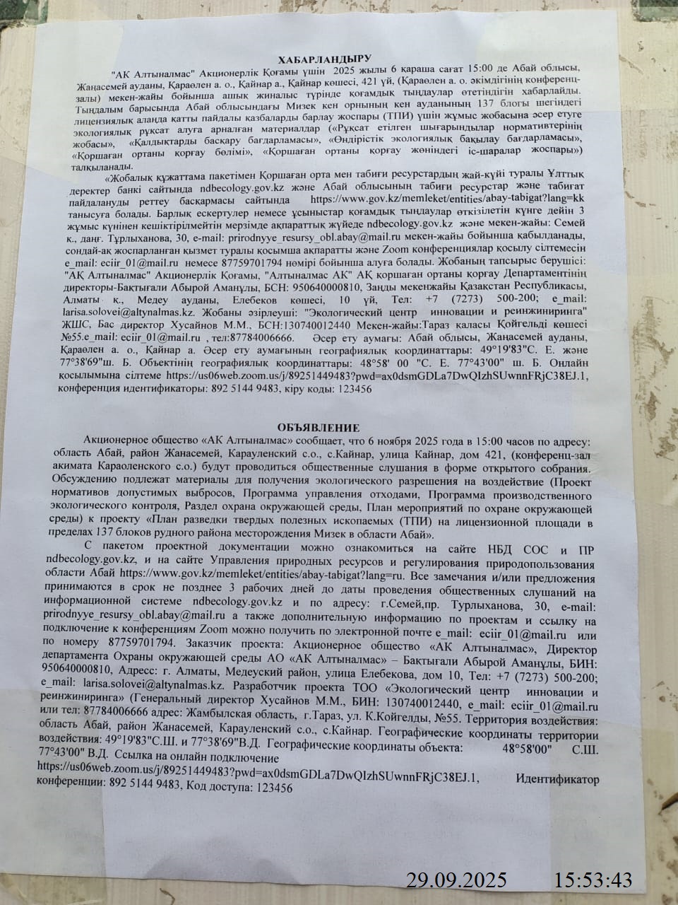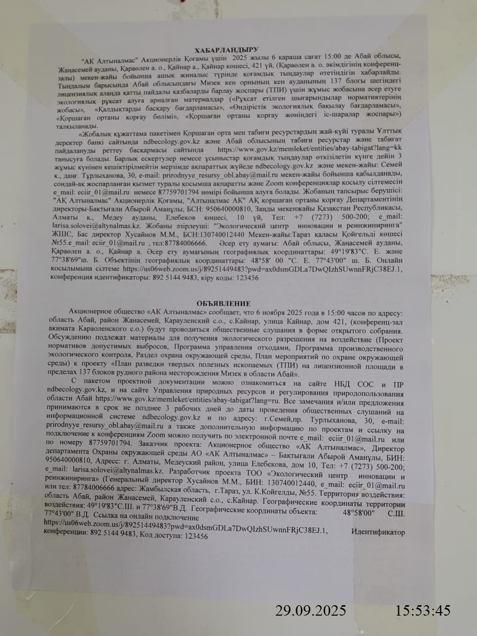 3. Общественные слушания организованны: Главный специалист УПР и ПР область Абай, prirodnyye_resursy_obl.abay@mail.ru,