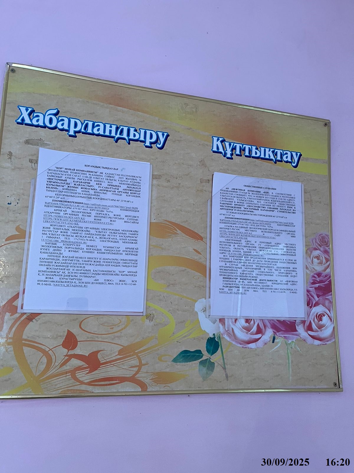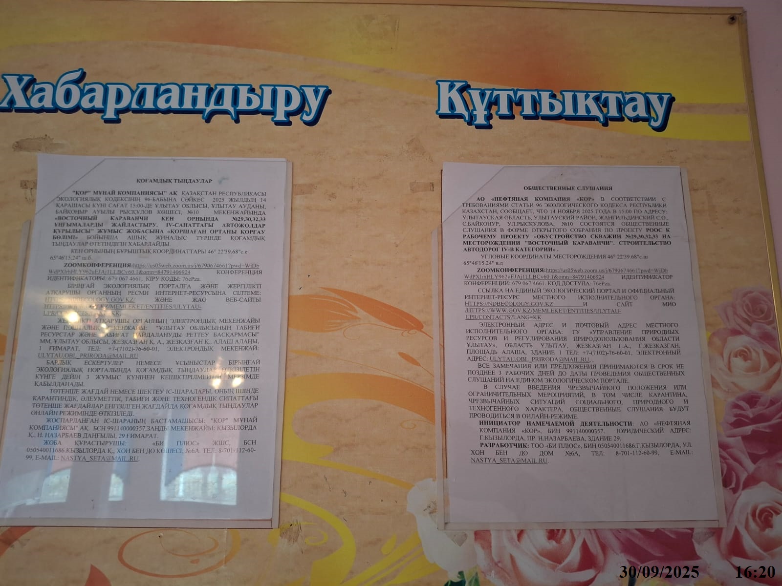 1.4. Описание для подключения к онлайн трансляции при прохождении общественного слушания: в соответствии с пп.4, п.11 прил. 3 Правил, информация о проведении общественных слушаний должна быть распространена на государственном и русском языках на досках объявлений местных исполнительных органов административно-территориальных единиц и в местах, специально предназначенных для размещения объявлений. В связи с чем необходимо дополнительно разместить печатные объявления на досках объявлений в акимате и в местах, специально предназначенных для размещения объявлений.