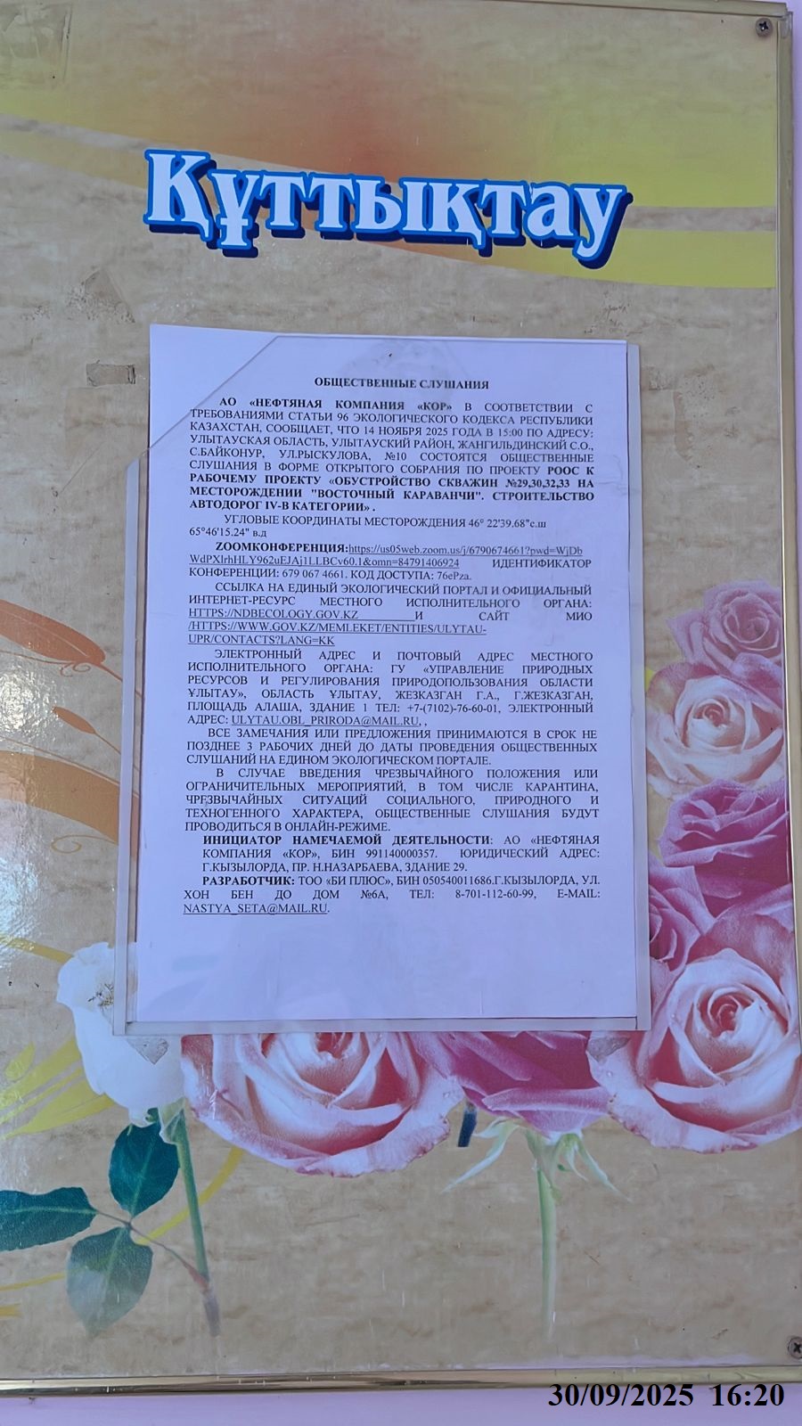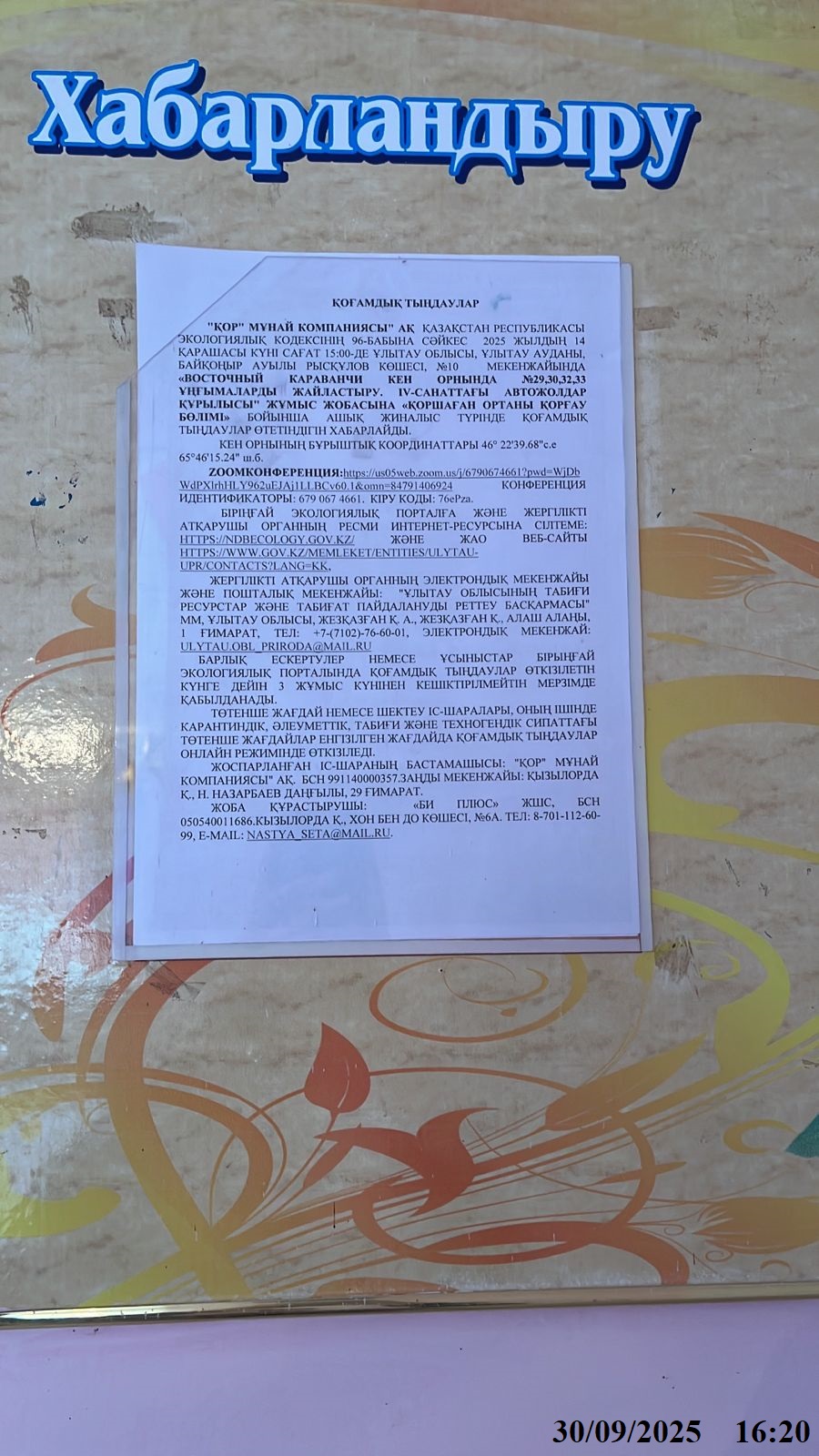 3. Общественные слушания организованны: Главный специалист УПР и ПР область Ұлытау, ulytau.obl_priroda@mail.ru,