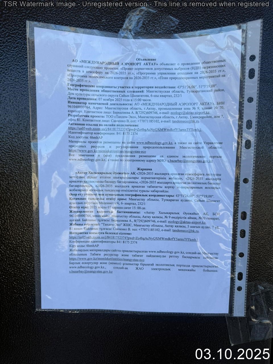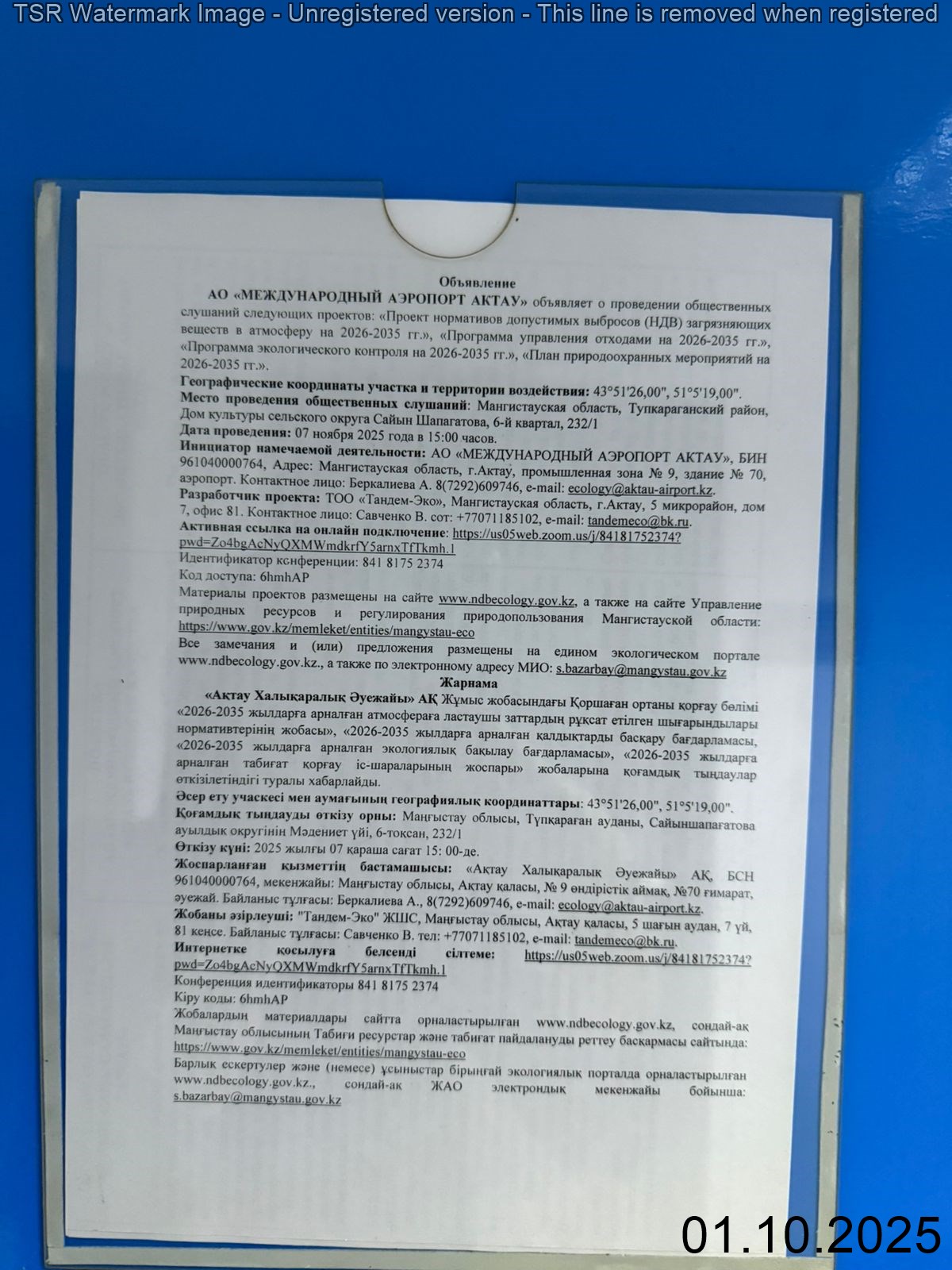 3. Общественные слушания организованны: Управление природных ресурсов и регулирования природопользования Мангистауской области, s.bazarbay@mangystau.gov.kz,