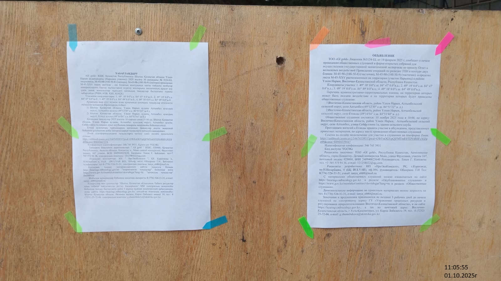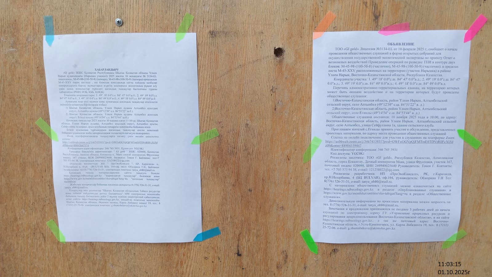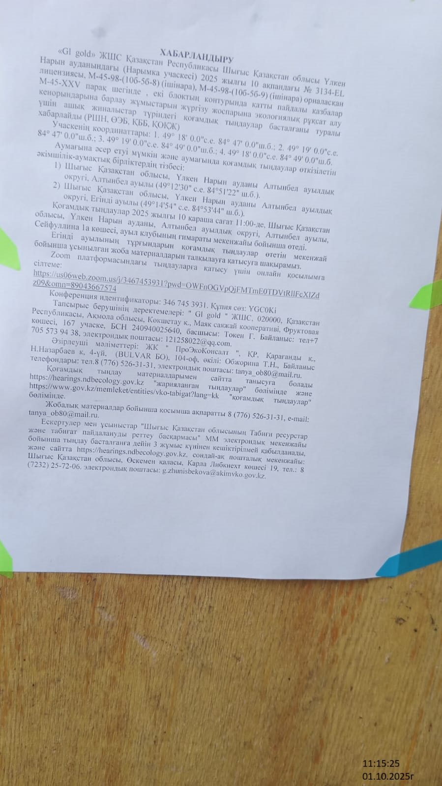 3. Общественные слушания организованны: Управление природных ресурсов и регулирования природопользования Восточно-Казахстанской области, g.zhunisbekova@akimvko.gov.kz,