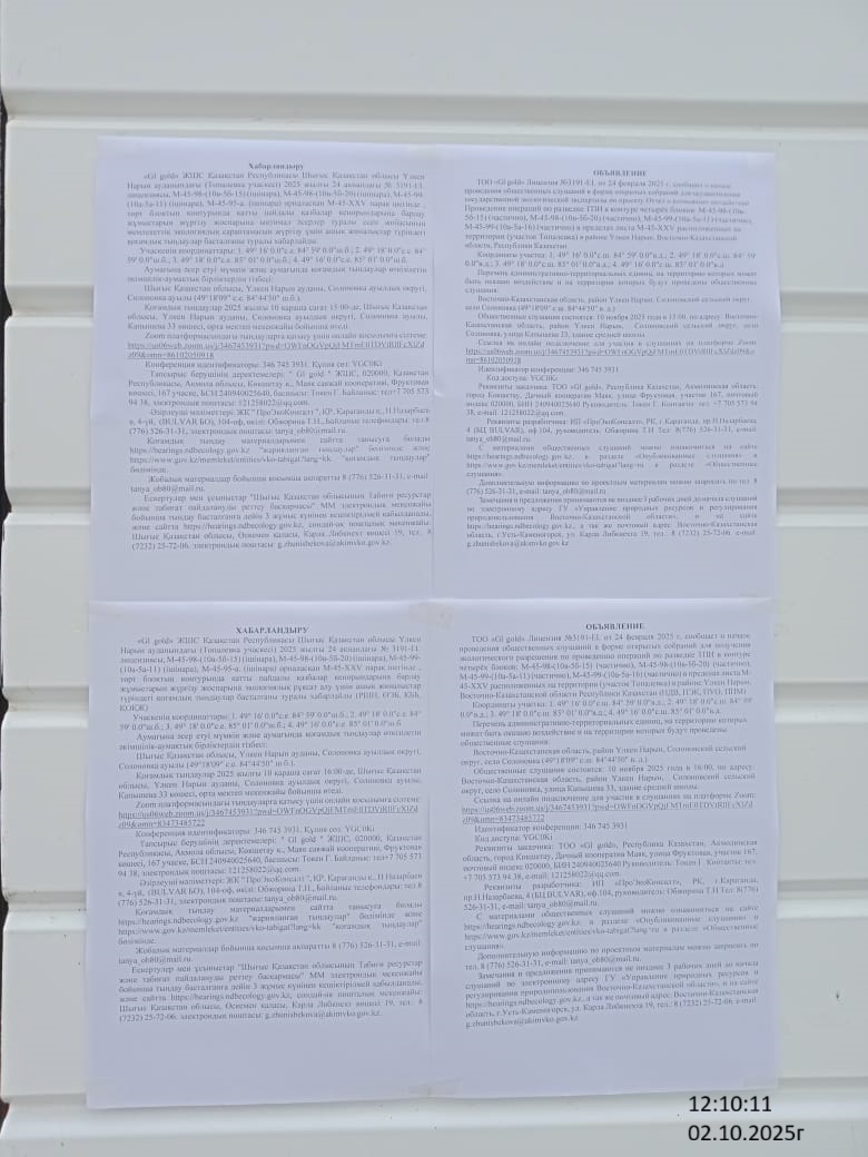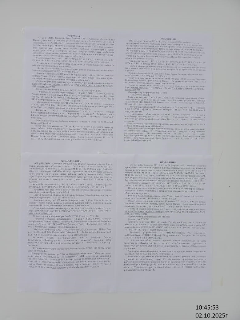 3. Общественные слушания организованны: Управление природных ресурсов и регулирования природопользования Восточно-Казахстанской области, g.zhunisbekova@akimvko.gov.kz,