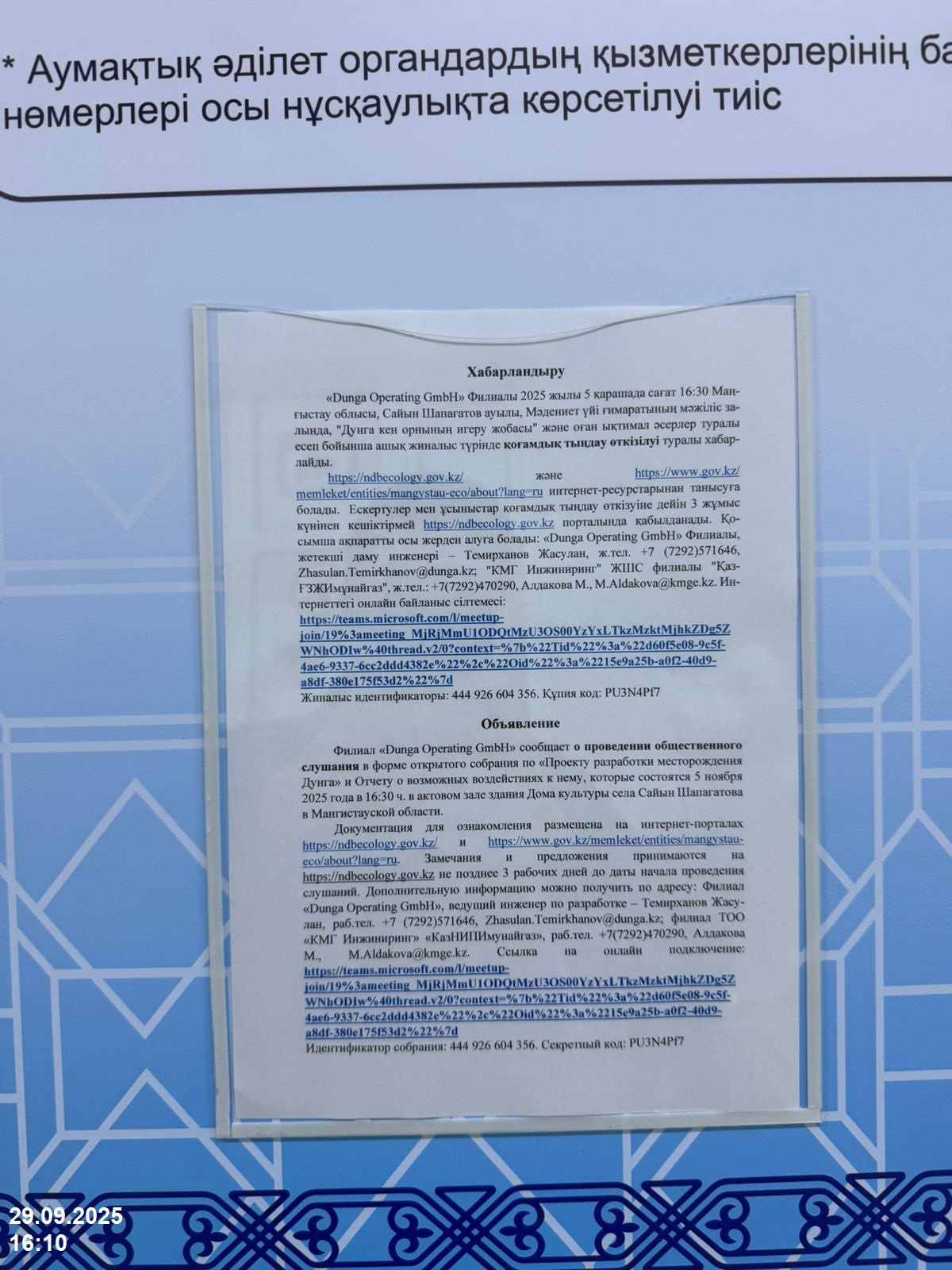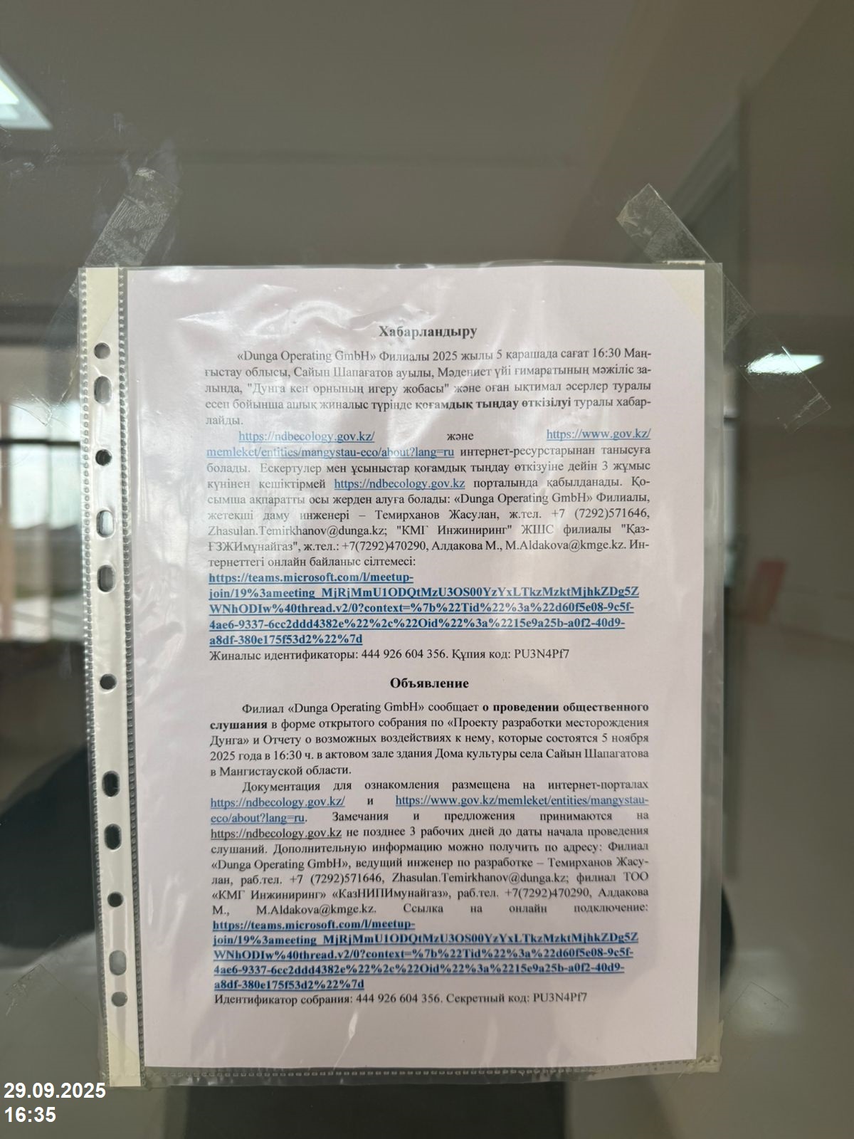 3. Общественные слушания организованны: Управление природных ресурсов и регулирования природопользования Мангистауской области, s.bazarbay@mangystau.gov.kz,