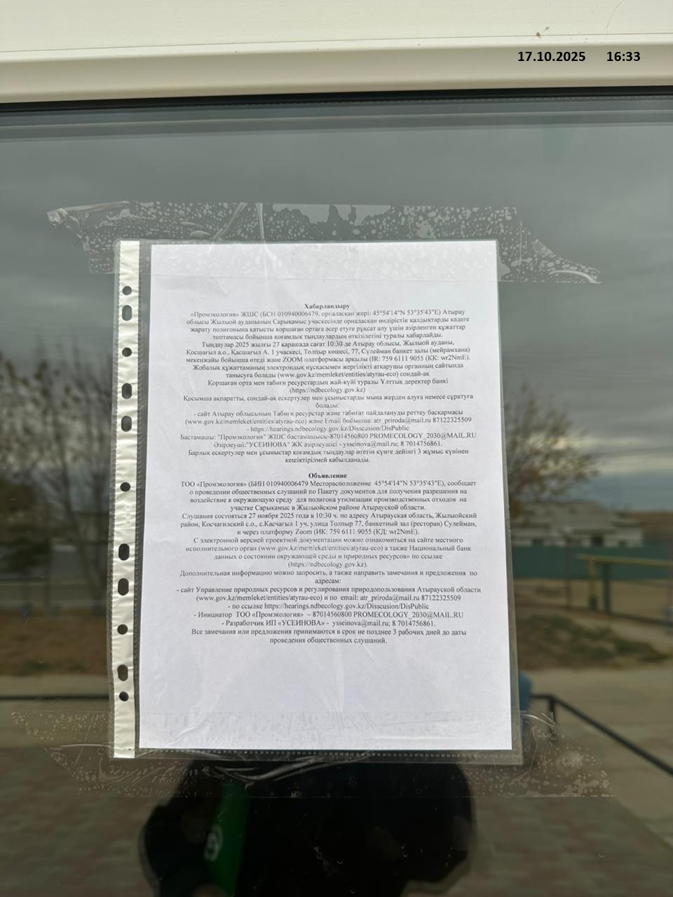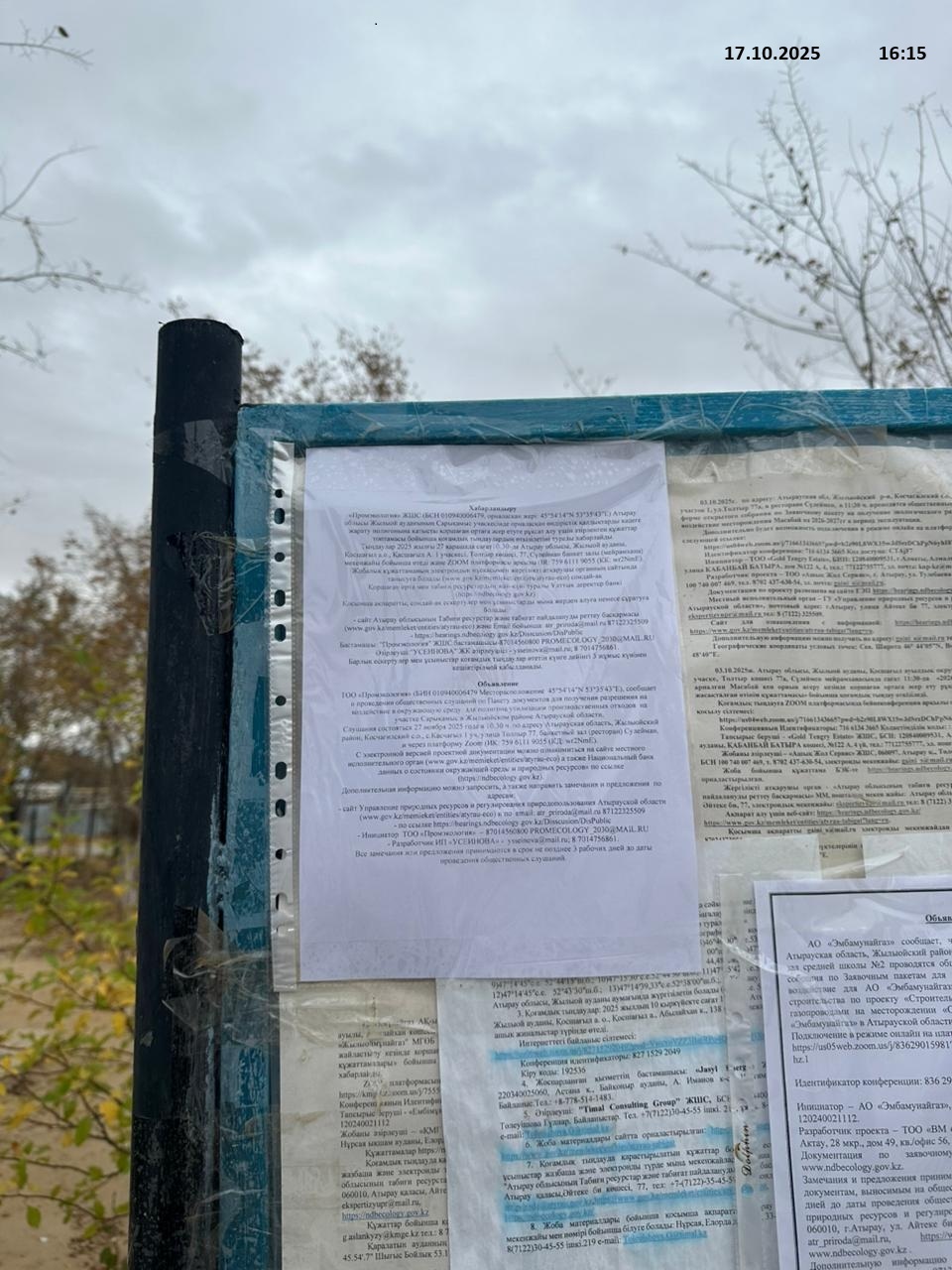 3. Общественные слушания организованны: Управление природных ресурсов и регулирования природопользования Атырауской области, atr.priroda@atyrau.gov.kz,