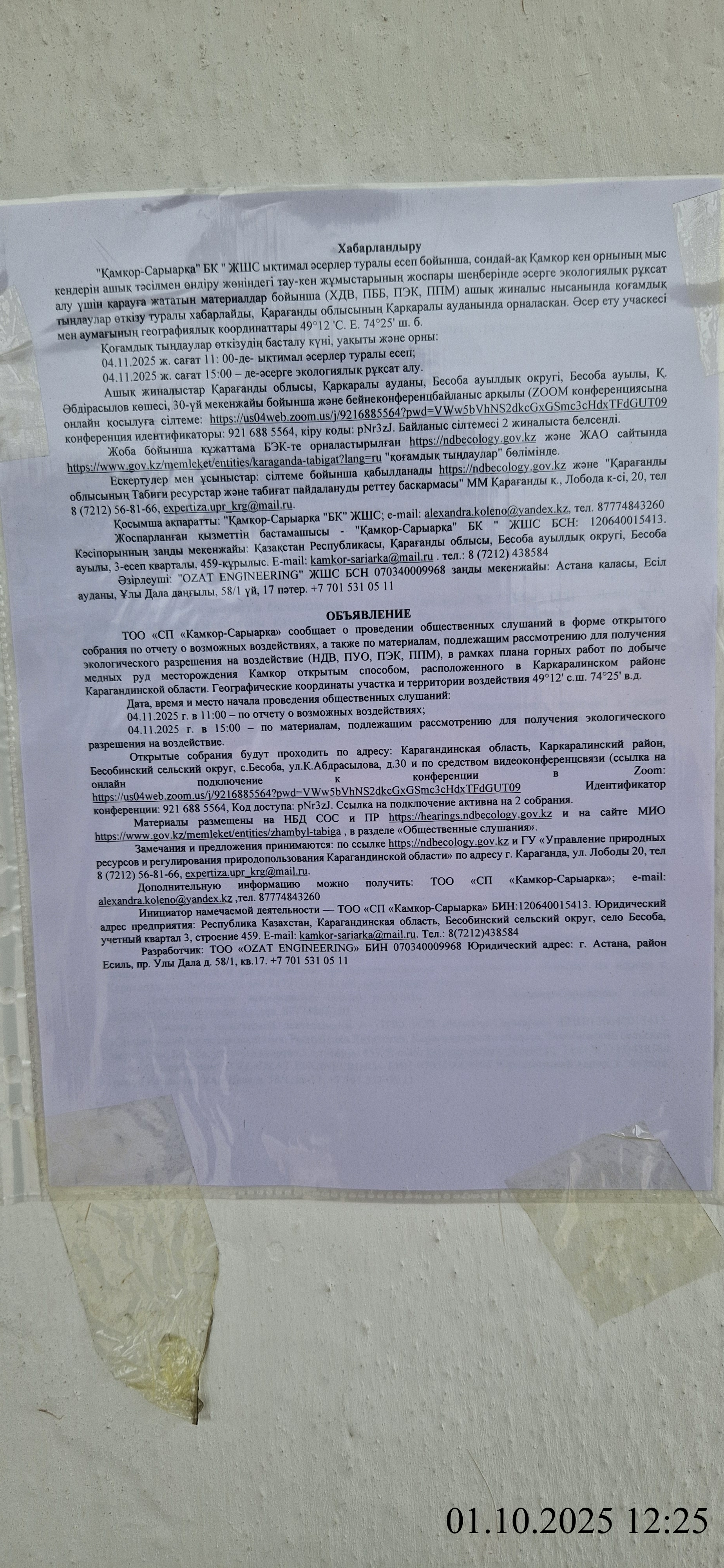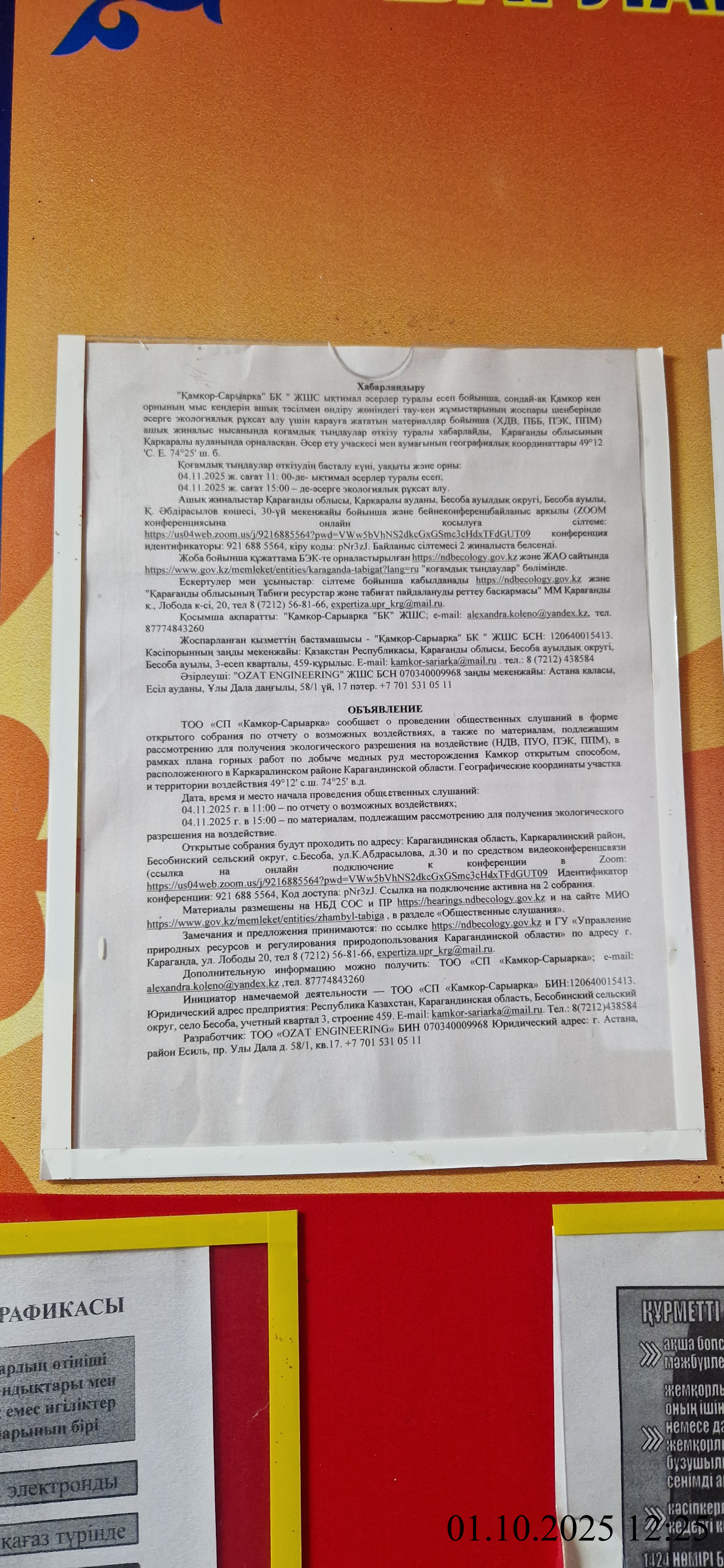 3. Общественные слушания организованны: Управление природных ресурсов и регулирования природопользования Карагандинской области, expertiza.upr_krg@mail.ru,