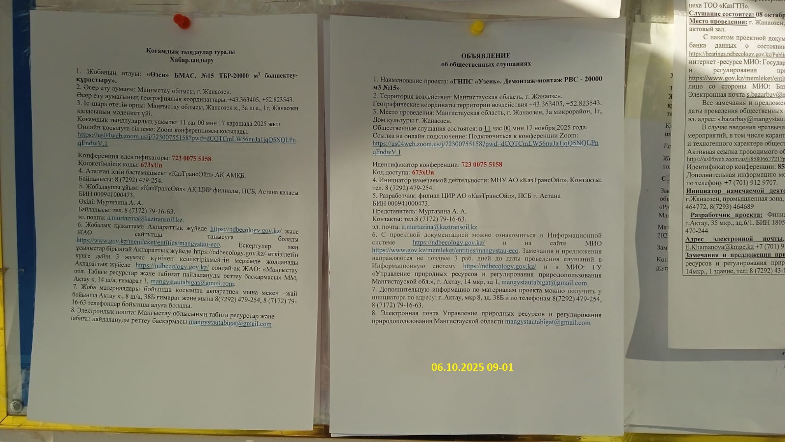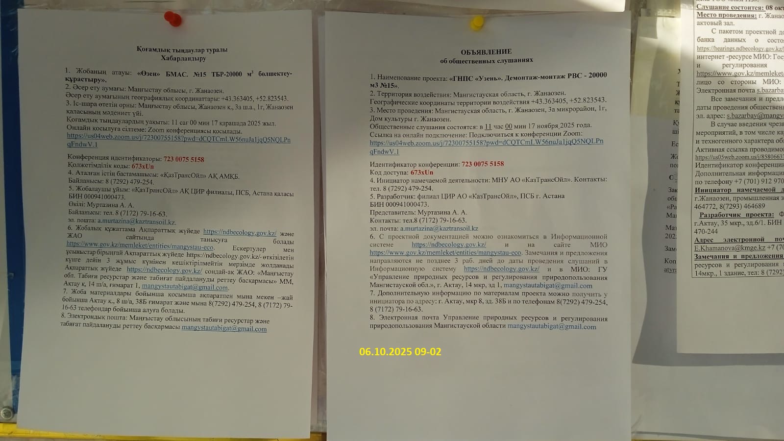 4. Повестка дня общественных слушаний: Краткая характеристика основного производства Для повышения надежности эксплуатации РВС №15 рабочим проектом предусмотрено: По технологической части: − Демонтаж существующего РВС№ 15 объемом 20000м3; − Строительство нового РВС№ 15 объемом 20000м3 на месте демонтируемого; − Замена технологических трубопроводов приема-откачки нефти РВС№ 15; − Замена технологических трубопроводов приема-откачки нефти на РВС №11,13, 16; − Замена электроприводных задвижек; − Замена устройств размыва донных отложений; − Замена трубопровода сброса подтоварной воды; − Замена оборудования РВС автоматического пожаротушения и орошения; − Железобетонное ограждения каре РВС №15. В соответствии с изложенным в части инженерно-технического обеспечения проектом предусмотрено: − электроснабжение приводов технологических задвижек и устройств размыва донных отложений; − технические решения по контролю параметров и по управлению оборудованием через контроллер SCADA; − расчет молниезащиты и освещенности, установка мачт с молниеприемниками; − заземление; − электрохимическая защита РВС; − кабельные эстакады; − площадки для обслуживания задвижек. Для обеспечения возможности подъезда спецтехники к РВС №15, при плановых ремонтных и профилактических работах, предусмотрен автомобильный въезд в каре. Қоғамдық тыңдаулар туралы Хабарландыру 1. Жобаның атауы: «Өзен» БМАС. №15 ТБР-20000 м3 бөлшектеу-құрастыру». 2. Әсер ету аумағы: Маңғыстау облысы, г. Жанаозен. Әсер ету аумағының географиялық координаттары: +43.363405, +52.823543. 3. Іс-шара өтетін орны: Маңғыстау облысы, Жанаозен қ., 3а ш.а., 1г, Жанаозен қаласының мәдениет үйі. Қоғамдық тыңдаулардың уақыты: 11 сағ 00 мин 17 қарашада 2025 жыл. Онлайн қосылуға сілтеме: Zoom конференциясы қосылады. https://us04web.zoom.us/j/72300755158?pwd=dCQTCmLW56nuJa1jqQ5NQLPnqFndwV.1 Конференция идентификаторы: 723 0075 5158 Қолжетімділік коды: 673xUn 4. Аталған істің бастамашысы: «ҚазТрансОйл» АҚ АМҚБ. Байланысы: 8 (7292) 479-254. 5. Жобалаушы ұйым: «ҚазТрансОйл» АҚ ЦИР филиалы, ПСБ, Астана қаласы БИН 000941000473. Өкілі: Муртазина А. А. Байланысы: тел. 8 (7172) 79-16-63. эл. пошта: a.murtazina@kaztransoil.kz. 6. Жобалық құжаттама Ақпараттық жүйеде https://ndbecology.gov.kz/ және ЖАО сайтында танысуға болады https://www.gov.kz/memleket/entities/mangystau-eco. Ескертулер мен ұсыныстар бірыңғай Ақпараттық жүйеде https://ndbecology.gov.kz/ өткізілетін күнге дейін 3 жұмыс күнінен кешіктірілмейтін мерзімде жолданады Ақпараттық жүйеде https://ndbecology.gov.kz/ сондай-ақ ЖАО: «Маңғыстау обл. Табиғи ресурстар және табиғат пайдалануды реттеу басқармасы» ММ, Ақтау қ, 14 ш/а, ғимарат 1, mangystautabigat@gmail.com. 7. Жоба материалдары бойынша қосымша ақпаратпен мына мекен –жай бойынша Ақтау қ., 8 ш/а, 38Б ғимарат және мына 8(7292) 479-254, 8 (7172) 79-16-63 телефондар бойынша алуға болады. 8. Электрондық пошта: Маңғыстау облысының табиғи ресурстар және табиғат пайдалануды реттеу басқармасы mangystautabigat@gmail.com ОБЪЯВЛЕНИЕ об общественных слушаниях 1. Наименование проекта: «ГНПС «Узень». Демонтаж-монтаж РВС - 20000 м3 №15». 2. Территория воздействия: Мангистауская область, г. Жанаозен. Географические координаты территории воздействия +43.363405, +52.823543. 3. Место проведения: Мангистауская область, г. Жанаозен, 3а микрорайон, 1г, Дом культуры г. Жанаозен. Общественные слушания состоятся: в 11 час 00 мин 17 ноября 2025 года. Ссылка на онлайн подключение: Подключиться к конференции Zoom: https://us04web.zoom.us/j/72300755158?pwd=dCQTCmLW56nuJa1jqQ5NQLPnqFndwV.1 Иде