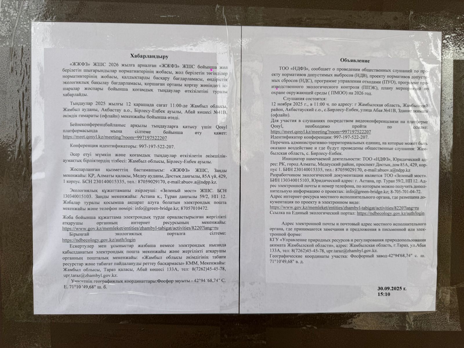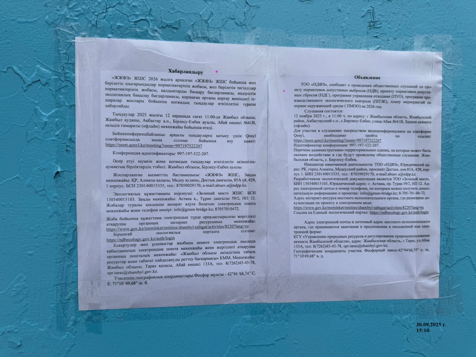 3. Общественные слушания организованны: Управление природных ресурсов и регулирования природопользования Жамбылской области, s.agabek@zhambyl.gov.kz,