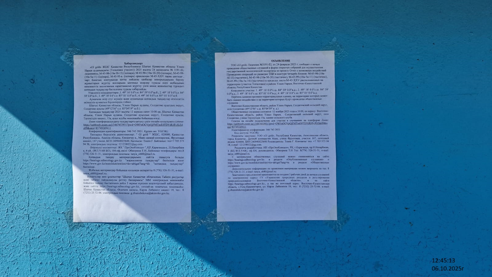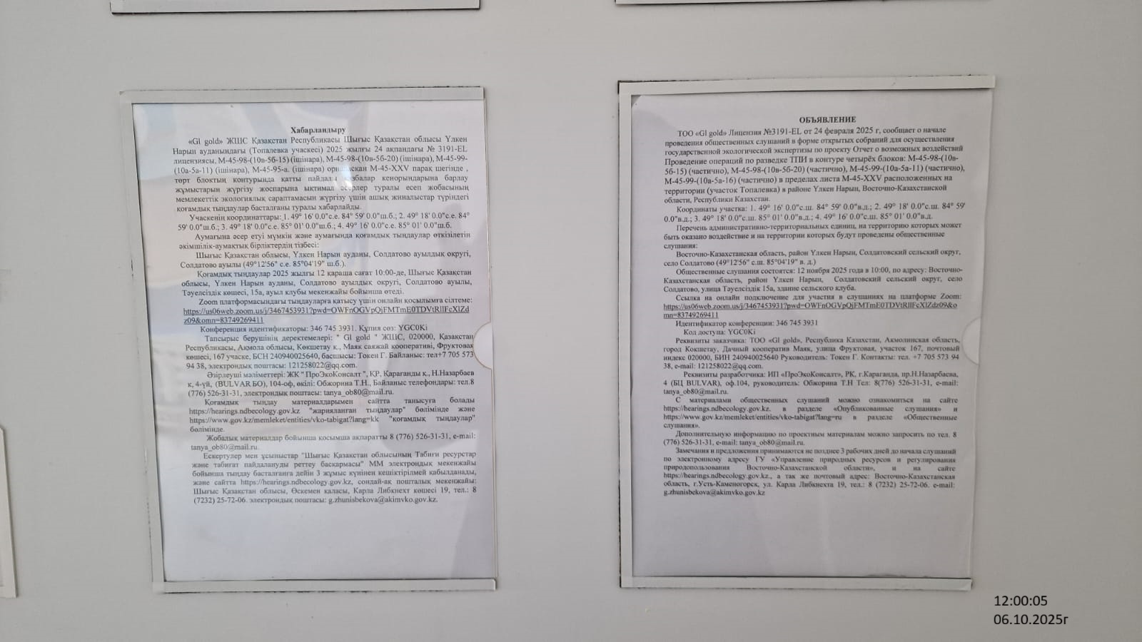 1.2. Место проведения: Восточно-Казахстанская область, район Үлкен Нарын, Солдатовский сельский округ, село Солдатово, улица Тәуелсіздік 15а, здание сельского клуба. Ссылка на онлайн подключение для участия в слушаниях на платформе Zoom: https://us06web.zoom.us/j/3467453931?pwd=OWFnOGVpQjFMTmE0TDVtRllFcXlZdz09&omn=83749269411 Идентификатор конференции: 346 745 3931 Код доступа: YGC0Ki
