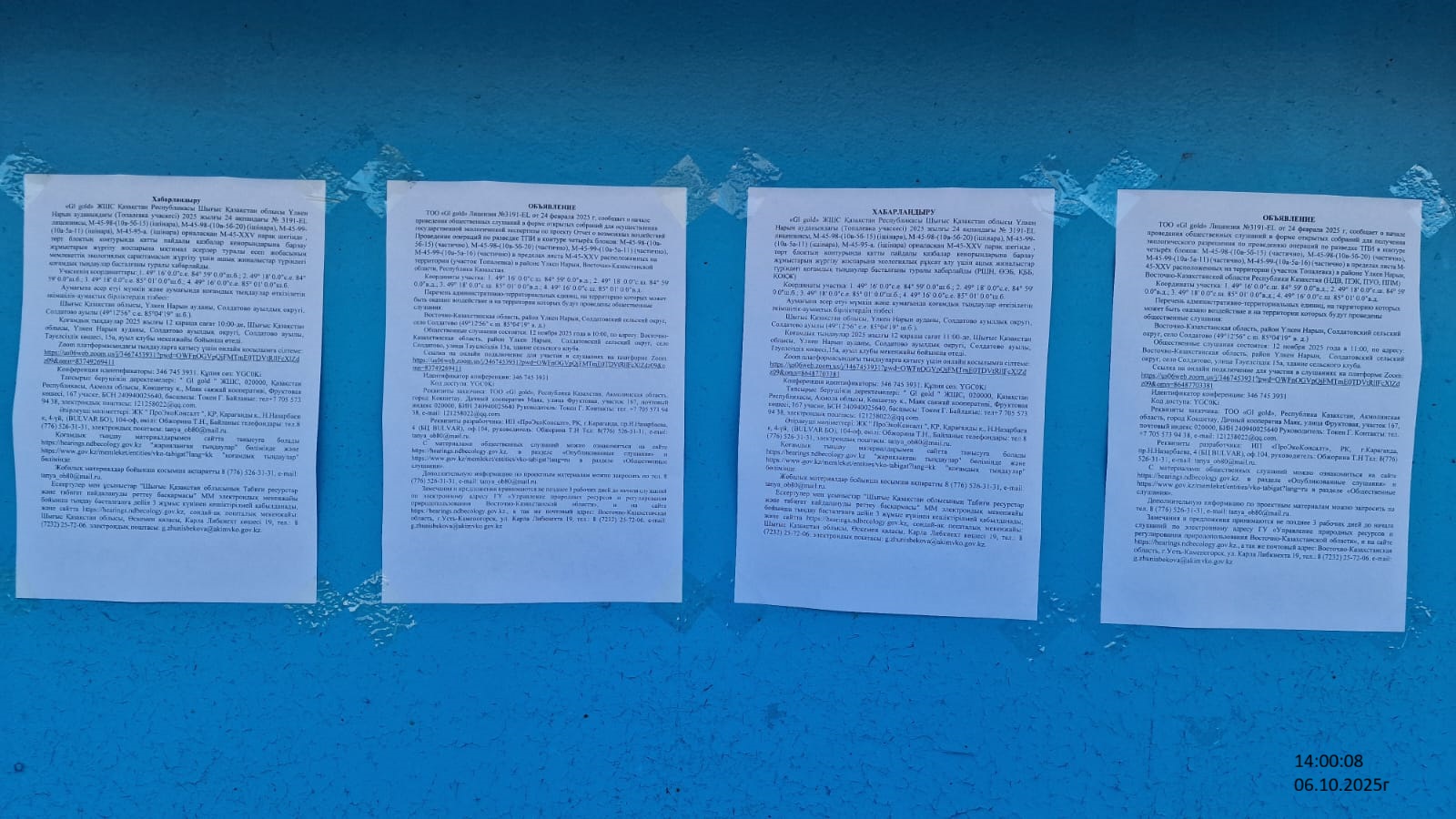 1.2. Место проведения: Восточно-Казахстанская область, район Үлкен Нарын, Солдатовский сельский округ, село Солдатово, улица Тәуелсіздік 15а, здание сельского клуба. Ссылка на онлайн подключение для участия в слушаниях на платформе Zoom: https://us06web.zoom.us/j/3467453931?pwd=OWFnOGVpQjFMTmE0TDVtRllFcXlZdz09&omn=86487703381 Идентификатор конференции: 346 745 3931 Код доступа: YGC0Ki
