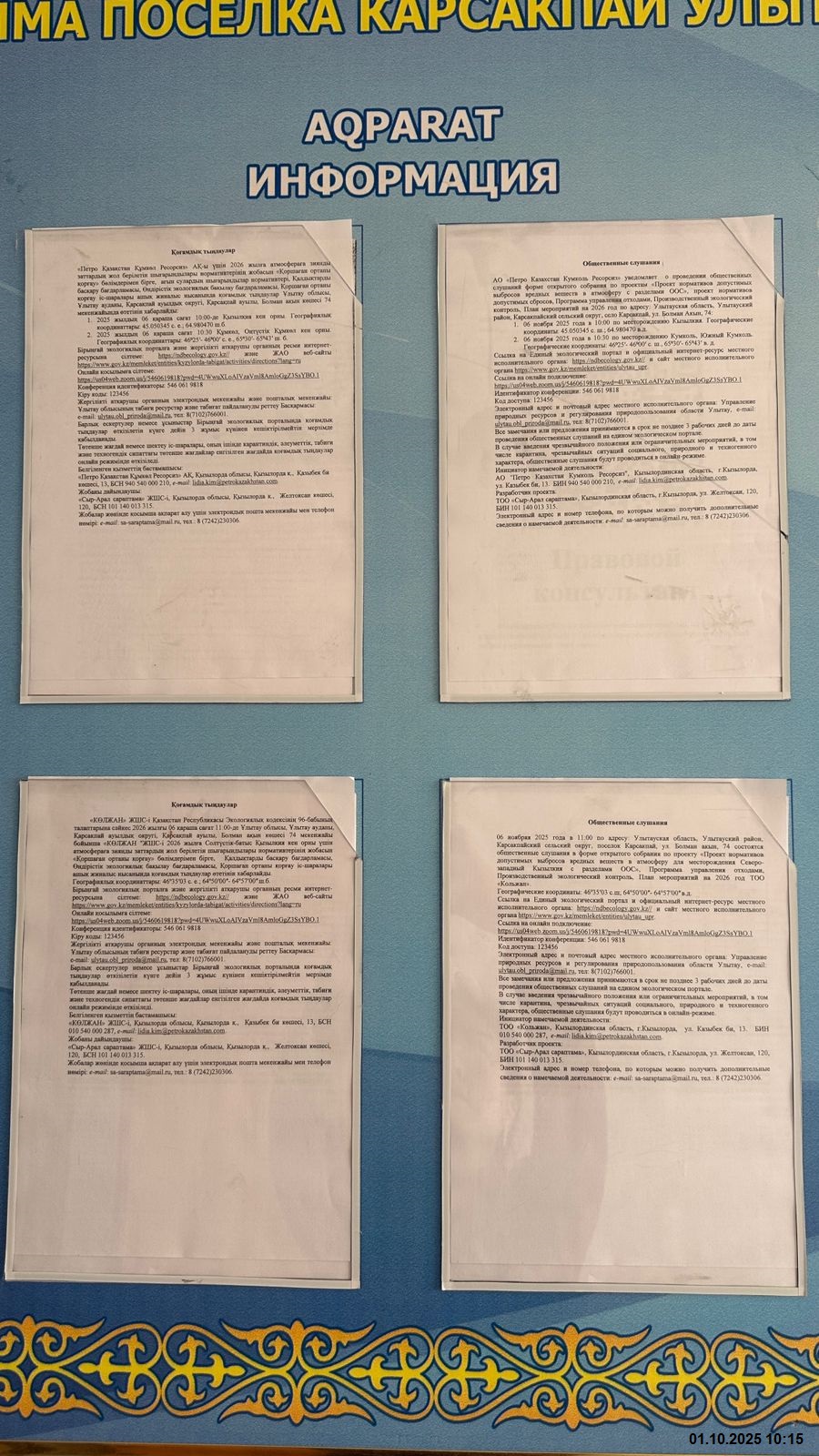 1.4. Описание для подключения к онлайн трансляции при прохождении общественного слушания: в соответствии с пп.4, п.11 прил. 3 Правил, информация о проведении общественных слушаний должна быть распространена на государственном и русском языках на досках объявлений местных исполнительных органов административно-территориальных единиц и в местах, специально предназначенных для размещения объявлений. В связи с чем необходимо дополнительно разместить печатные объявления на досках объявлений в акимате и в местах, специально предназначенных для размещения объявлений.