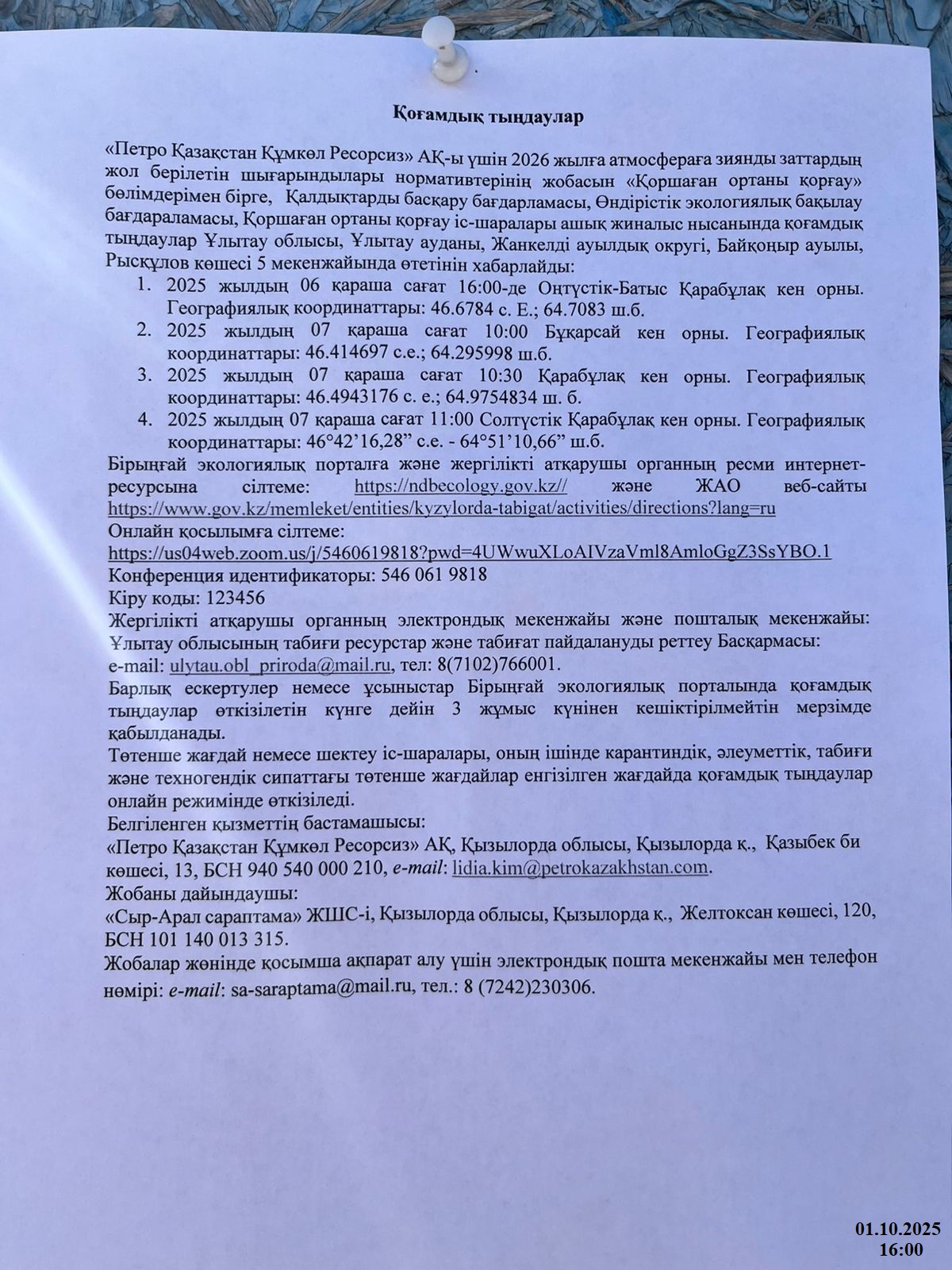 3. Общественные слушания организованны: Главный специалист УПР и ПР область Ұлытау, ulytau.obl_priroda@mail.ru,