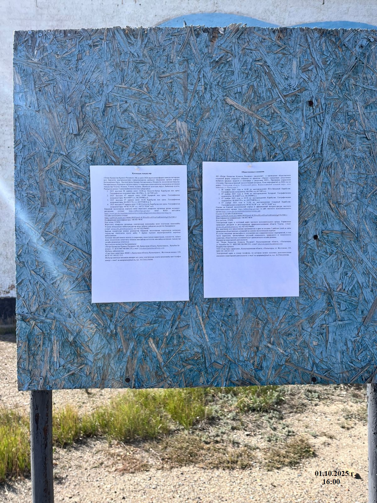 1.4. Описание для подключения к онлайн трансляции при прохождении общественного слушания: в соответствии с пп.4, п.11 прил. 3 Правил, информация о проведении общественных слушаний должна быть распространена на государственном и русском языках на досках объявлений местных исполнительных органов административно-территориальных единиц и в местах, специально предназначенных для размещения объявлений. В связи с чем необходимо дополнительно разместить печатные объявления на досках объявлений в акимате и в местах, специально предназначенных для размещения объявлений.