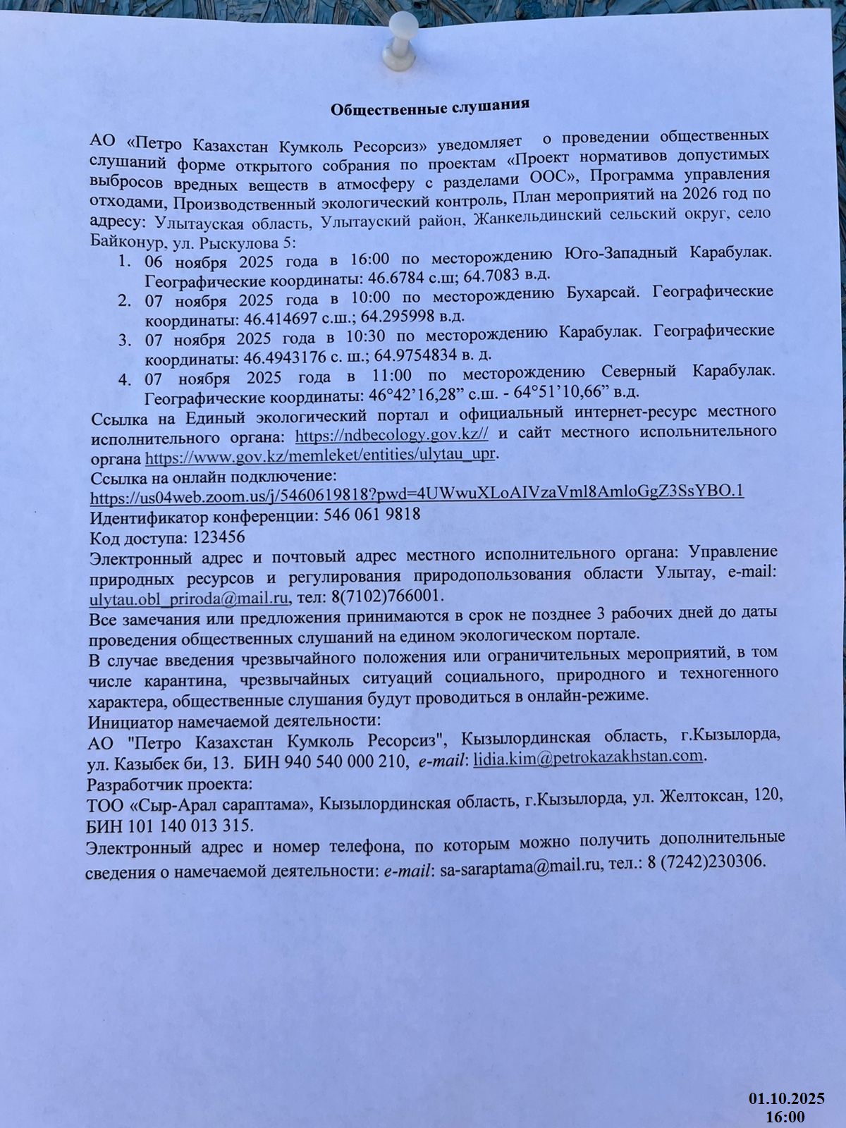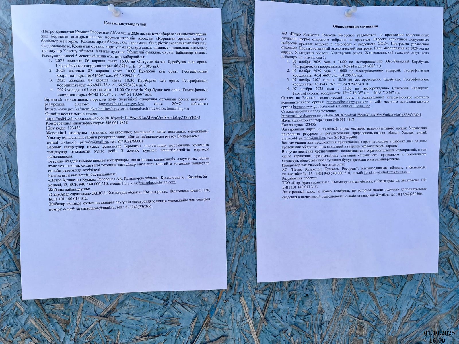 1.4. Описание для подключения к онлайн трансляции при прохождении общественного слушания: в соответствии с пп.4, п.11 прил. 3 Правил, информация о проведении общественных слушаний должна быть распространена на государственном и русском языках на досках объявлений местных исполнительных органов административно-территориальных единиц и в местах, специально предназначенных для размещения объявлений. В связи с чем необходимо дополнительно разместить печатные объявления на досках объявлений в акимате и в местах, специально предназначенных для размещения объявлений.
