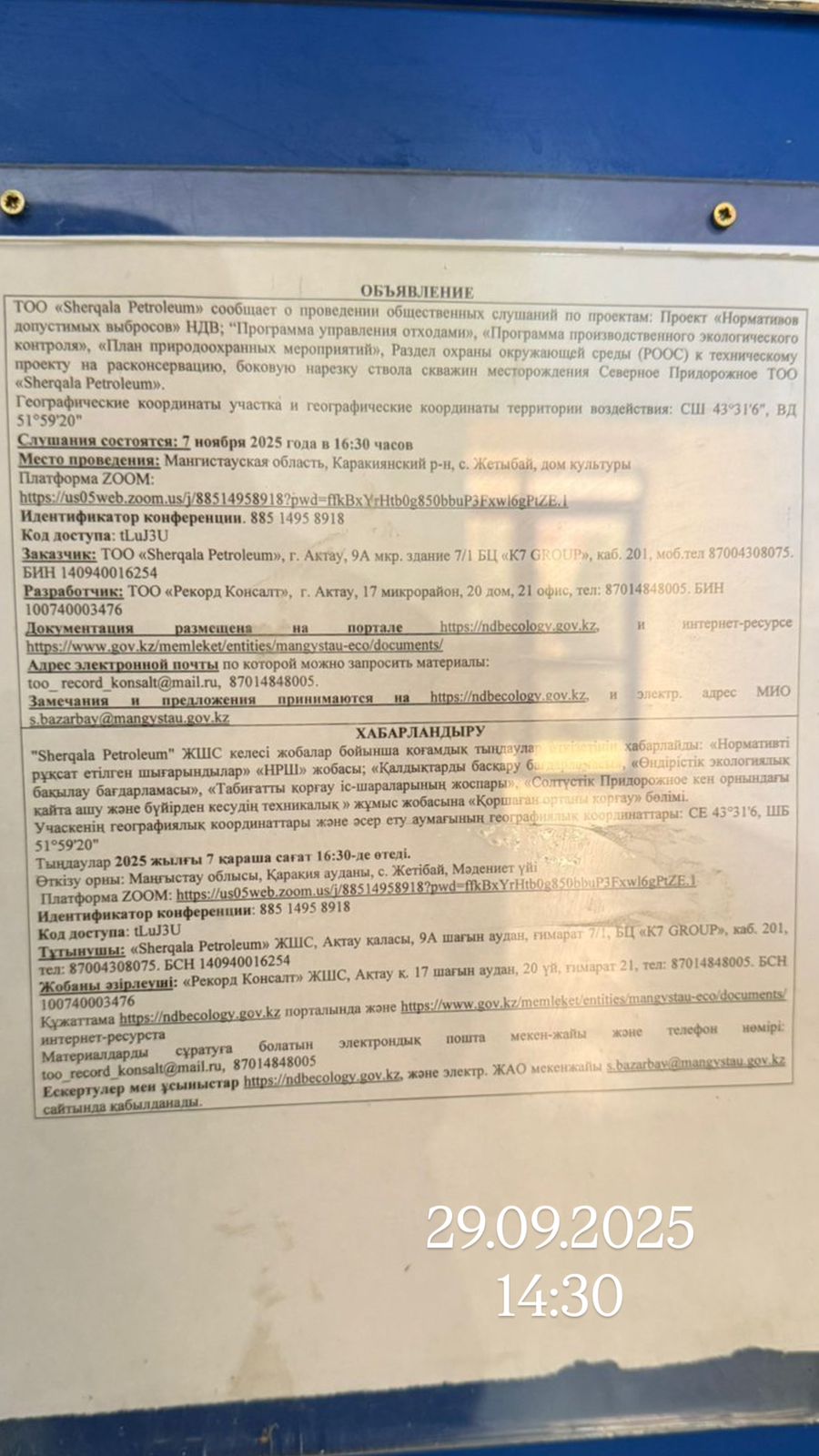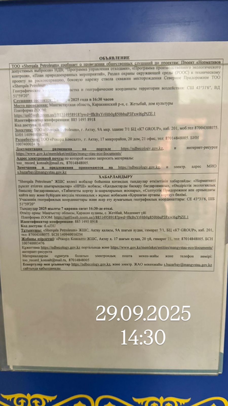 4. Повестка дня общественных слушаний: Проект нормативов допустимых выбросов месторождения Северное Придорожное для ТОО «Sherqala Petroleum» на 2026 год выполнен ТОО «Рекорд Консалт». Проект нормативов допустимых выбросов от источников загрязнения ТОО «Sherqala Petroleum» на 2026 год разработан по следующим основаниям: - необходимостью корректировки программы развития переработки сырого газа в период промышленной разработки месторождения Северное Придорожное на 2025–2026 гг., с учётом плановых технологических показателей на 2026 год; - продолжение работ по техническому проекту на расконсервацию, боковую нарезку ствола скважин месторождения Северное Придорожное (с разделом «Охрана окружающей среды»); - вводом в эксплуатацию новых источников выбросов в рамках проекта «Реконструкция системы утилизации ПНГ на месторождении Северное Придорожное», ранее получившего разрешение на строительство. Проект нормативов допустимых выбросов загрязняющих веществ в атмосферный воздух на месторождении ТОО «Sherqala Petroleum» на 2026 год для ТОО «Sherqala Petroleum» состоит из двух частей: Книга 1 – Инвентаризация источников выбросов загрязняющих веществ в атмосферу от источников загрязнения ТОО «Sherqala Petroleum» на 2026 год. Книга 2 – Проект нормативов допустимых выбросов загрязняющих веществ в атмосферный воздух на месторождении Северное Придорожное на 2026 год для ТОО «Sherqala Petroleum». Инвентаризация источников выбросов загрязняющих веществ разработана согласно Приложению 2 к Методике определения нормативов эмиссий в окружающую среду (Приказ Министра экологии, геологии и природных ресурсов Республики Казахстан от 10 марта 2021 года №63). Платформа ZOOM: https://us05web.zoom.us/j/88514958918?pwd=ffkBxYrHtb0g850bbuP3Fxwl6gPtZE.1 Идентификатор конференции: 885 1495 8918 Код доступа: tLuJ3U
