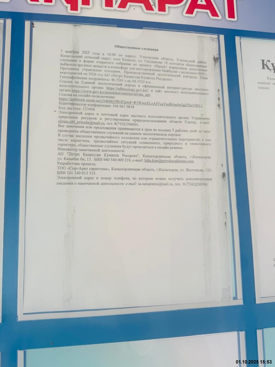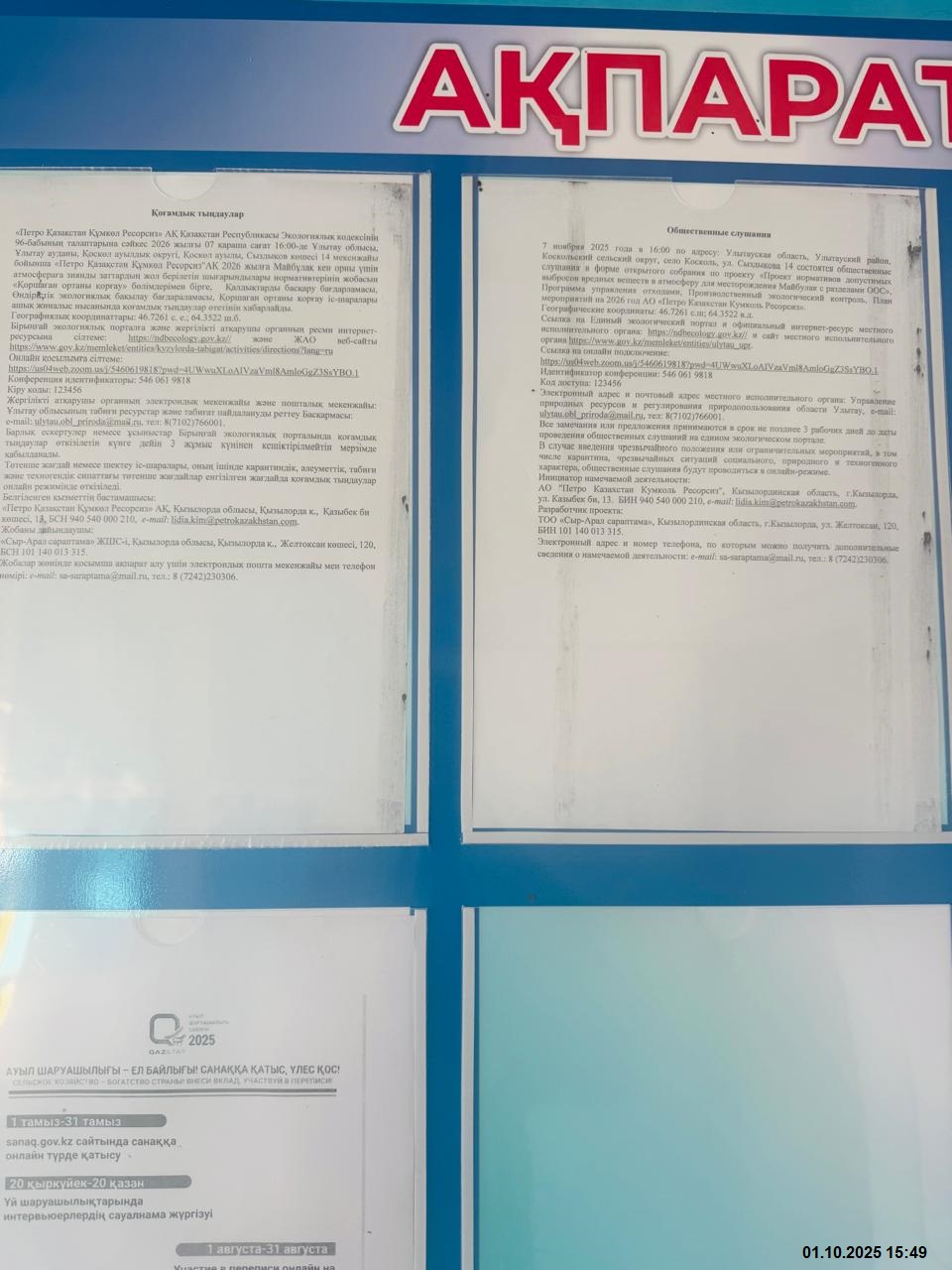 1.4. Описание для подключения к онлайн трансляции при прохождении общественного слушания: в соответствии с пп.4, п.11 прил. 3 Правил, информация о проведении общественных слушаний должна быть распространена на государственном и русском языках на досках объявлений местных исполнительных органов административно-территориальных единиц и в местах, специально предназначенных для размещения объявлений. В связи с чем необходимо дополнительно разместить печатные объявления на досках объявлений в акимате и в местах, специально предназначенных для размещения объявлений.