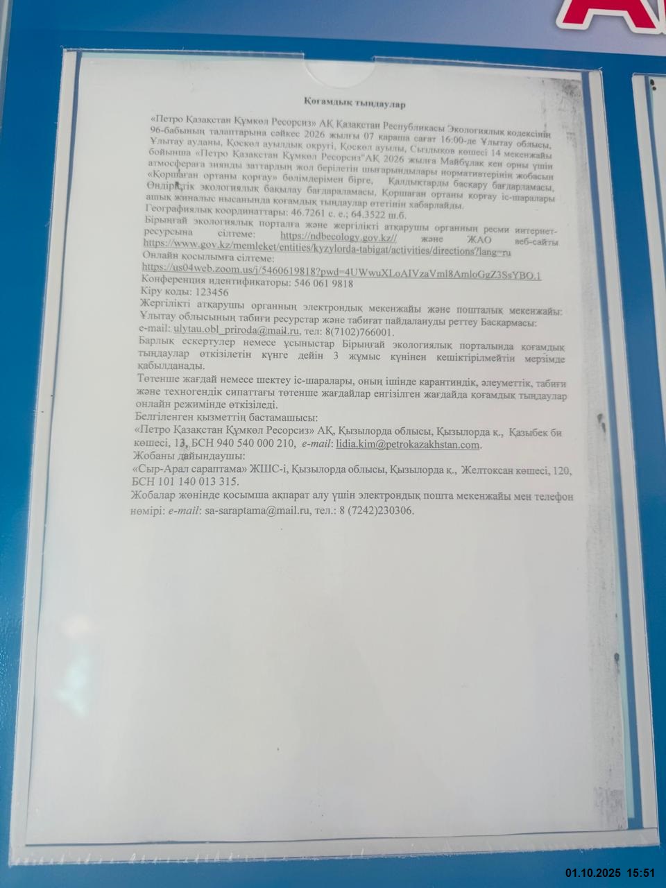 3. Общественные слушания организованны: Главный специалист УПР и ПР область Ұлытау, ulytau.obl_priroda@mail.ru,