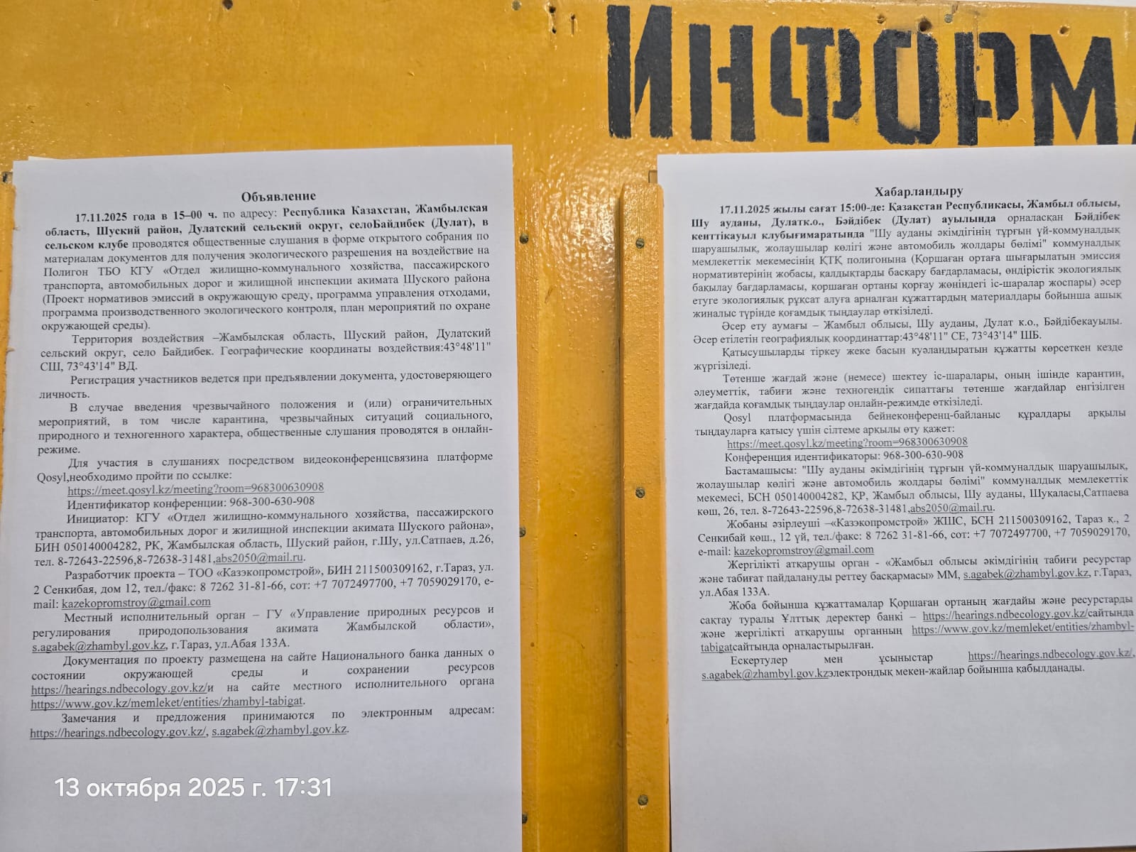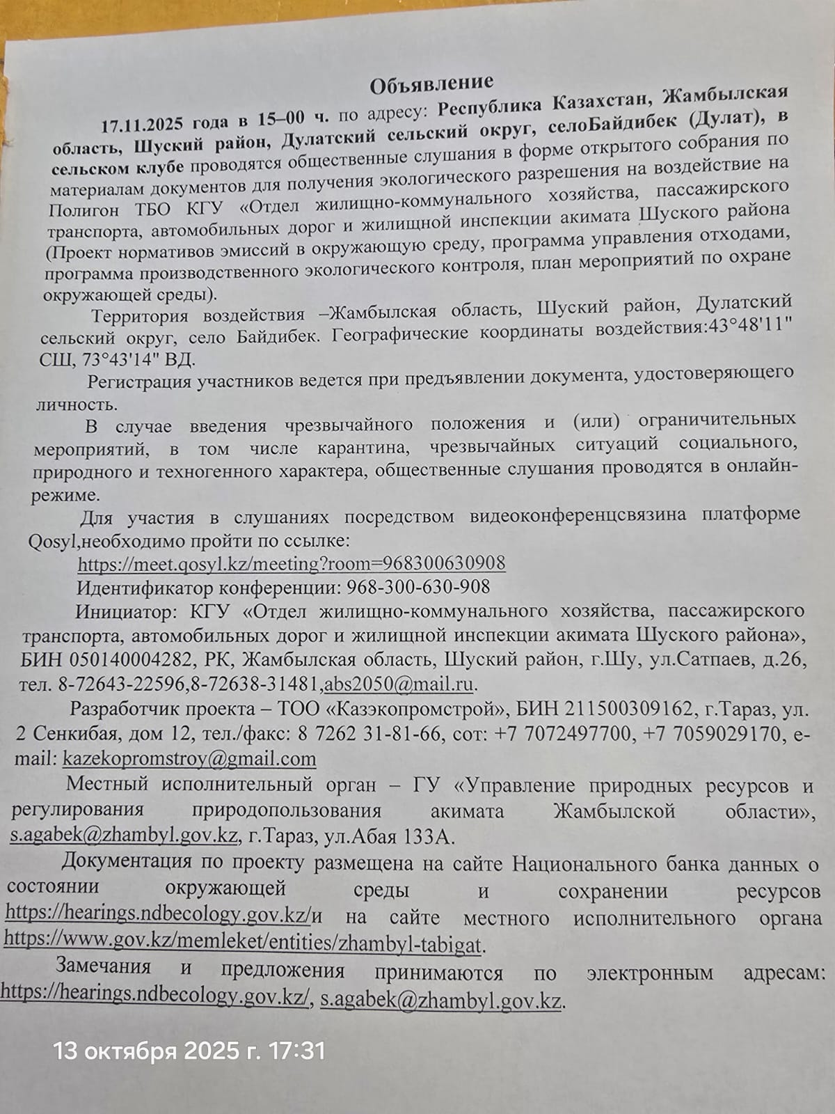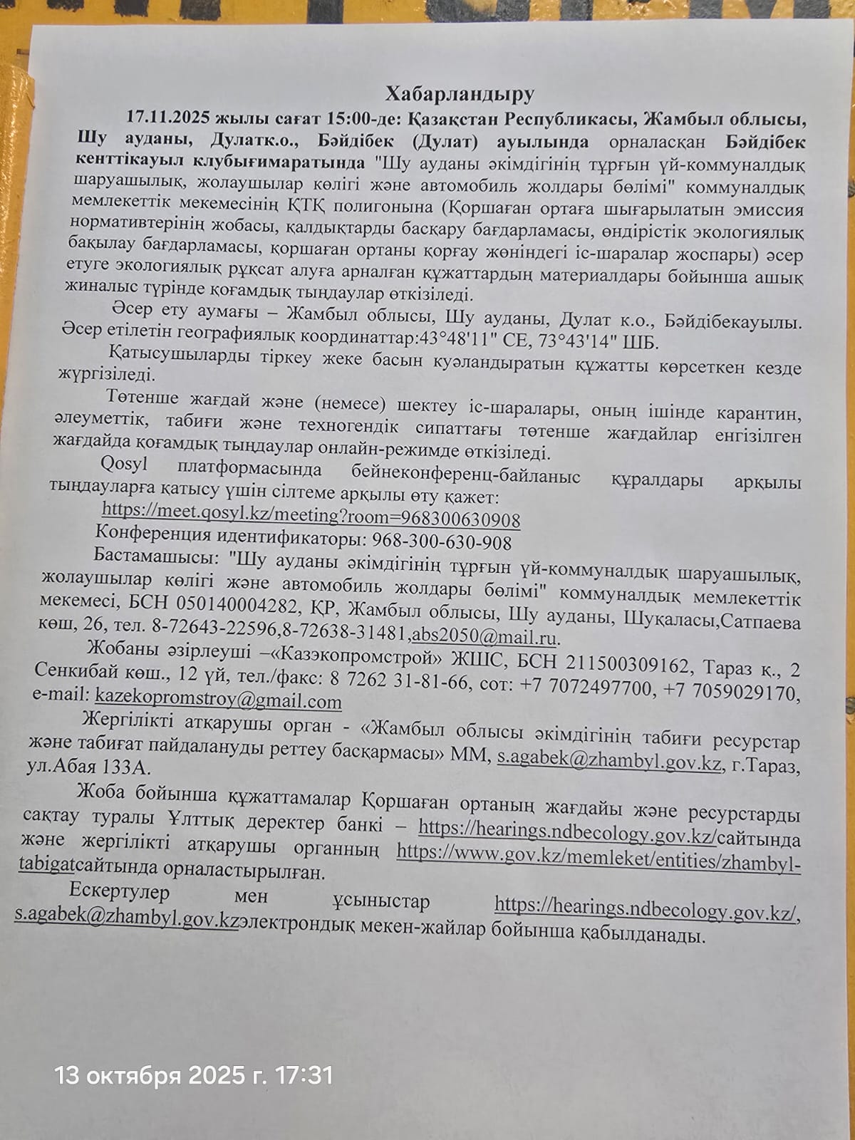1.4. Описание для подключения к онлайн трансляции при прохождении общественного слушания: Приглашение на запланированную встречу в Qosyl Тема встречи: ""Жамбыл облысы Шу ауданы әкімдігінің тұрғын үй-коммуналдық шаруашылығы, жолаушылар көлігі және автомобиль жолдары бөлімі"" коммун Время встречи: 17.11.2025 15:00 Длительность встречи: 01 час. Идентификатор встречи: 968-300-630-908 Подключиться к встрече в Qosyl: https://meet.qosyl.kz/meeting?room=968300630908
