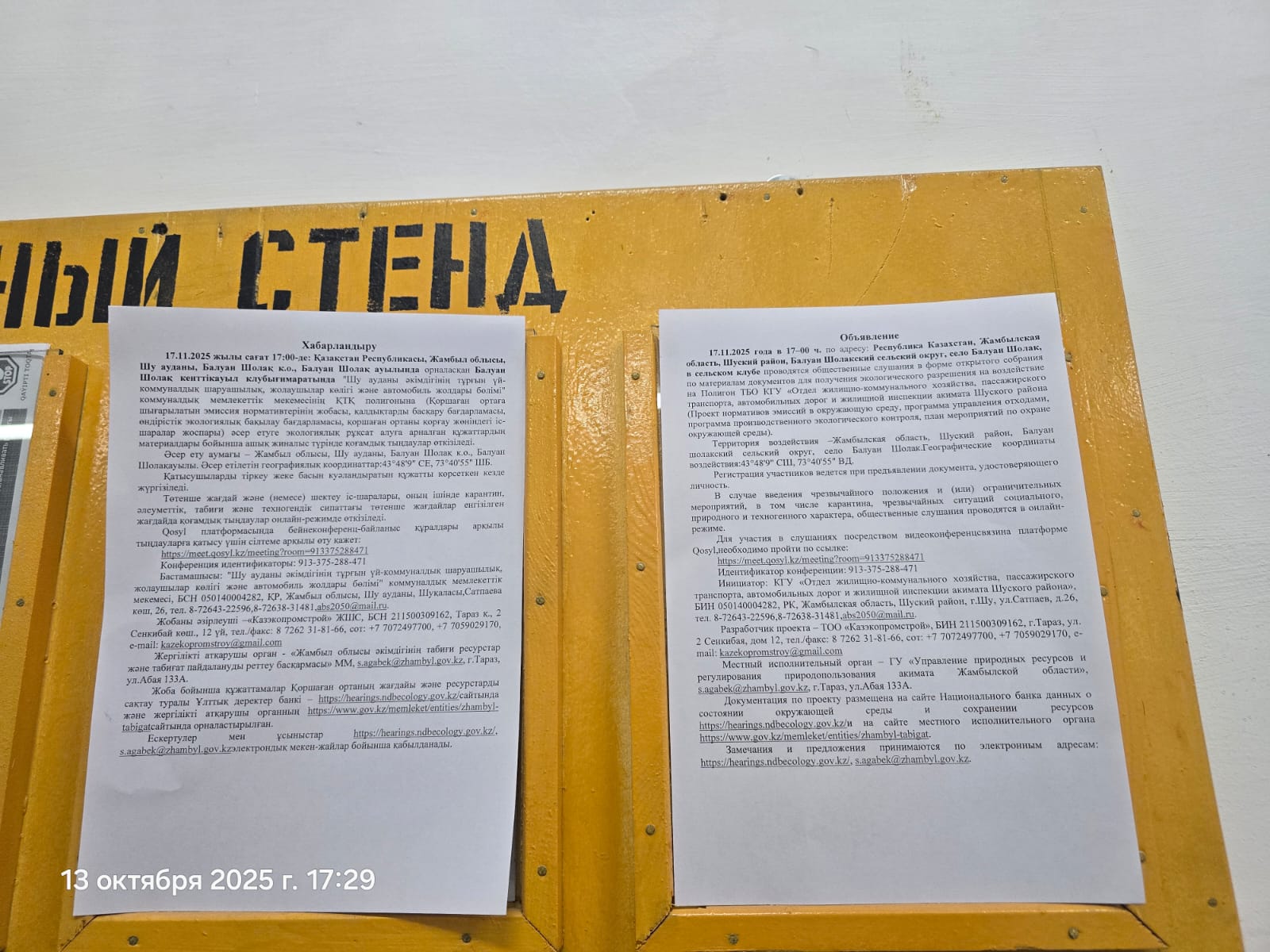 3. Общественные слушания организованны: Управление природных ресурсов и регулирования природопользования Жамбылской области, s.agabek@zhambyl.gov.kz,