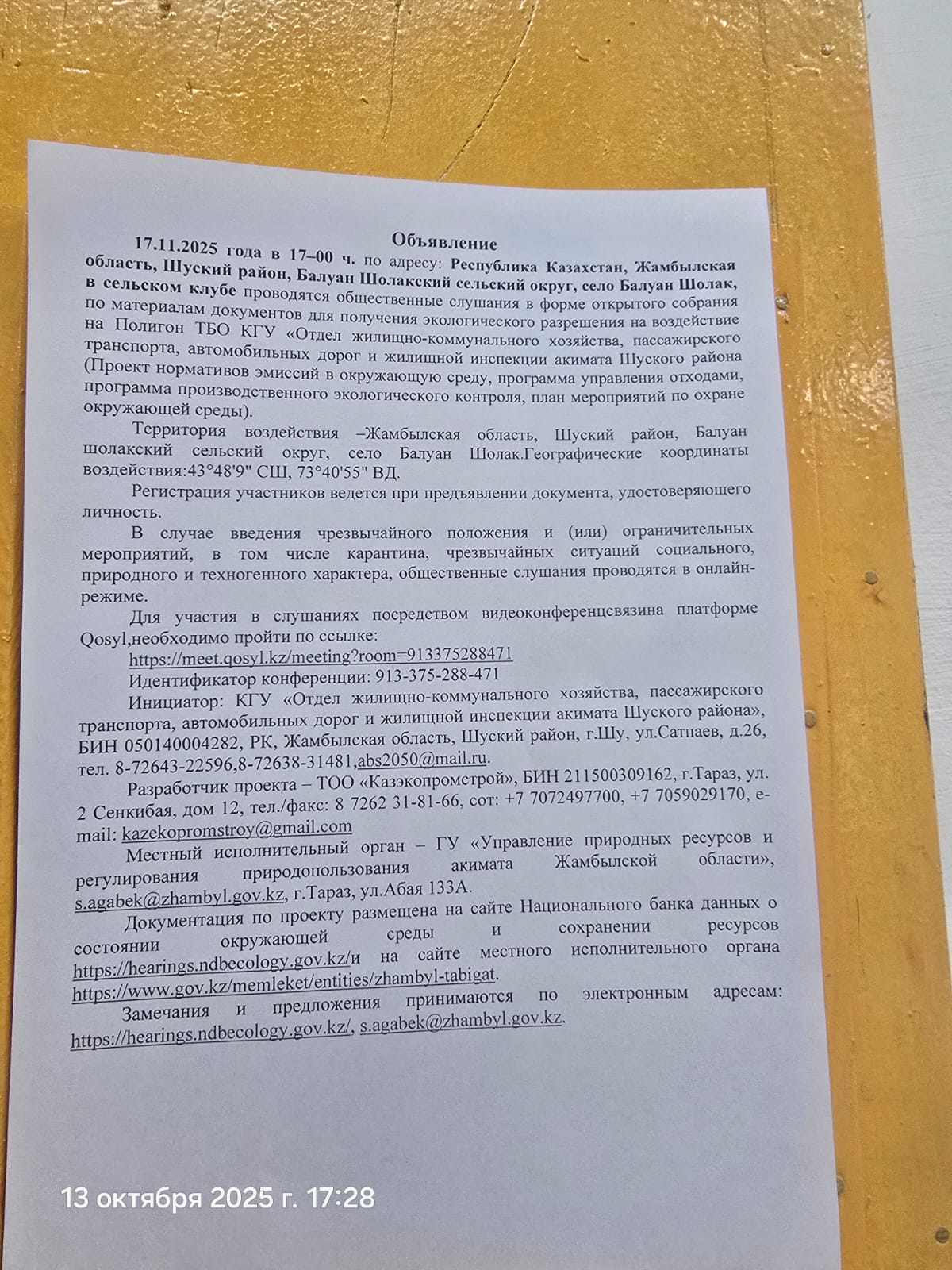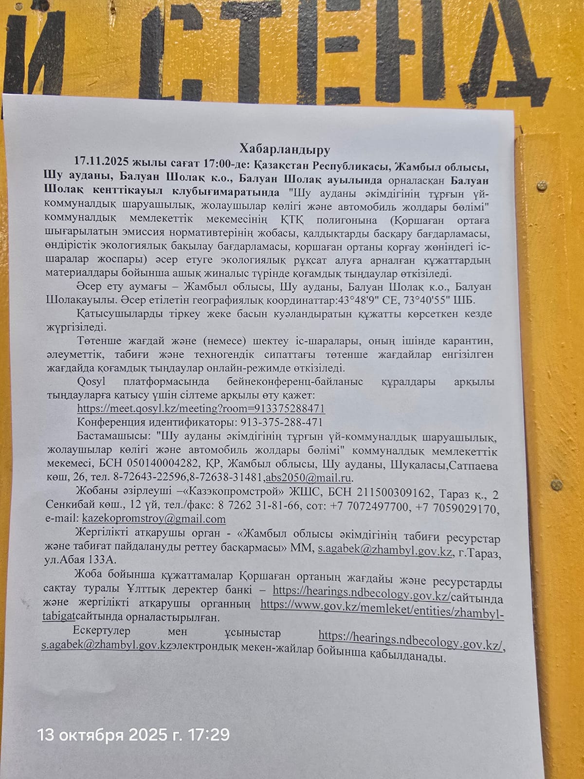 1.4. Описание для подключения к онлайн трансляции при прохождении общественного слушания: Приглашение на запланированную встречу в Qosyl Тема встречи: ""Жамбыл облысы Шу ауданы әкімдігінің тұрғын үй-коммуналдық шаруашылығы, жолаушылар көлігі және автомобиль жолдары бөлімі"" коммун Время встречи: 17.11.2026 17:00 Длительность встречи: 01 час. Идентификатор встречи: 913-375-288-471 Подключиться к встрече в Qosyl: https://meet.qosyl.kz/meeting?room=913375288471
