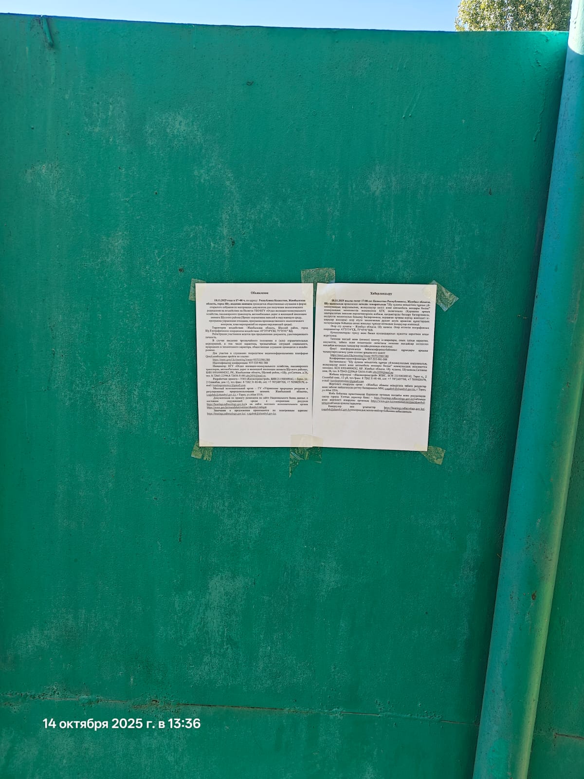 6.3. расположение мест, специально предназначенных для Размещения печатных объявлений (доски объявлений): Жамбылская область, Шуский район, Шуская г.а., г.Шу, доска объявлений