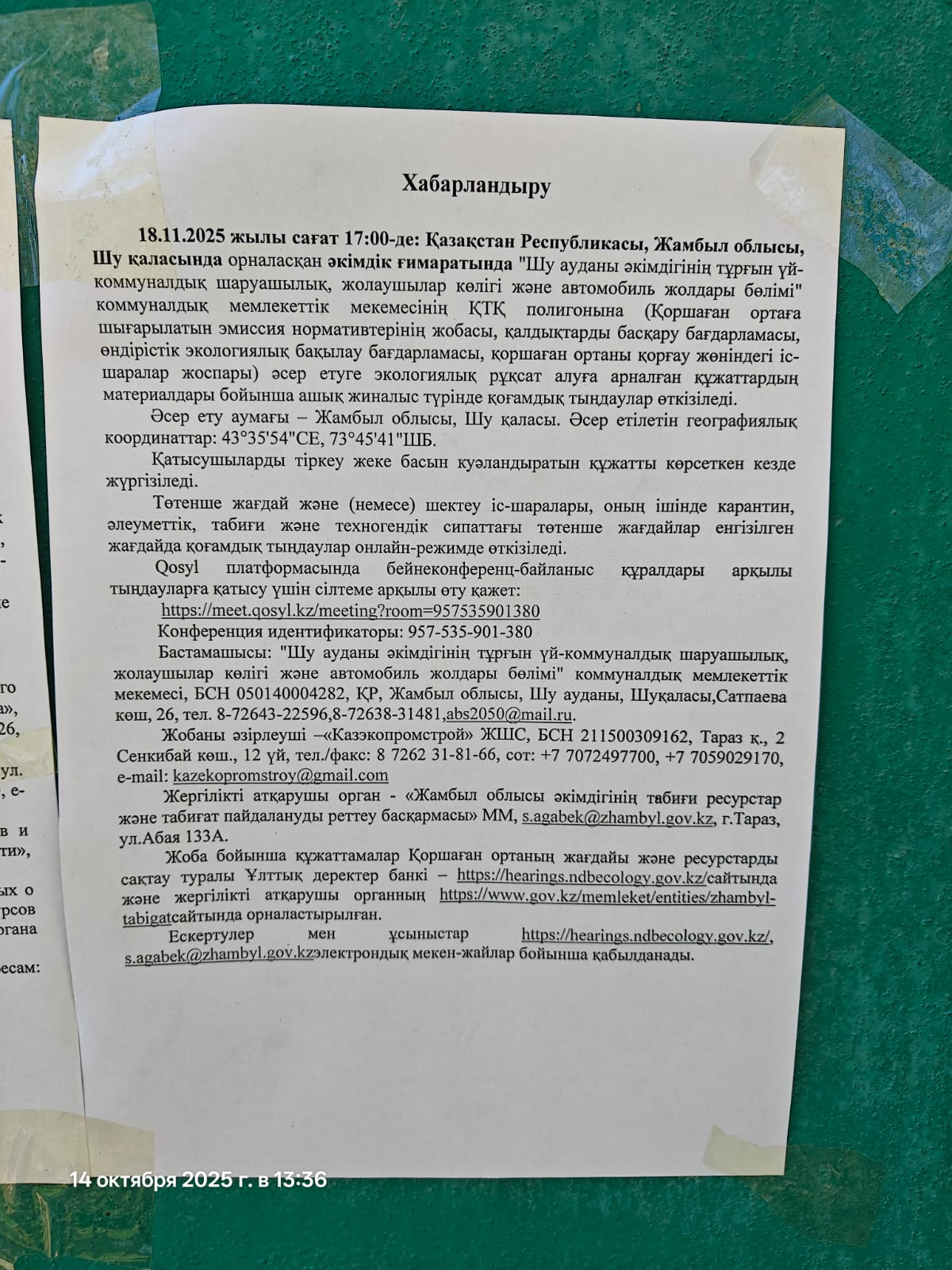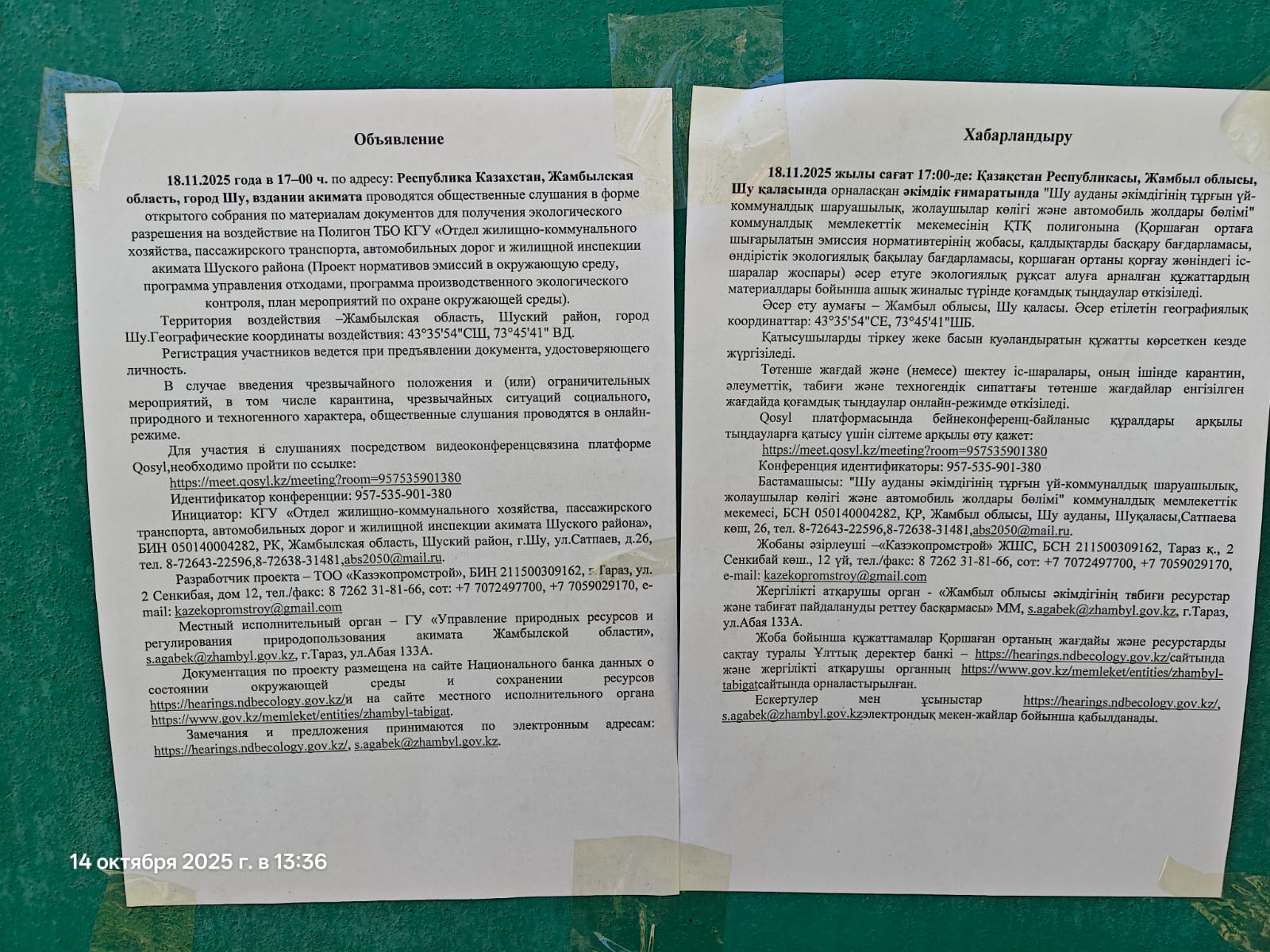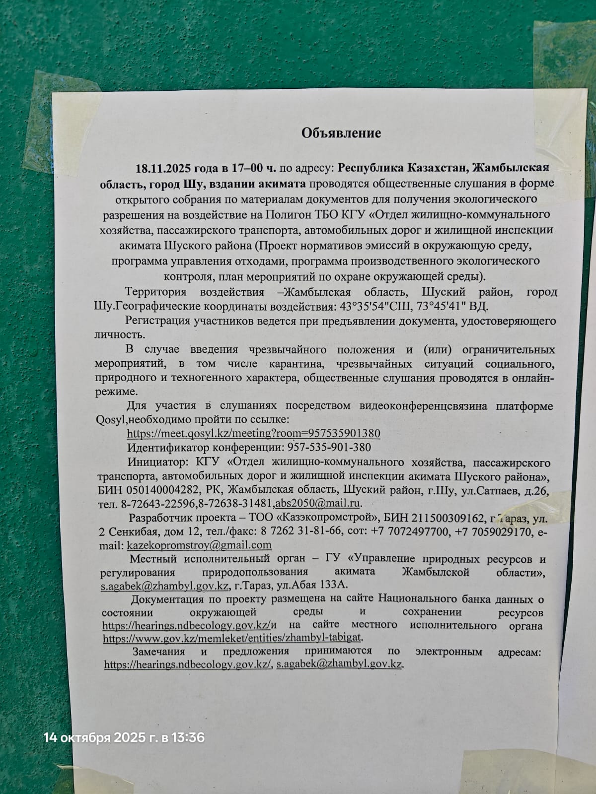 1.4. Описание для подключения к онлайн трансляции при прохождении общественного слушания: Приглашение на запланированную встречу в Qosyl Тема встречи: ""Жамбыл облысы Шу ауданы әкімдігінің тұрғын үй-коммуналдық шаруашылығы, жолаушылар көлігі және автомобиль жолдары бөлімі"" комму Время встречи: 18.11.2025 17:00 Длительность встречи: 01 час. Идентификатор встречи: 957-535-901-380 Подключиться к встрече в Qosyl: https://meet.qosyl.kz/meeting?room=957535901380