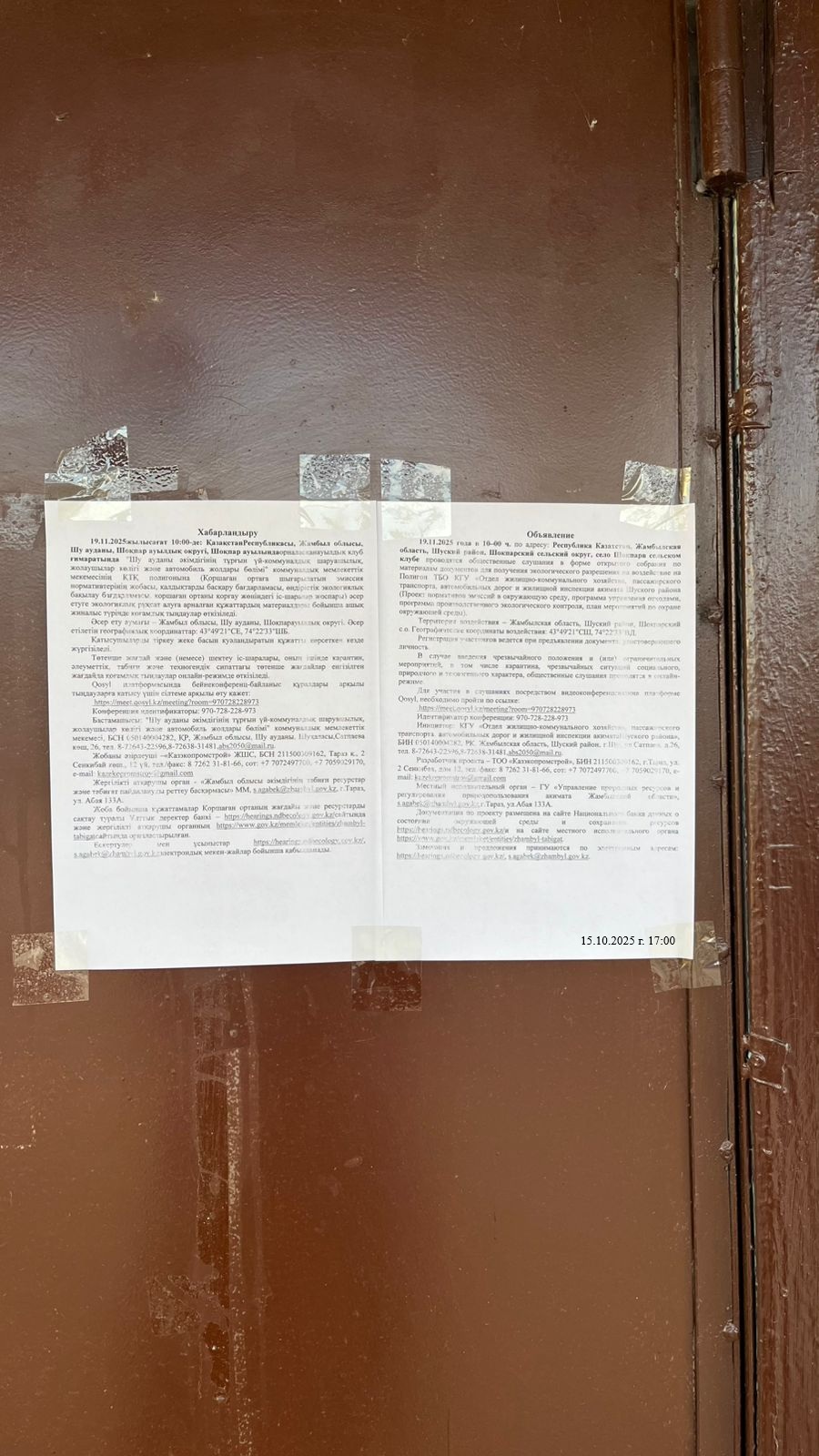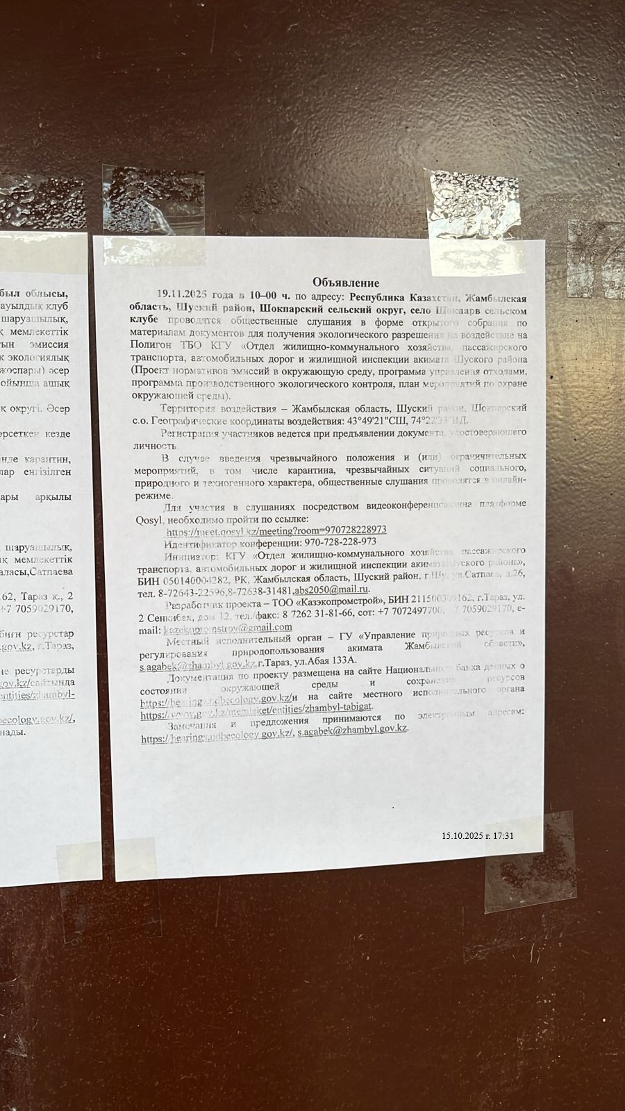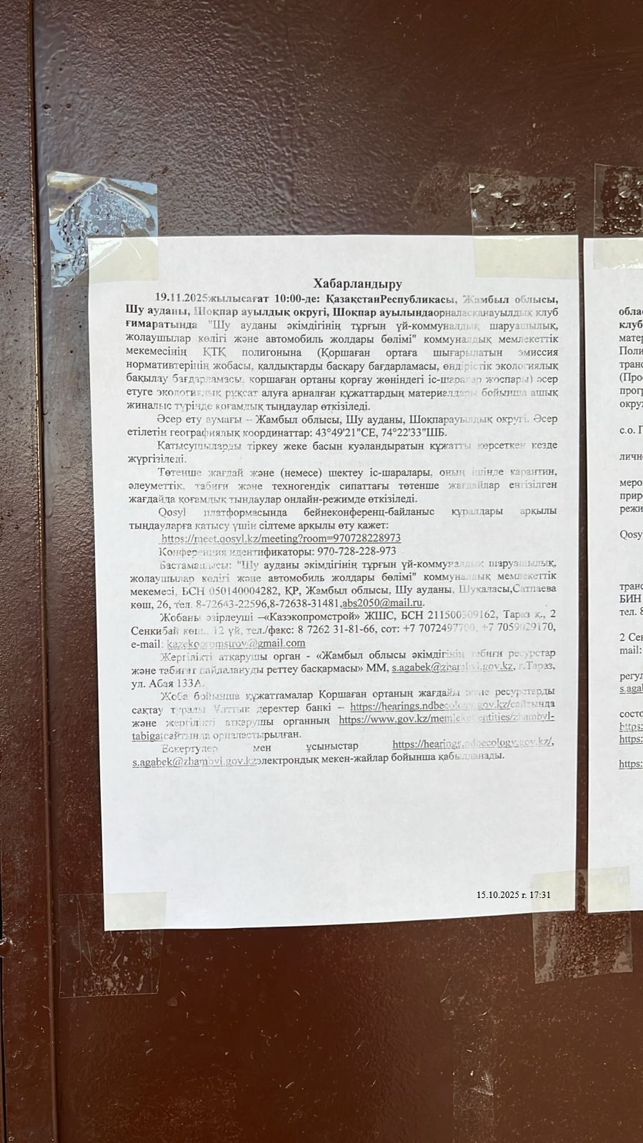 3. Общественные слушания организованны: Управление природных ресурсов и регулирования природопользования Жамбылской области, s.agabek@zhambyl.gov.kz,