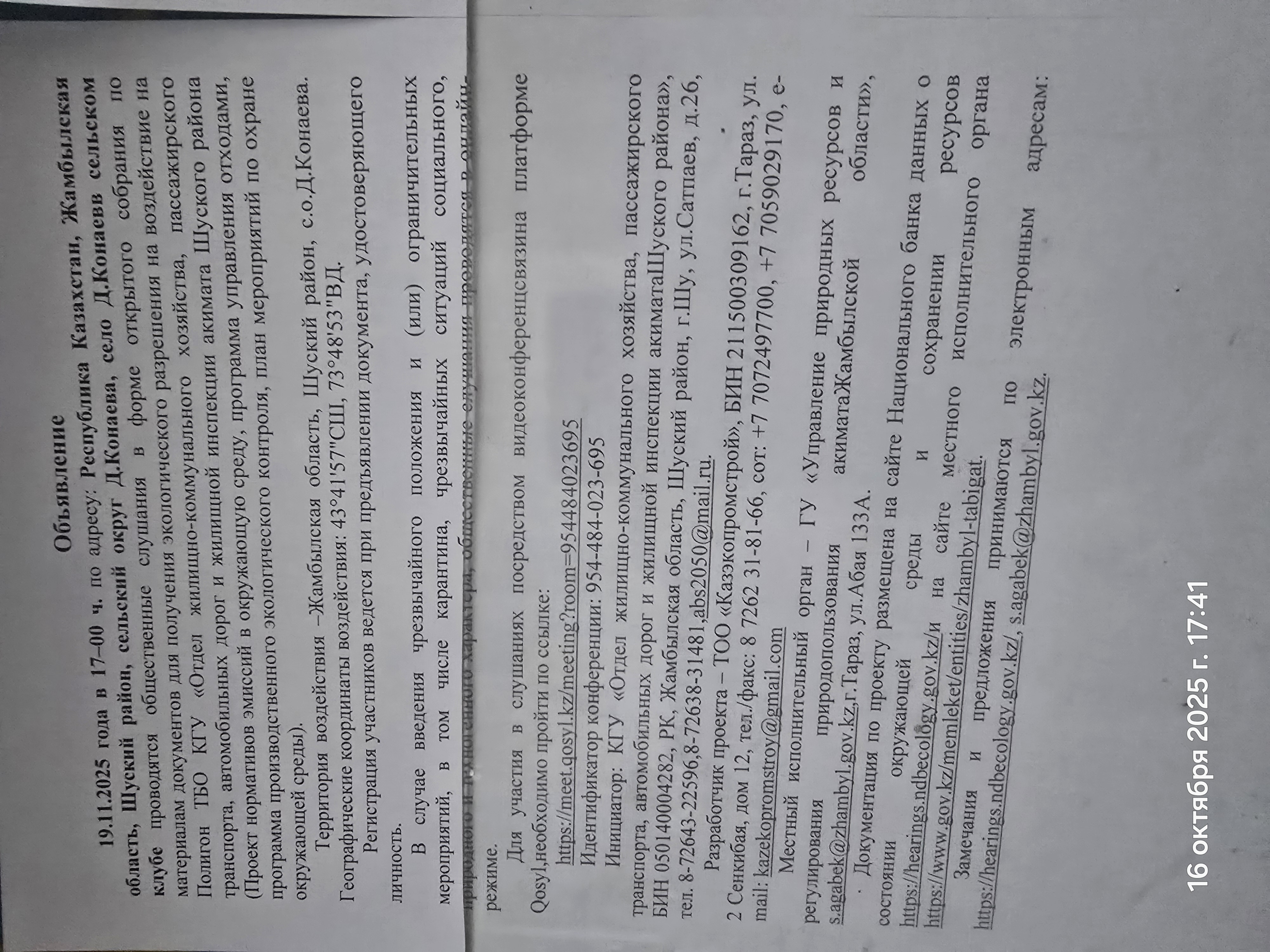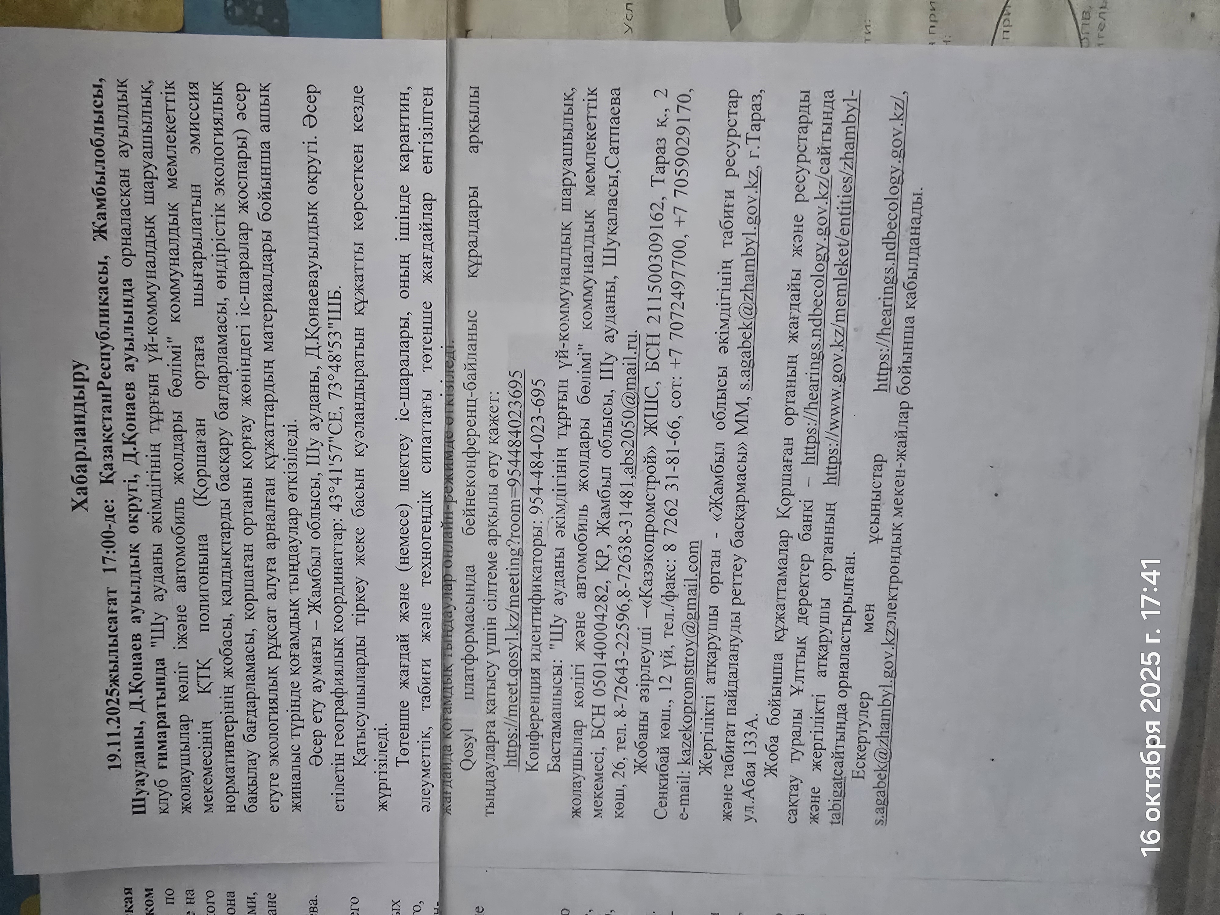 1.4. Описание для подключения к онлайн трансляции при прохождении общественного слушания: Приглашение на запланированную встречу в Qosyl Тема встречи: ""Жамбыл облысы Шу ауданы әкімдігінің тұрғын үй-коммуналдық шаруашылығы, жолаушылар көлігі және автомобиль жолдары бөлімі"" коммун Время встречи: 19.11.2025 17:00 Длительность встречи: 01 час. Идентификатор встречи: 954-484-023-695 Подключиться к встрече в Qosyl: https://meet.qosyl.kz/meeting?room=954484023695