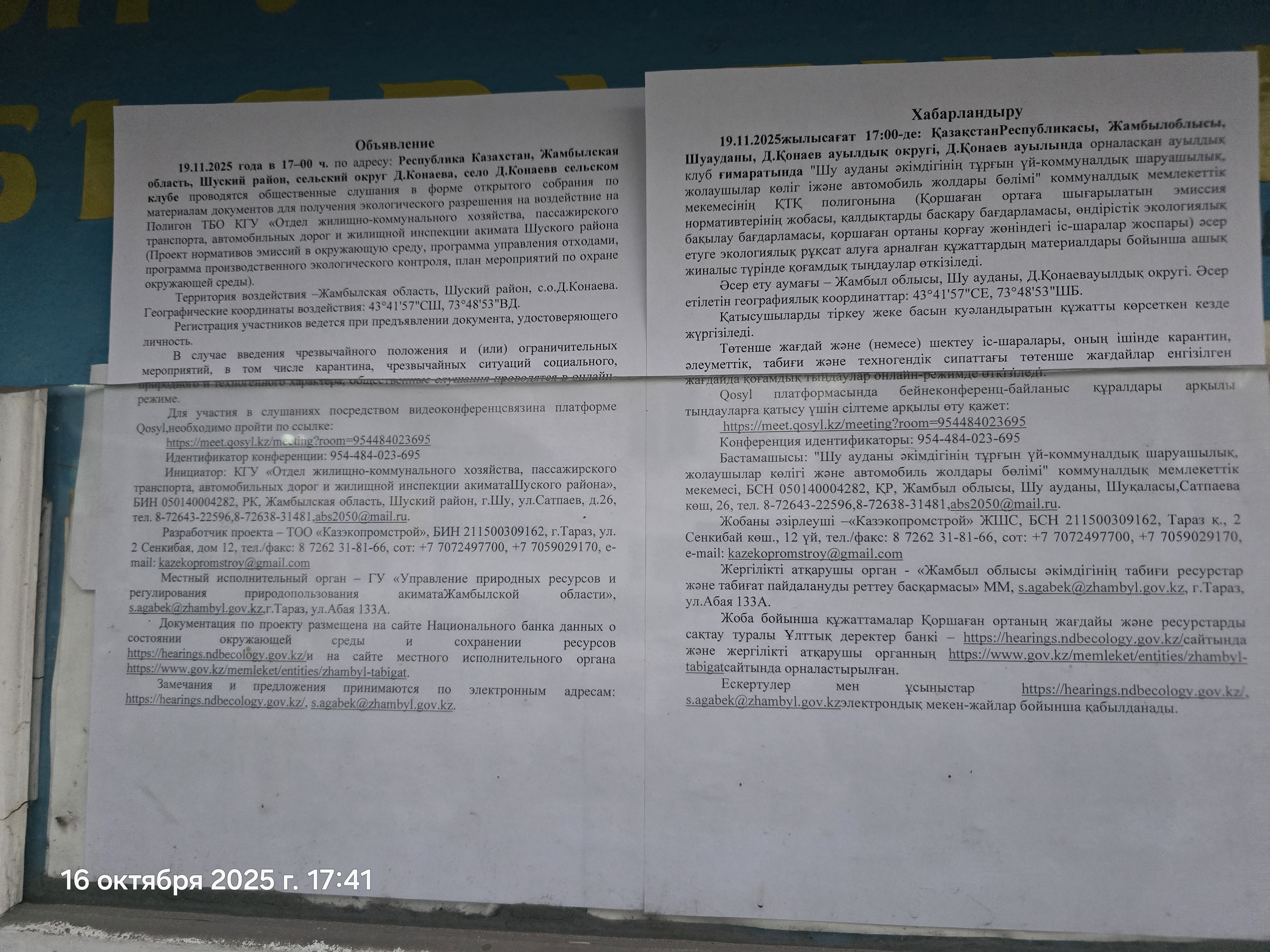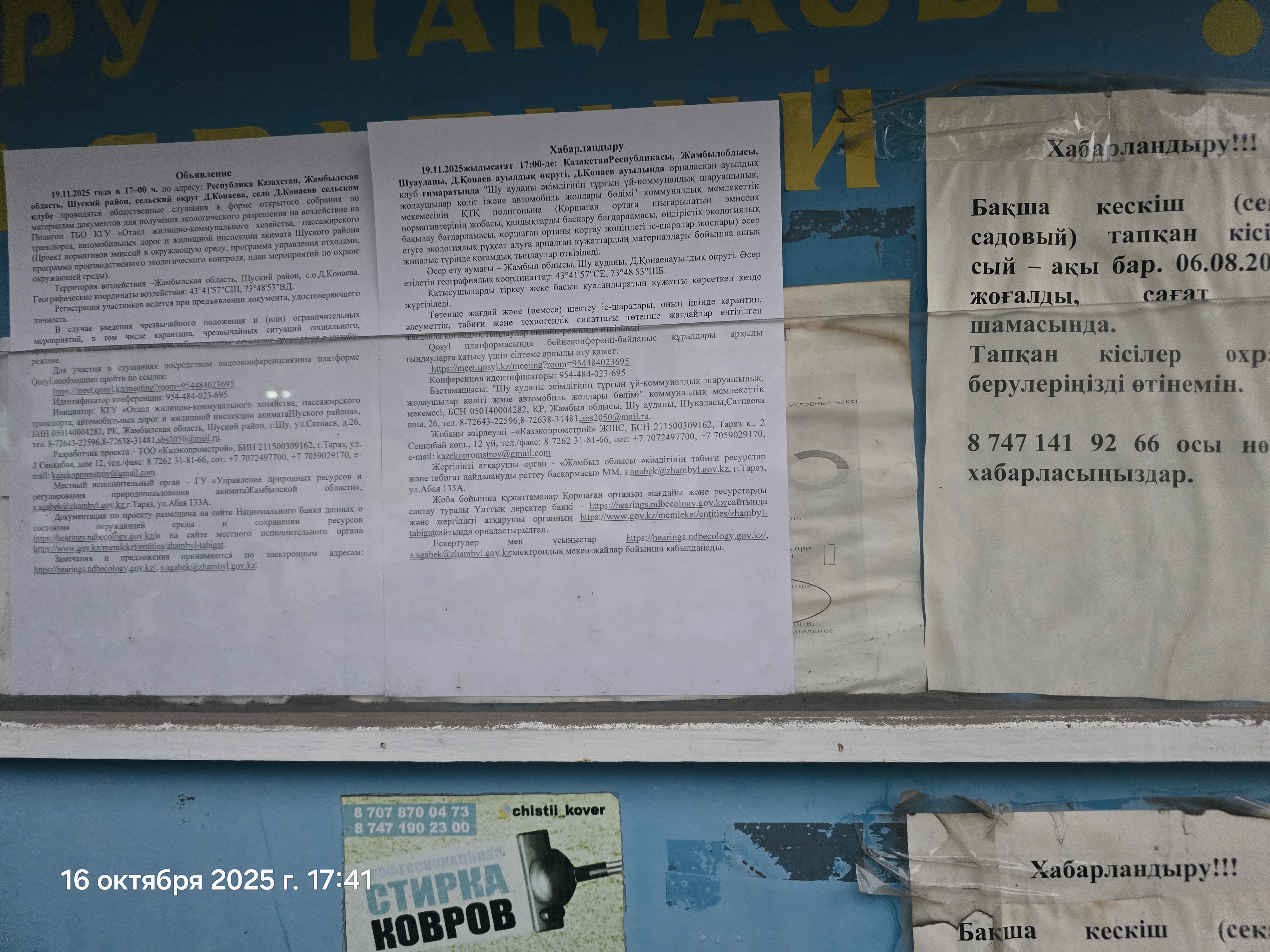 3. Общественные слушания организованны: Управление природных ресурсов и регулирования природопользования Жамбылской области, s.agabek@zhambyl.gov.kz,