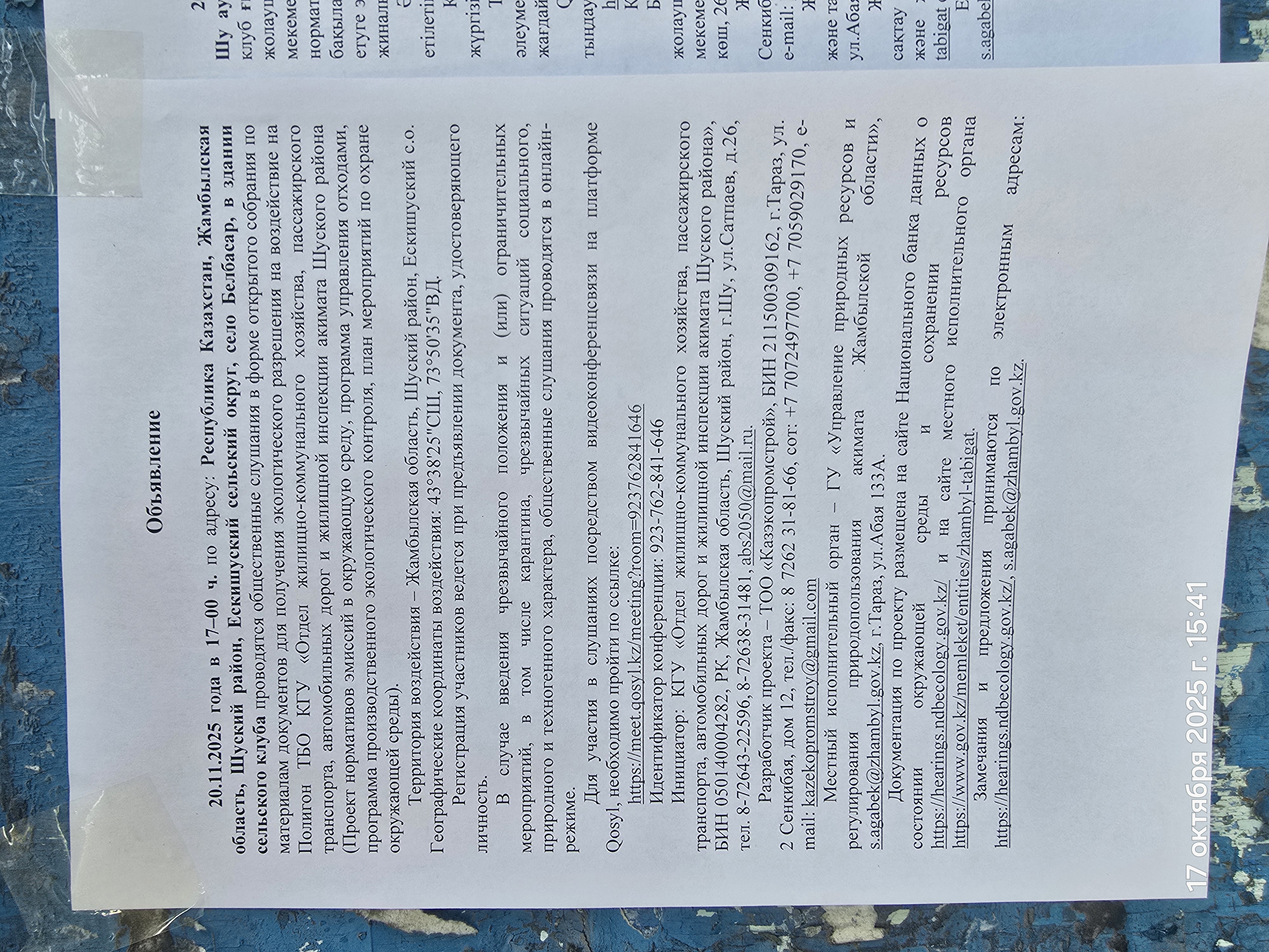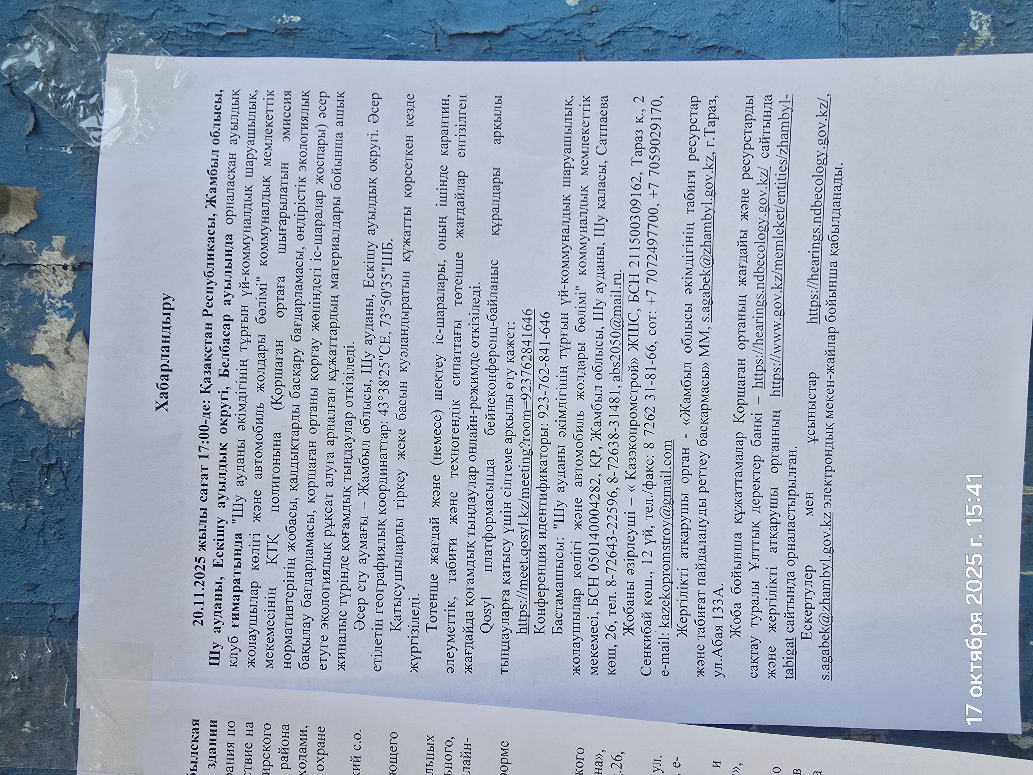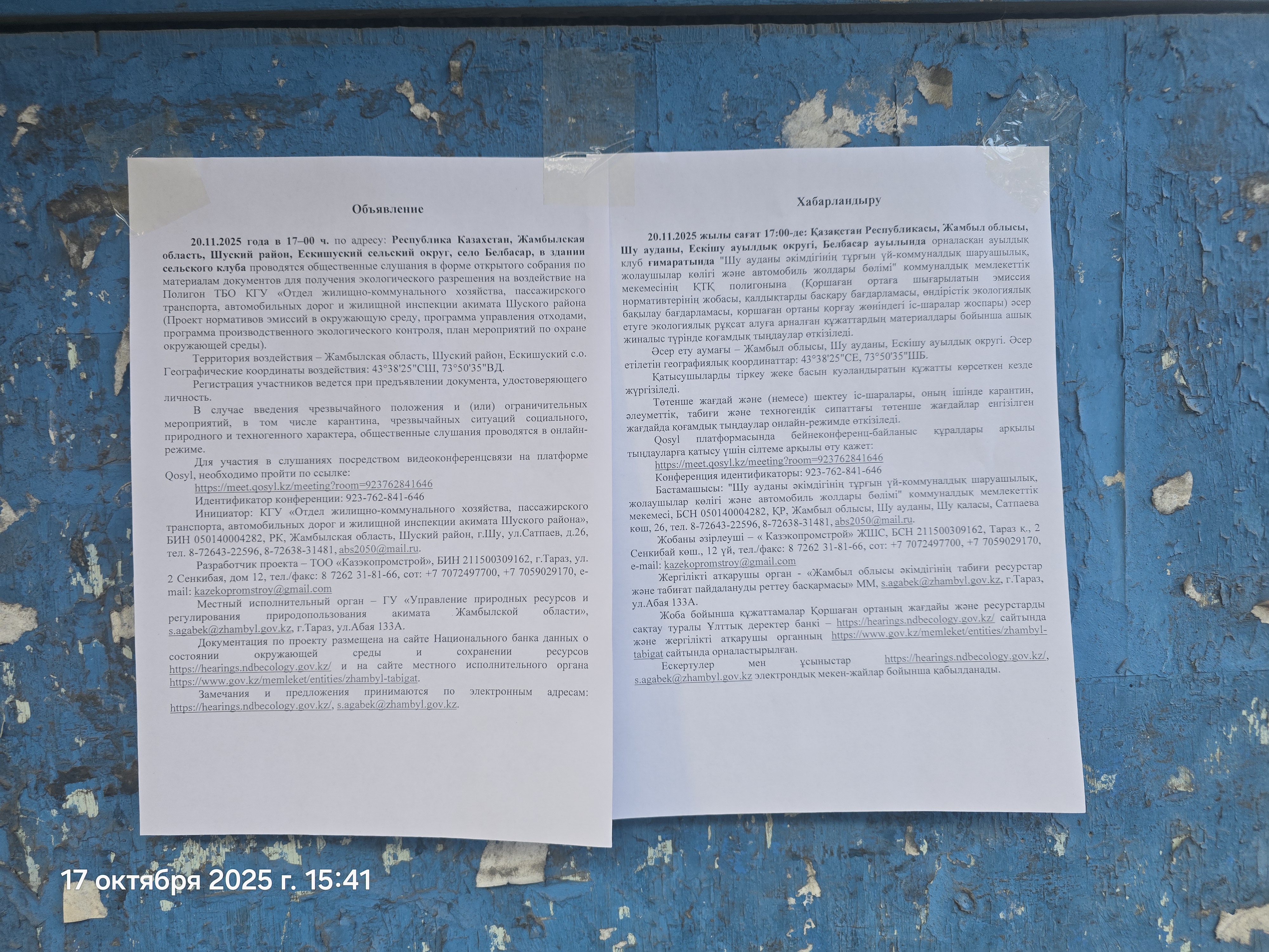 3. Общественные слушания организованны: Управление природных ресурсов и регулирования природопользования Жамбылской области, s.agabek@zhambyl.gov.kz,