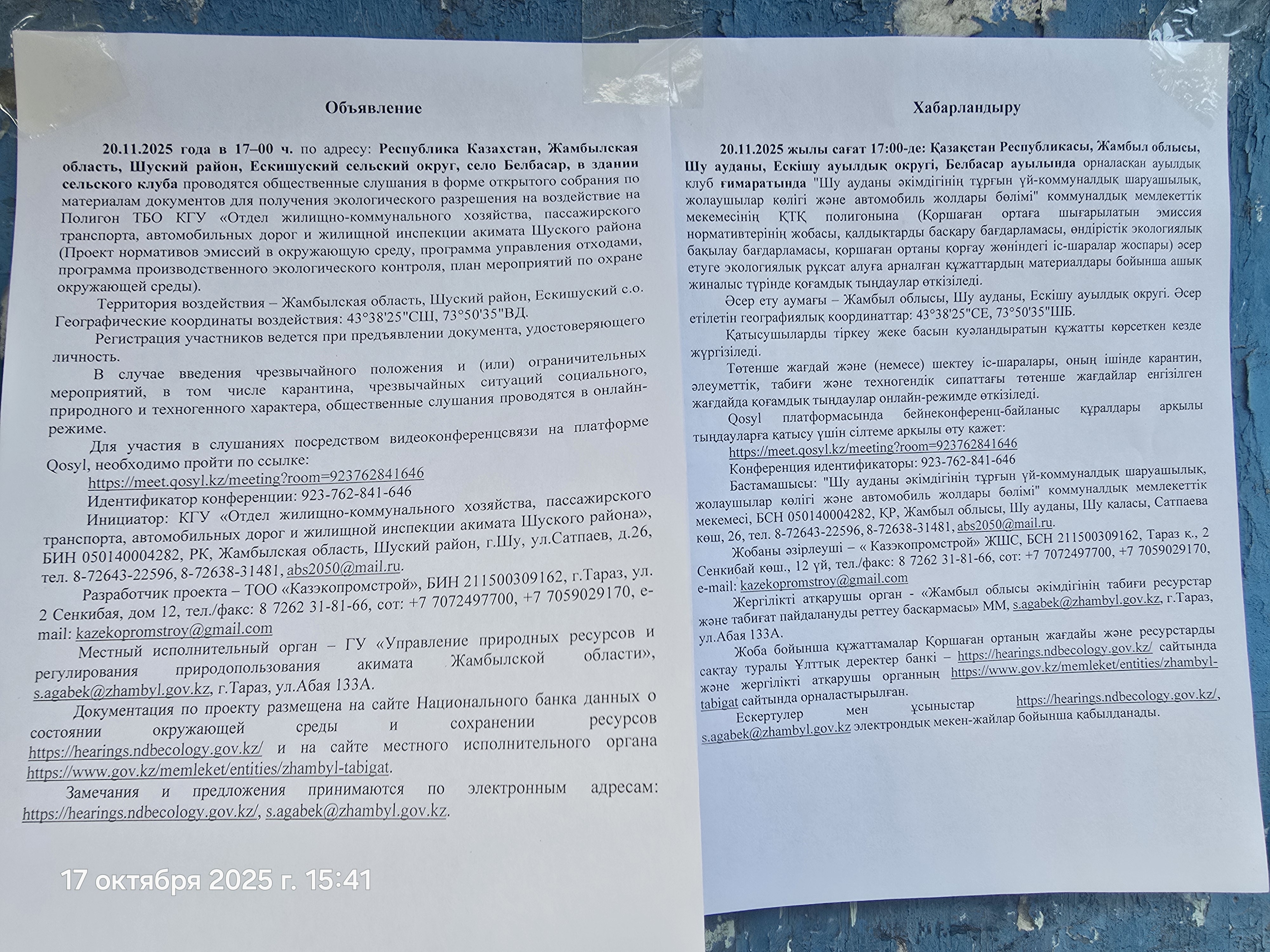 1.4. Описание для подключения к онлайн трансляции при прохождении общественного слушания: Приглашение на запланированную встречу в Qosyl Тема встречи: ""Жамбыл облысы Шу ауданы әкімдігінің тұрғын үй-коммуналдық шаруашылығы, жолаушылар көлігі және автомобиль жолдары бөлімі"" коммун Время встречи: 20.11.2025 17:00 Длительность встречи: 01 час. Идентификатор встречи: 923-762-841-646 Подключиться к встрече в Qosyl: https://meet.qosyl.kz/meeting?room=923762841646